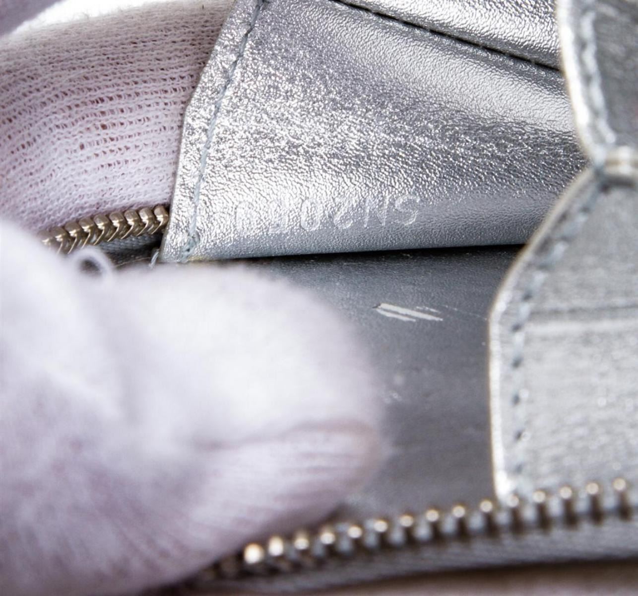 One Louis Vuitton Silver Vernis Monogram Flocon Snowflake Coin Purse Wallet. Silver metallic Monogram Vernis leather Louis Vuitton Flocon snowflake coin wallet. Zip around closure, silver-tone hardware, and silver metallic leather lining..