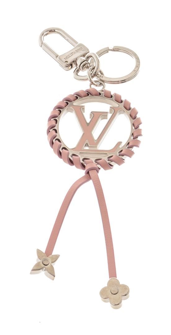 Louis Vuitton Silver-tone Pink Very Bag Charm and Key Holder features pink colored enamel, embellished with a matching leather braid ending in two Monogram Flower charms, and brass hardware with a silver-color finish
