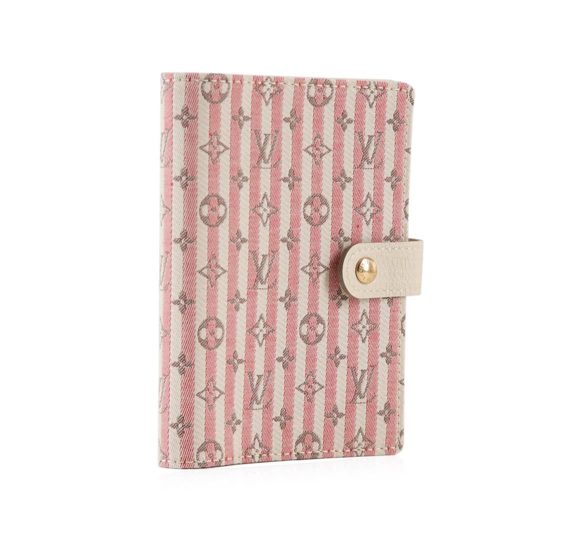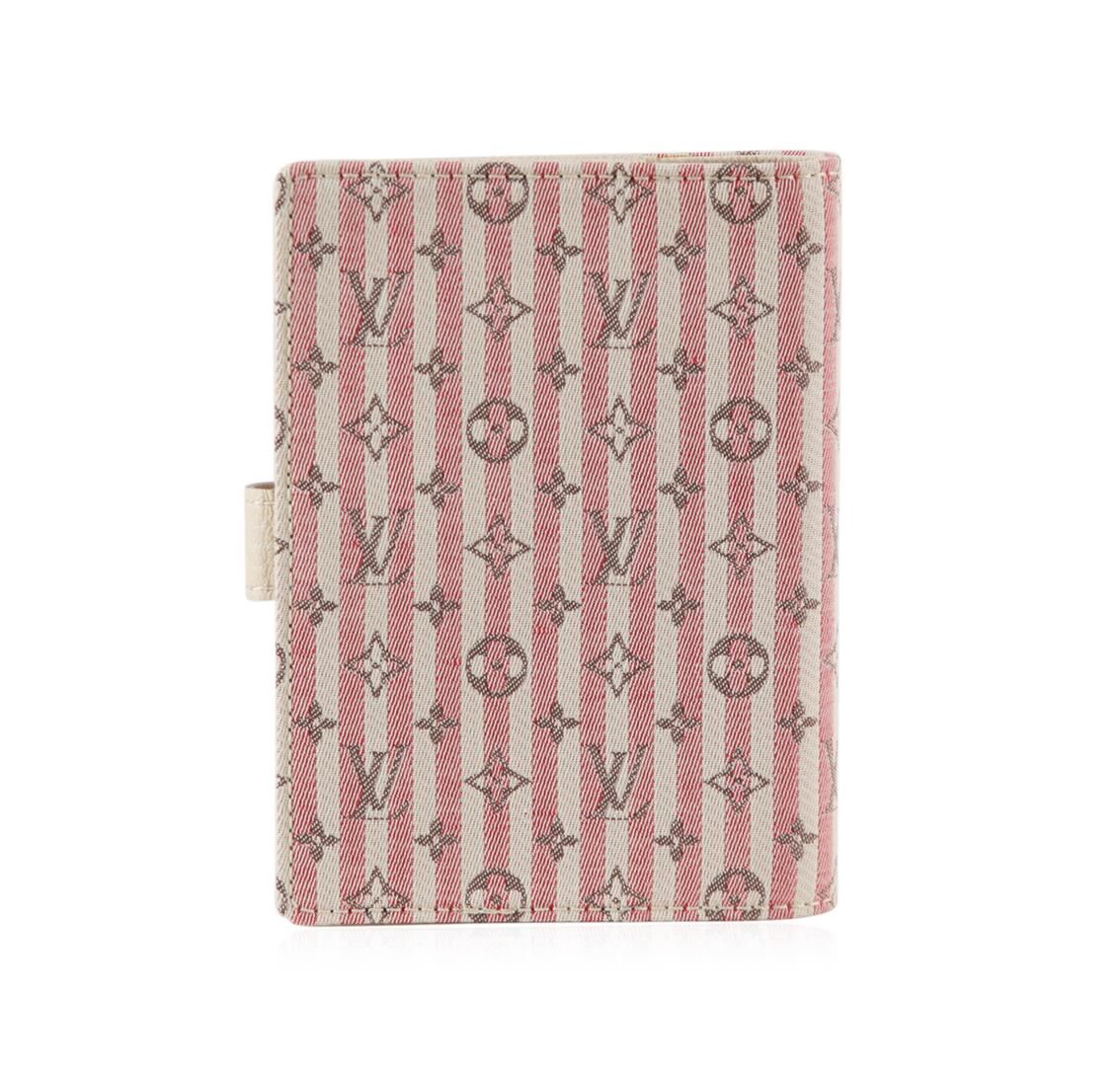 One Louis Vuitton red and white striped monogram small ring agenda cover in good condition, measuring approximately 5.75 inches tall and 4.25 inches wide. The agenda cover features two slots for storage and three slots for cards. Comes with a Louis Vuitton cover bag.