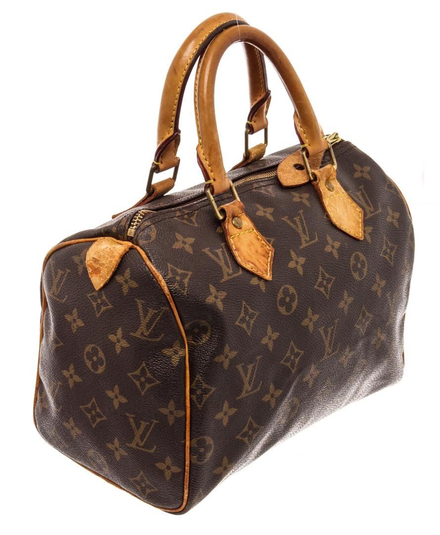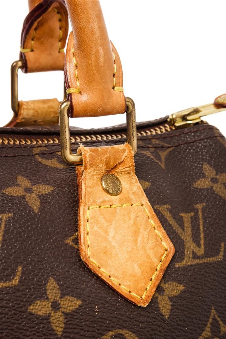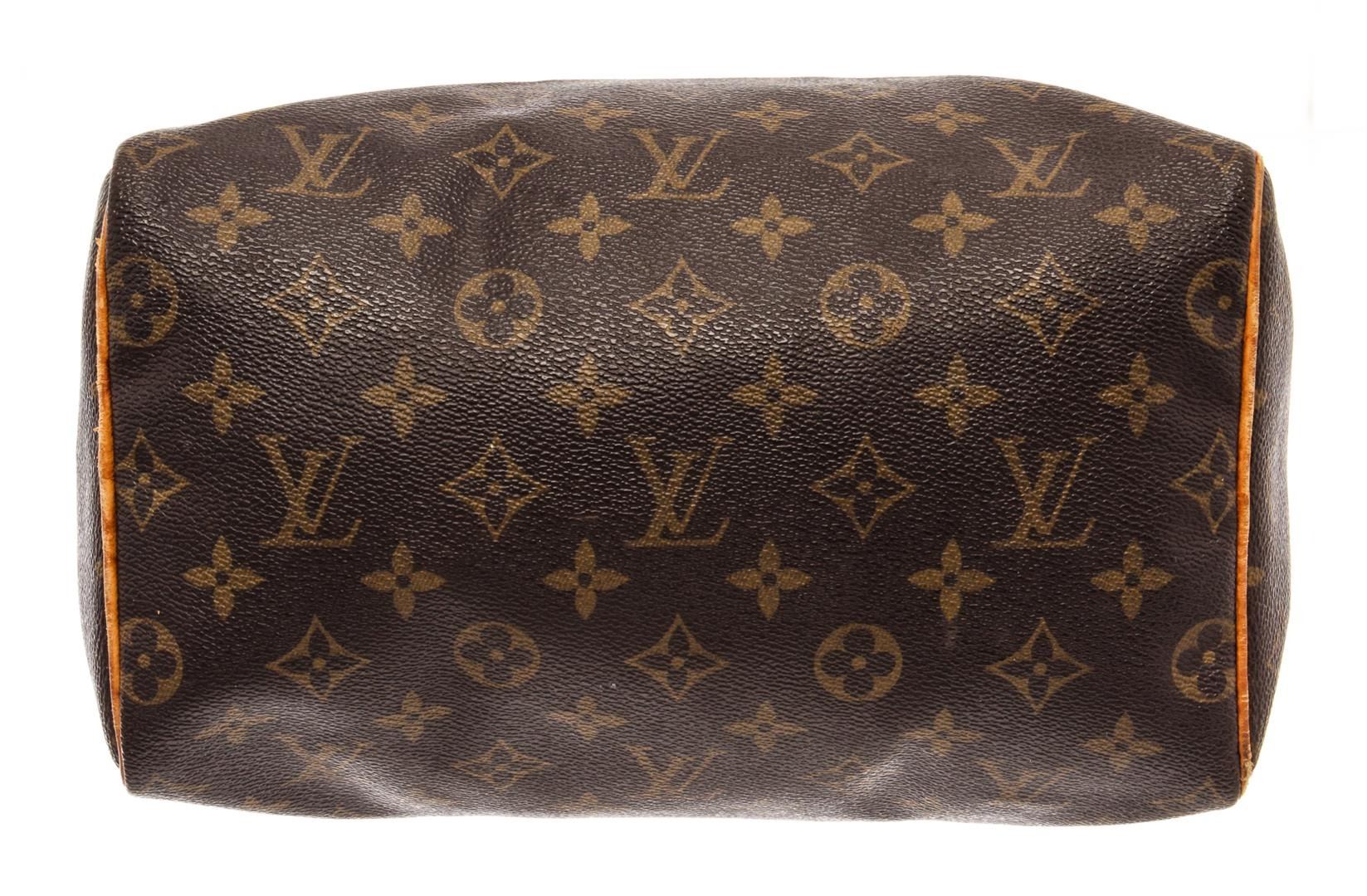 Louis Vuitton Speedy 25 Handbag Brown Monogram Coated Canvas. Brand: Louis Vuitton, Style: Speedy 25, Type: Handbag, Exterior Color: Brown Monogram, Exterior Material: Coated Canvas, Exterior Pockets: None, Interior Color: Brown, Interior Material: Canvas, Interior Pockets: 1 Slip, Closure: Zipper, Handle/Strap Type: Dual rolled leather, Length: 1N/A, Width: 5.75, Height: 7.5, Handle Drop: 3.25. Condition: Tarnished hardware, dry leather with watermarks, part of end tab missing. Item is sold AS-IS and all information pertaining to this lot is available in the photos or this description.