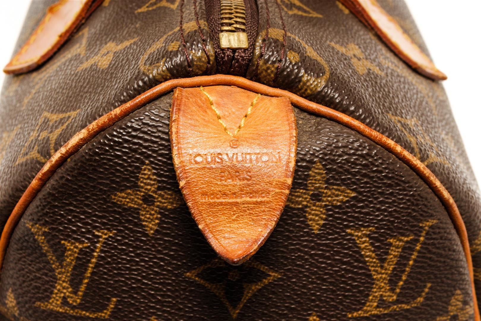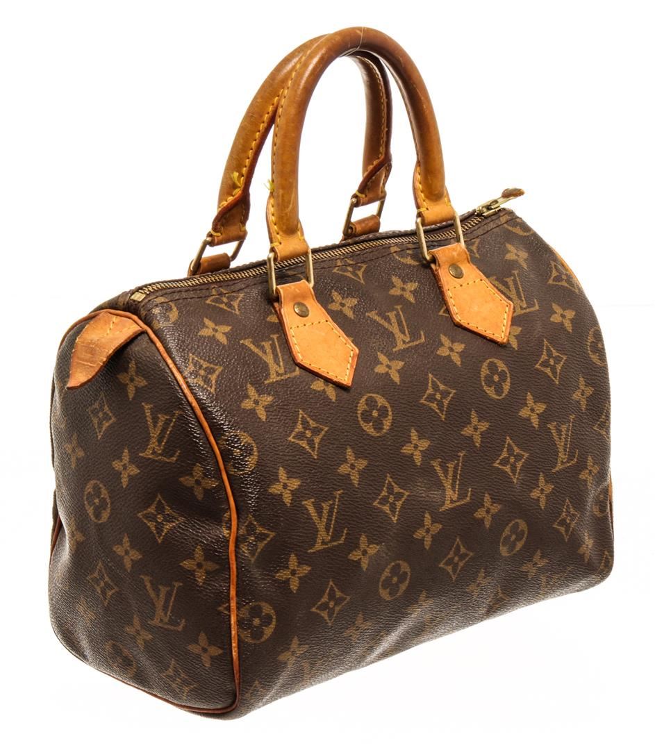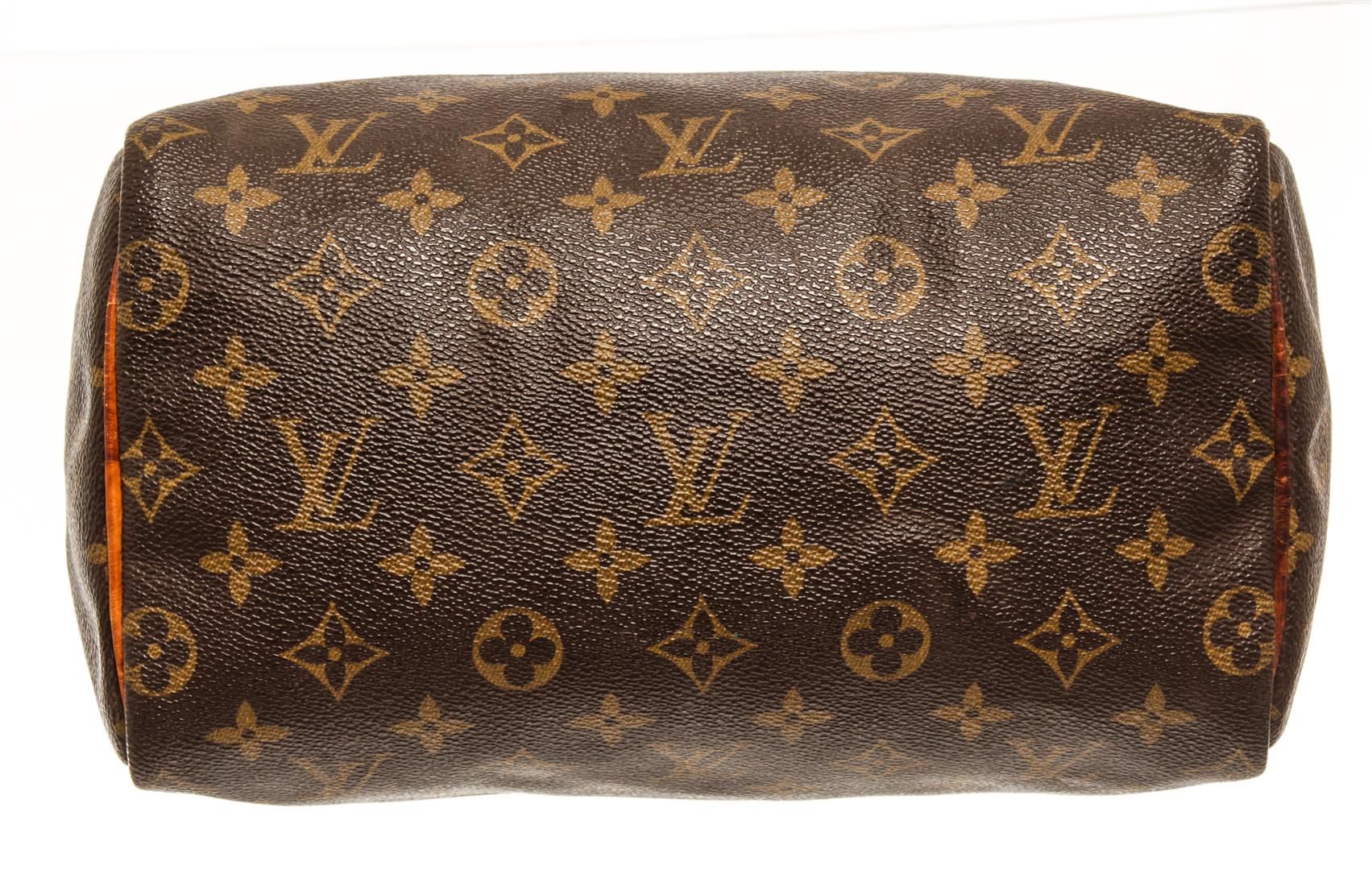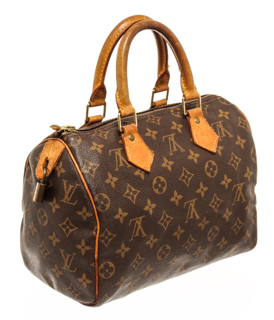 One Louis Vuitton Speedy 25 cm Handbag. Item is sold AS-IS. All available information is listed in the description and shown in the photo. Louis Vuitton Monogram Speedy 25 handbag with coated canvas exterior, brown fabric lining, contrasting vachetta leather trims and top handles, gold-tone hardware, zipper closure, and one main compartment with one slip pocket. There is some wear on the vachetta. Please refer to the photos!