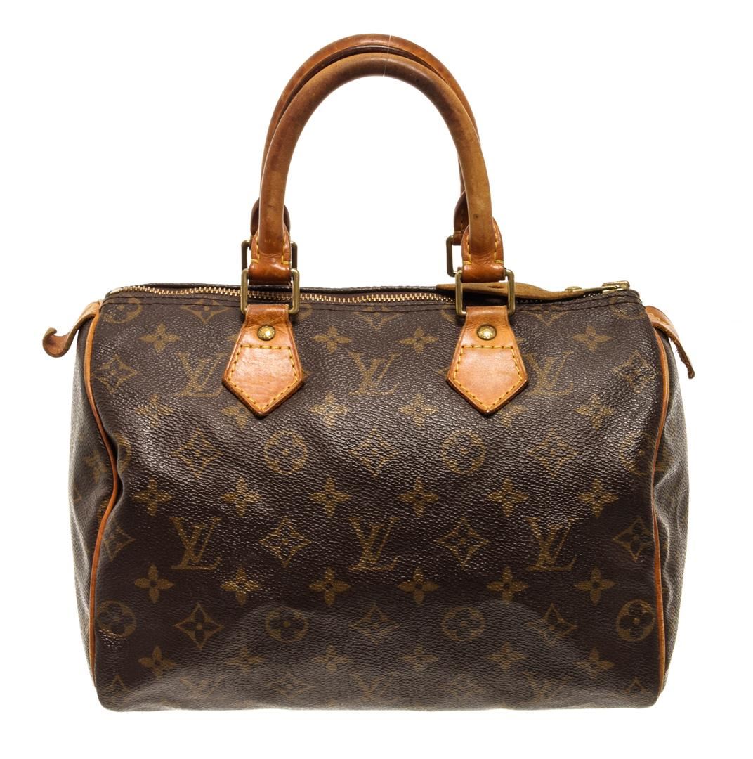 One Louis Vuitton Speedy 25 cm Handbag. Item is sold AS-IS. All available information is listed in the description and shown in the photo. Louis Vuitton Speedy 25 cm handbag with monogram coated canvas exterior, vanchetta leather top handles, brown fabric lining, one interior slip pocket, top zip closure, and gold-toned hardware.