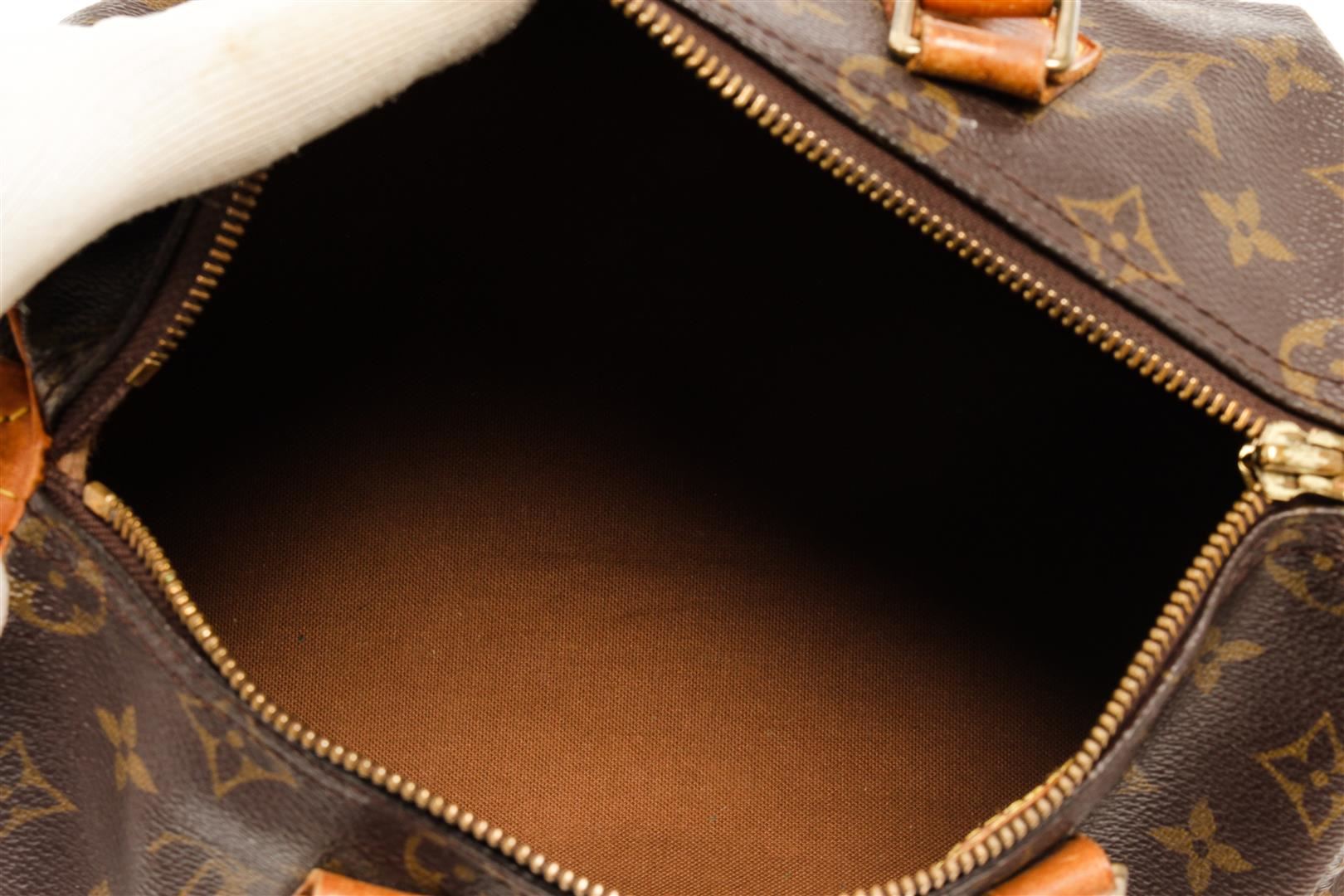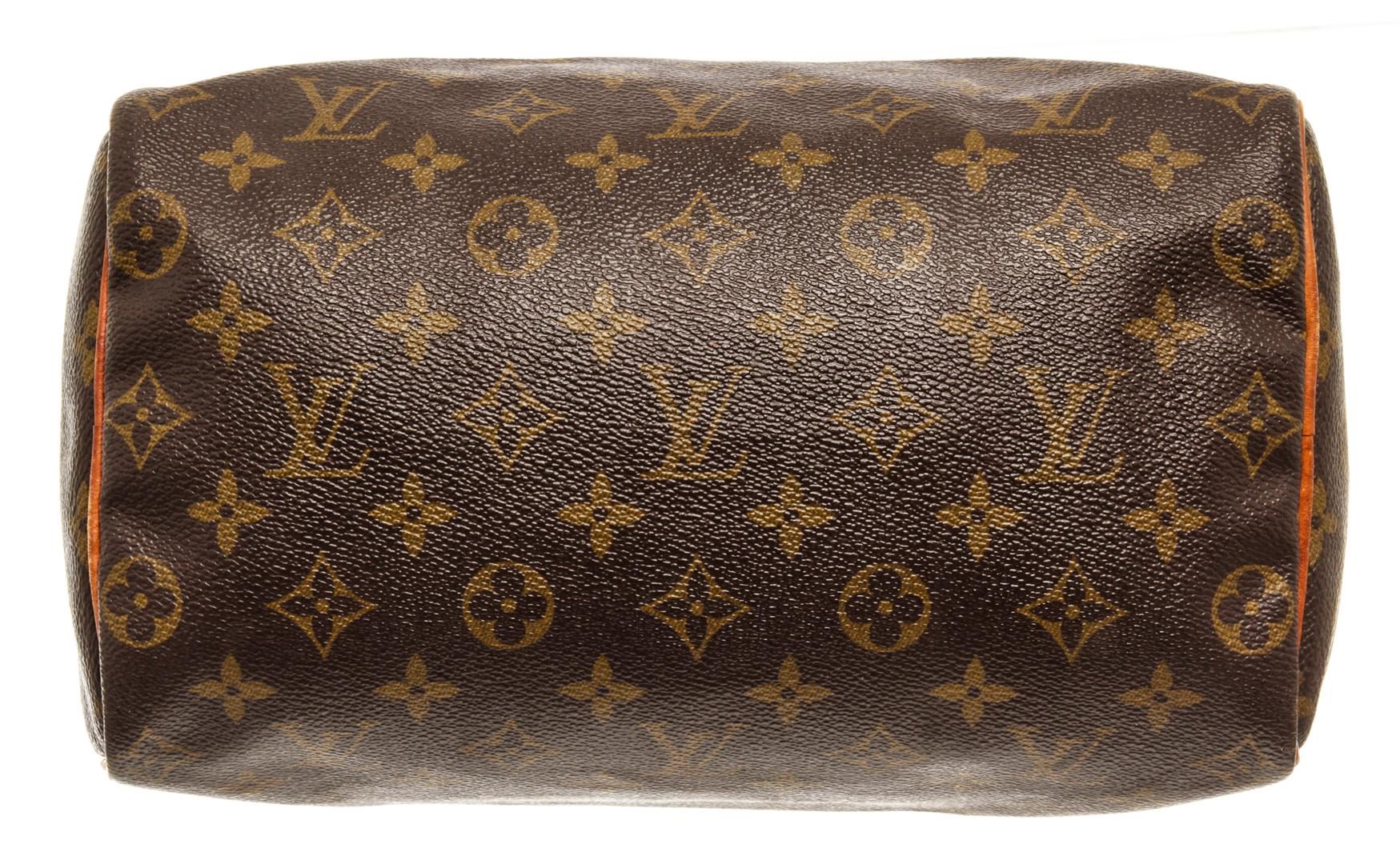 One Louis Vuitton Speedy 25 cm Handbag. Item is sold AS-IS. All available information is listed in the description and shown in the photo. Louis Vuitton Speedy 25 cm handbag with monogram coated canvas exterior, vanchetta leather top handles, brown fabric lining, one interior slip pocket, top zip closure, and gold-toned hardware.
