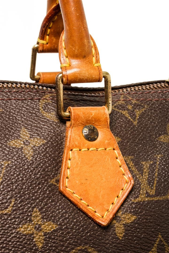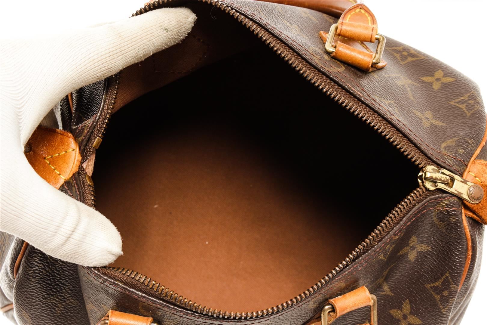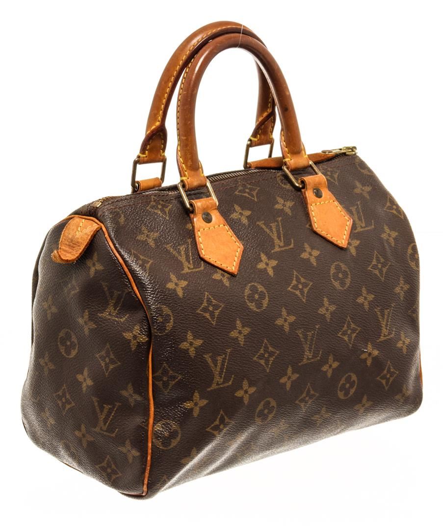 One Louis Vuitton Speedy 25 cm Handbag. Item is sold AS-IS. All available information is listed in the description and shown in the photo. Louis Vuitton Speedy 25 handbag with coated canvas exterior, brown fabric lining, contrasting vachetta leather trims and top handles, gold-tone hardware, zipper closure, and one main compartment with one slip pocket.