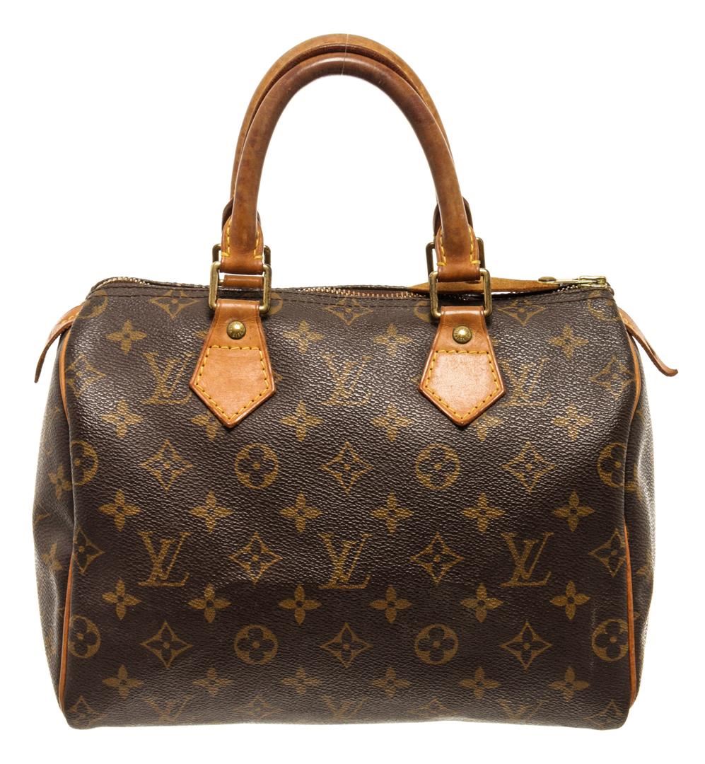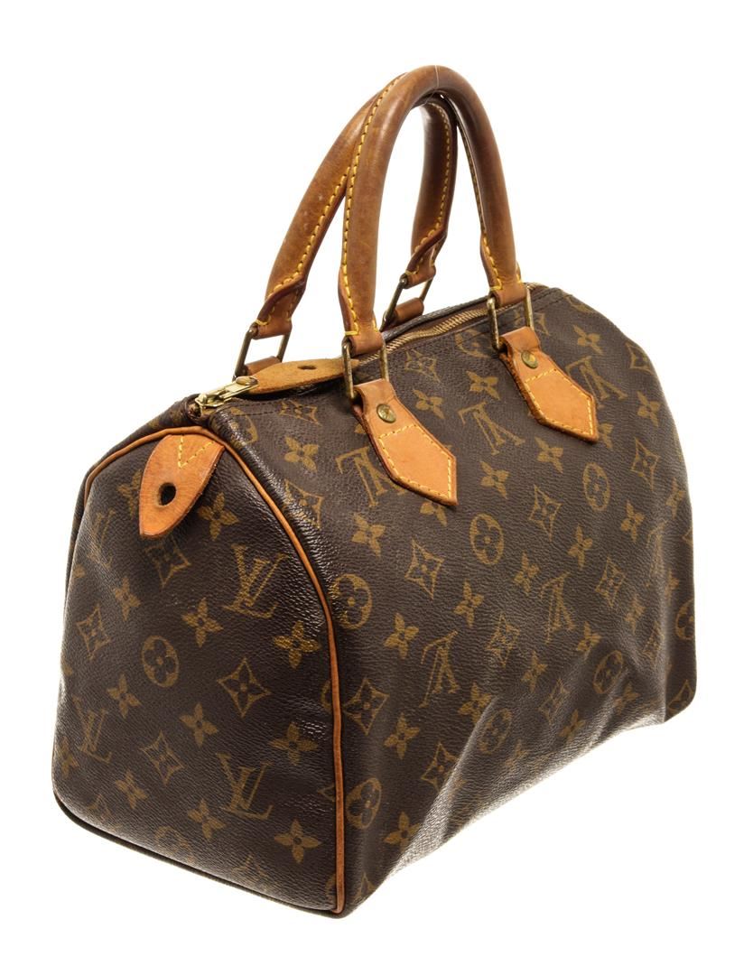 One Louis Vuitton Speedy 25 cm Handbag. Item is sold AS-IS. All available information is listed in the description and shown in the photo. Louis Vuitton Speedy 25 cm handbag with monogram coated canvas exterior, vanchetta leather top handles, brown fabric lining, one interior slip pocket, top zip closure, and gold-tone hardware.
