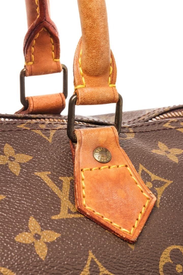 Louis Vuitton Speedy 30 Boston Bag Brown Monogram Coated Canvas. Brand: Louis Vuitton, Style: Speedy 30, Type: Boston Bag, Exterior Color: Brown Monogram, Exterior Material: Coated Canvas, Exterior Pockets: None, Interior Color: Brown, Interior Material: Canvas, Interior Pockets: One slip, Closure: Zip, Handle/Strap Type: Top Handle, Length: 11.8, Width: 6.7, Height: 8.3, Handle Drop: 3.5. Condition: Vachetta is worn. Item is sold AS-IS and all information pertaining to this lot is available in the photos or this description.