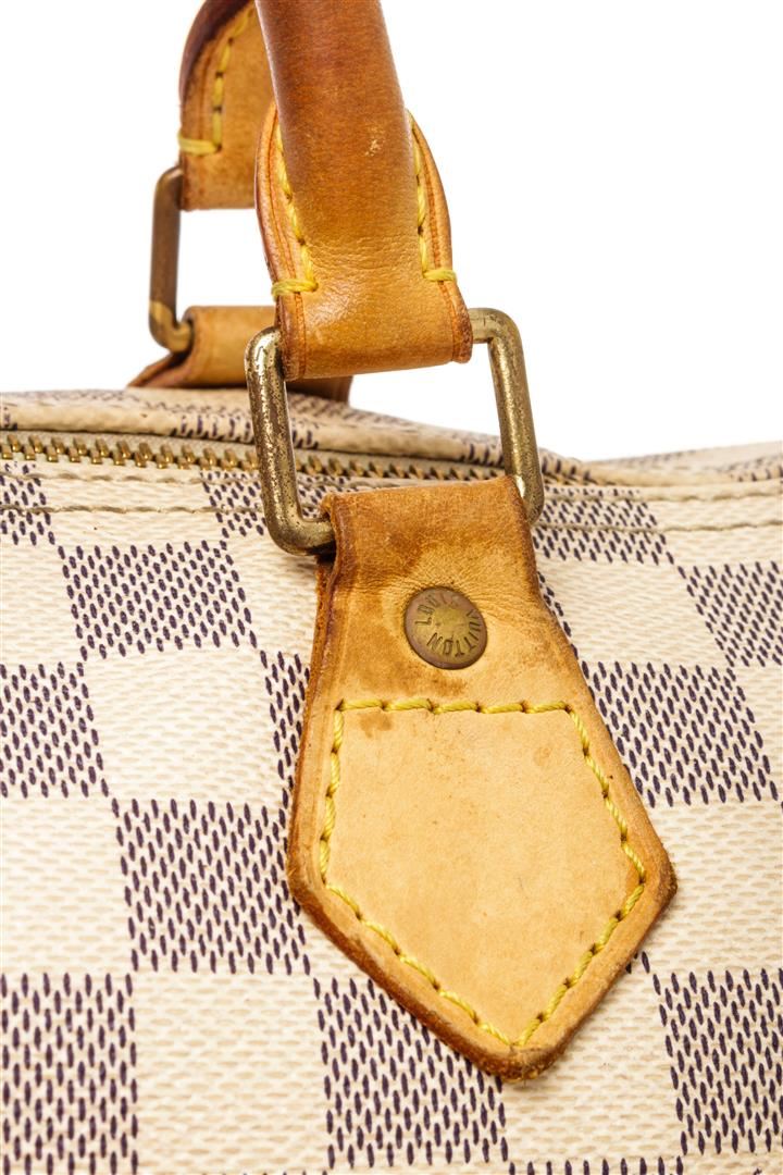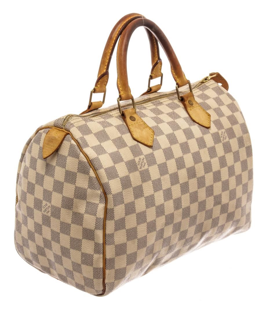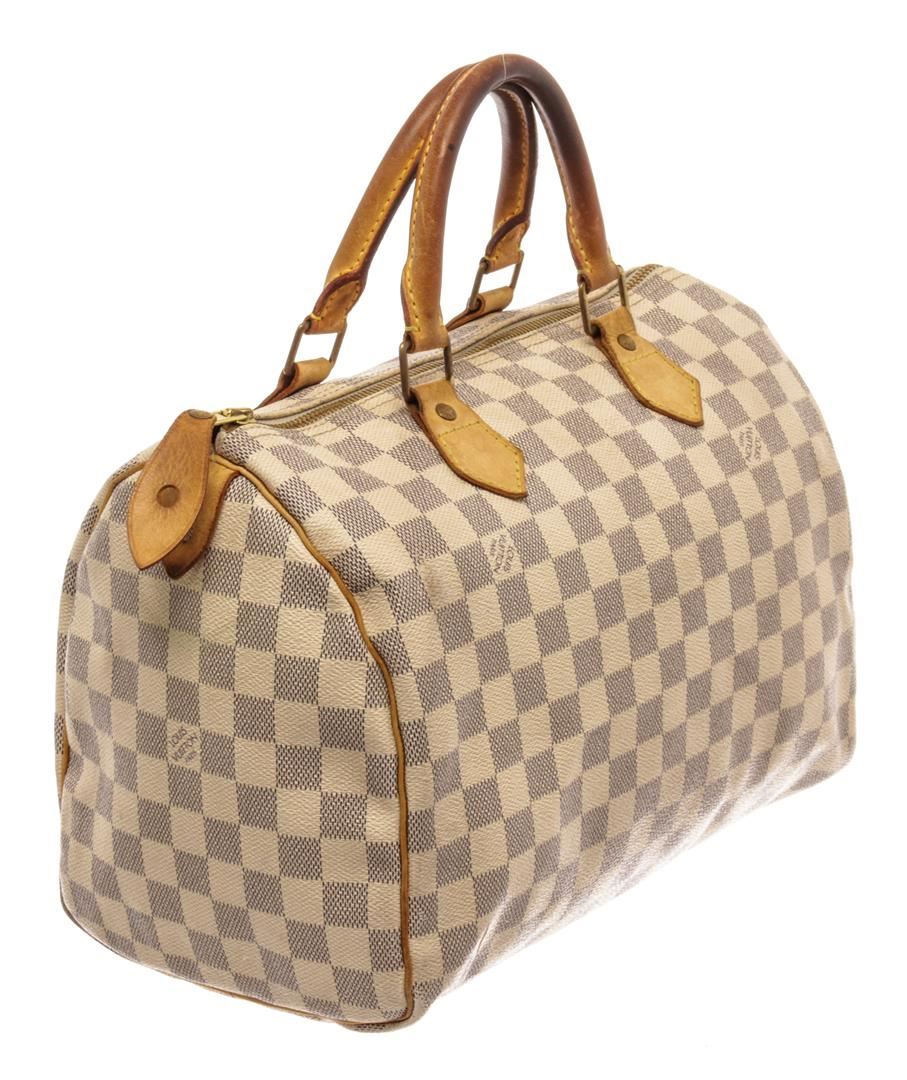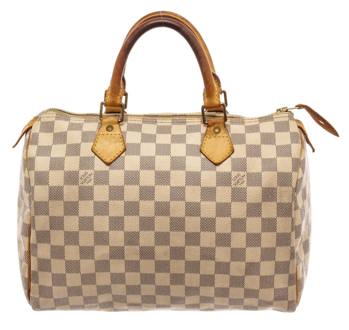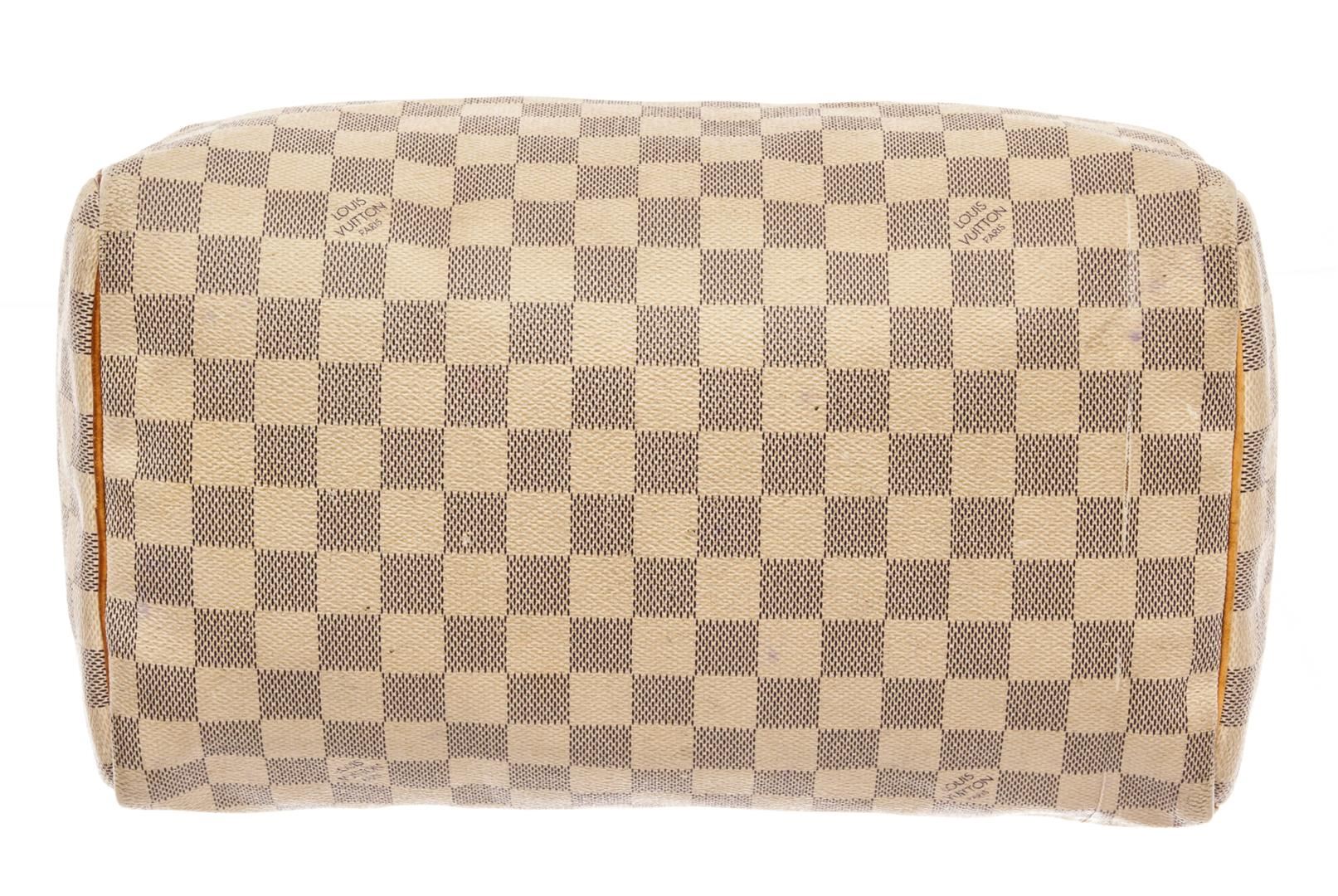 Louis Vuitton Speedy 30 Handbag Damier Azur canvas. Brand: Louis Vuitton, Style: Speedy 30, Type: Handbag, Exterior Color: Damier Azur, Exterior Material: canvas, Exterior Pockets: None, Interior Color: beige, Interior Material: canvas, Interior Pockets: one, Closure: zip, Handle/Strap Type: dual top handle, Length: 12 1/2, Width: 7, Height: 8, Handle Drop: 3 1/2. Condition: wear on top handles, long cut on bottom. Additional Information: musty smell interior. Item is sold AS-IS and all information pertaining to this lot is available in the photos or this description.