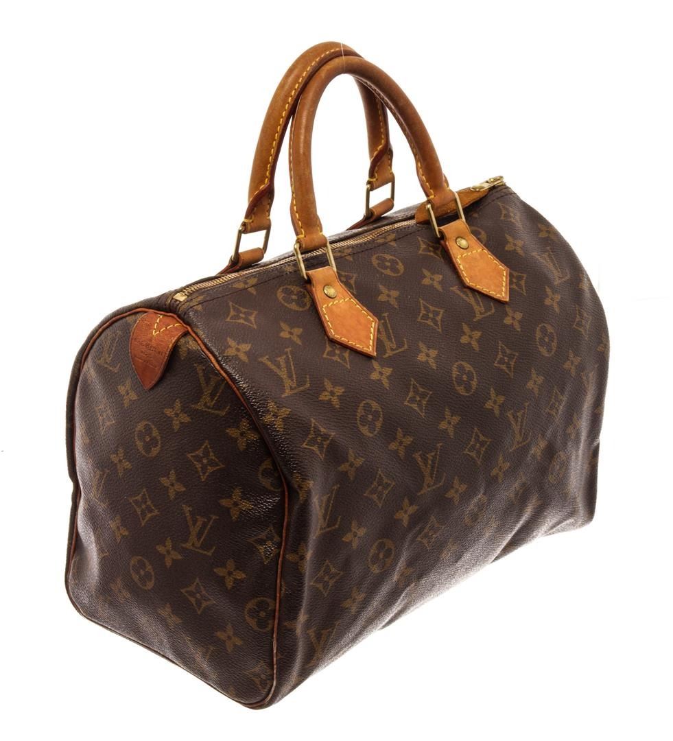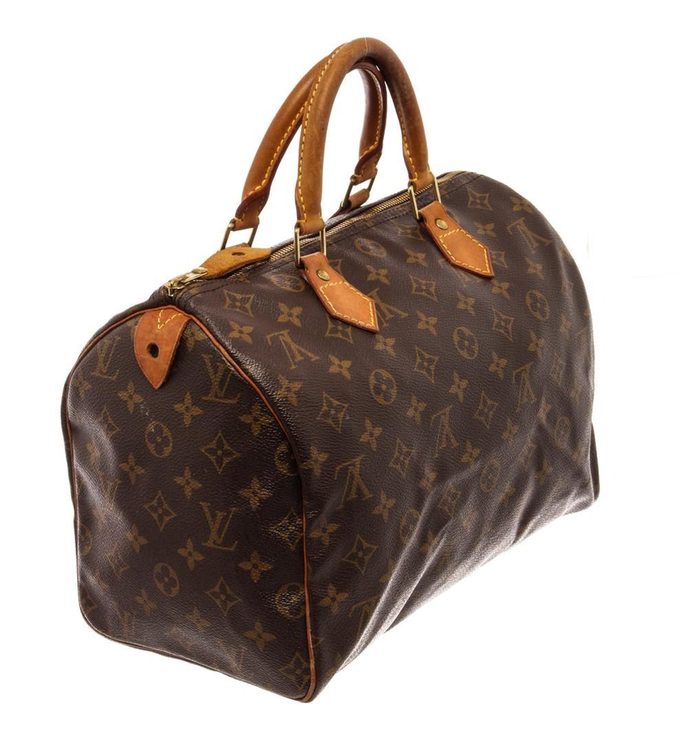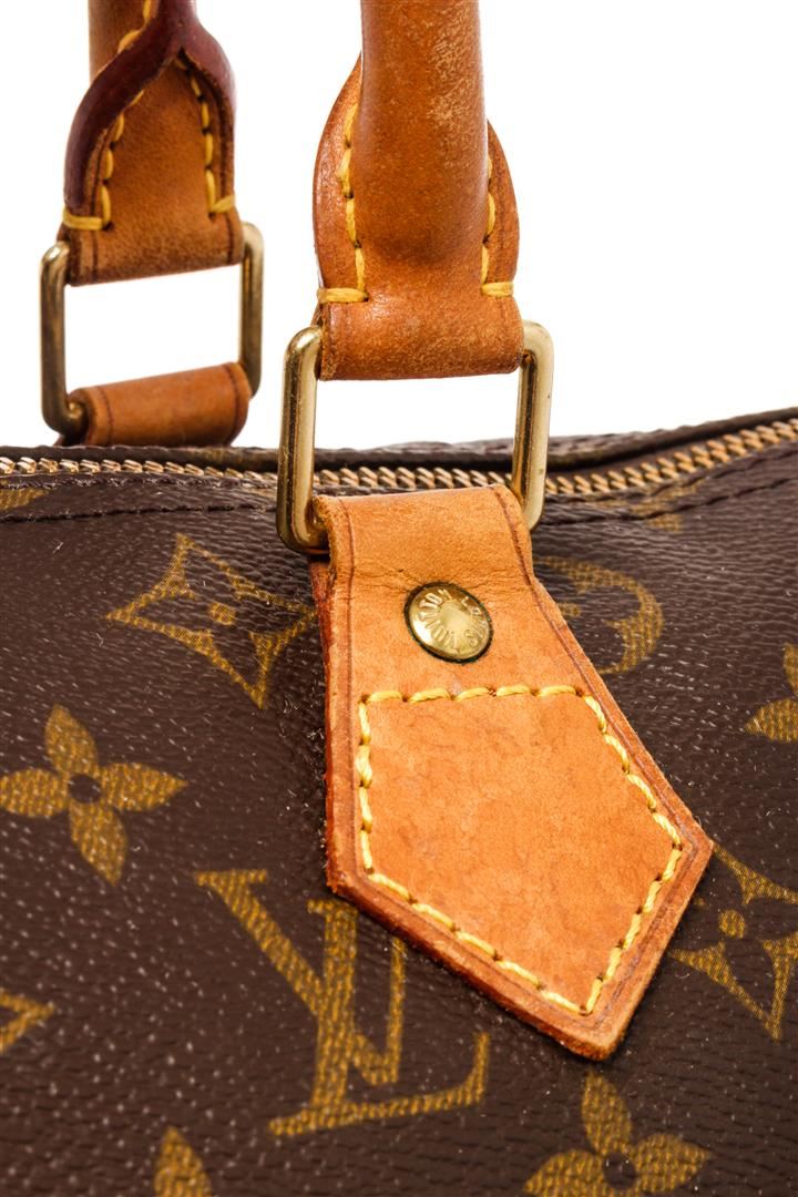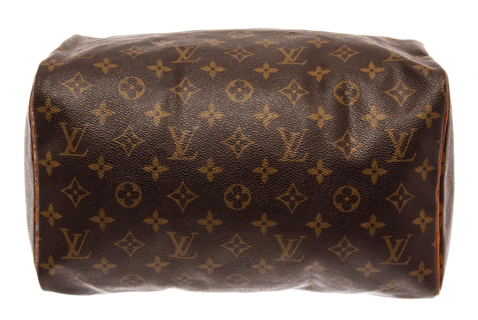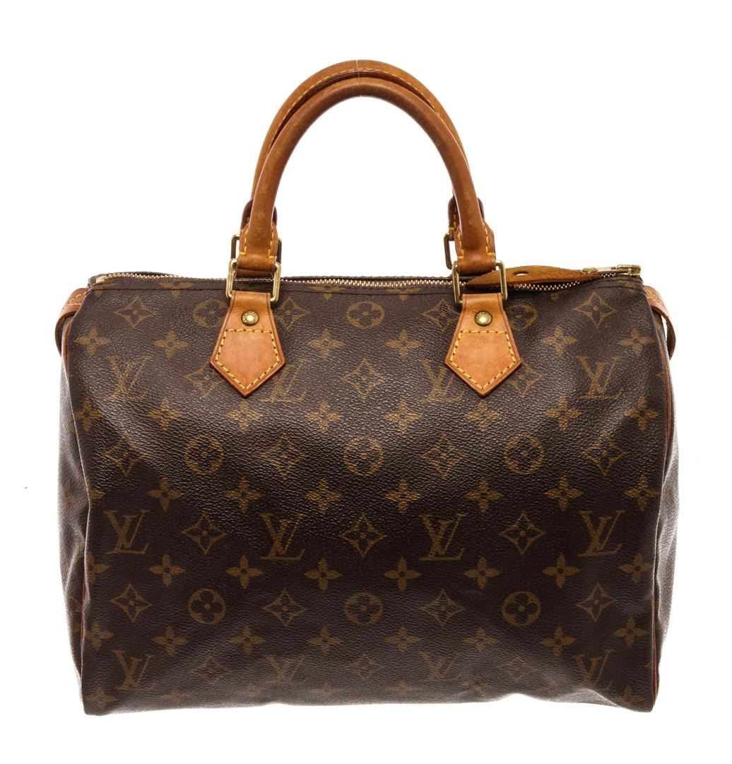 Louis Vuitton Speedy 30 Handbag brown monogram Coated Canvas. Brand: Louis Vuitton, Style: Speedy 30, Type: Handbag, Exterior Color: brown monogram, Exterior Material: Coated Canvas, Exterior Pockets: None, Interior Color: Brown, Interior Material: Canvas, Interior Pockets: None, Closure: zip, Handle/Strap Type: dual top handle, Length: 12, Width: 13, Height: 7 1/2, Handle Drop: 4. Condition: wear mostly concentrated on top handles. Item is sold AS-IS and all information pertaining to this lot is available in the photos or this description.