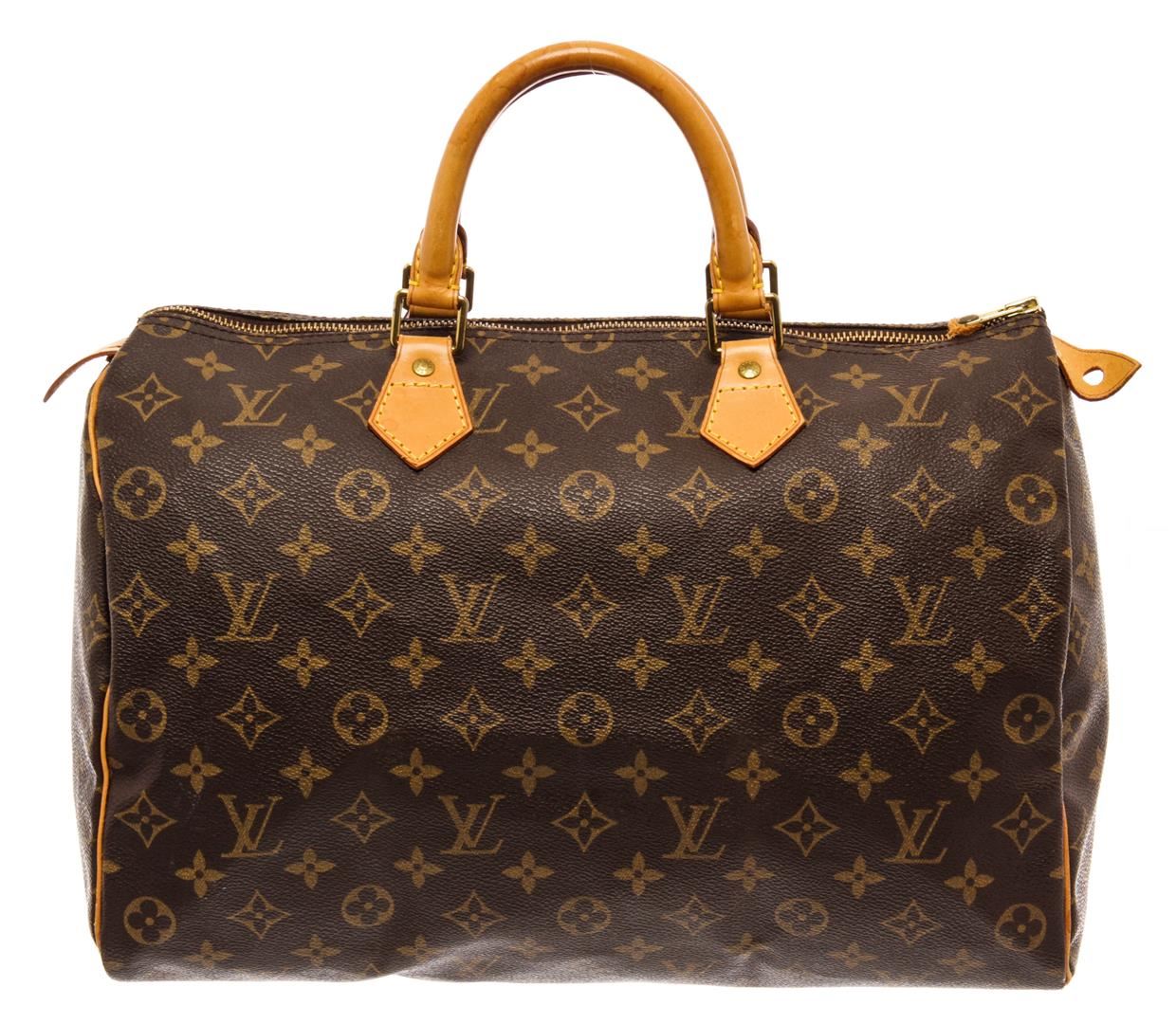 Louis Vuitton Speedy 35 Boston Bag Brown Monogram Coated Canvas. Brand: Louis Vuitton, Style: Speedy 35, Type: Boston Bag, Exterior Color: Brown Monogram, Exterior Material: Coated Canvas, Exterior Pockets: None, Interior Color: Brown, Interior Material: Canvas, Interior Pockets: One, Closure: Zip, Handle/Strap Type: Top Handle, Length: 13, Width: 7.75, Height: 9, Handle Drop: 4. Condition: Wet marks on handle. Additional Information: Comes with strap. Item is sold AS-IS and all information pertaining to this lot is available in the photos or this description.