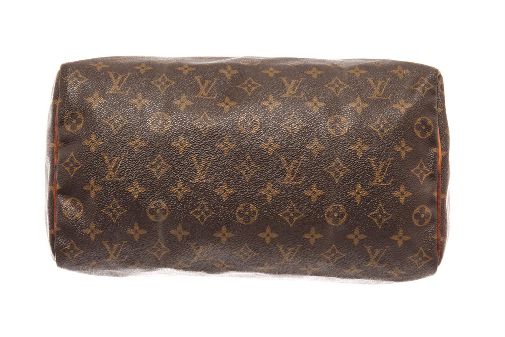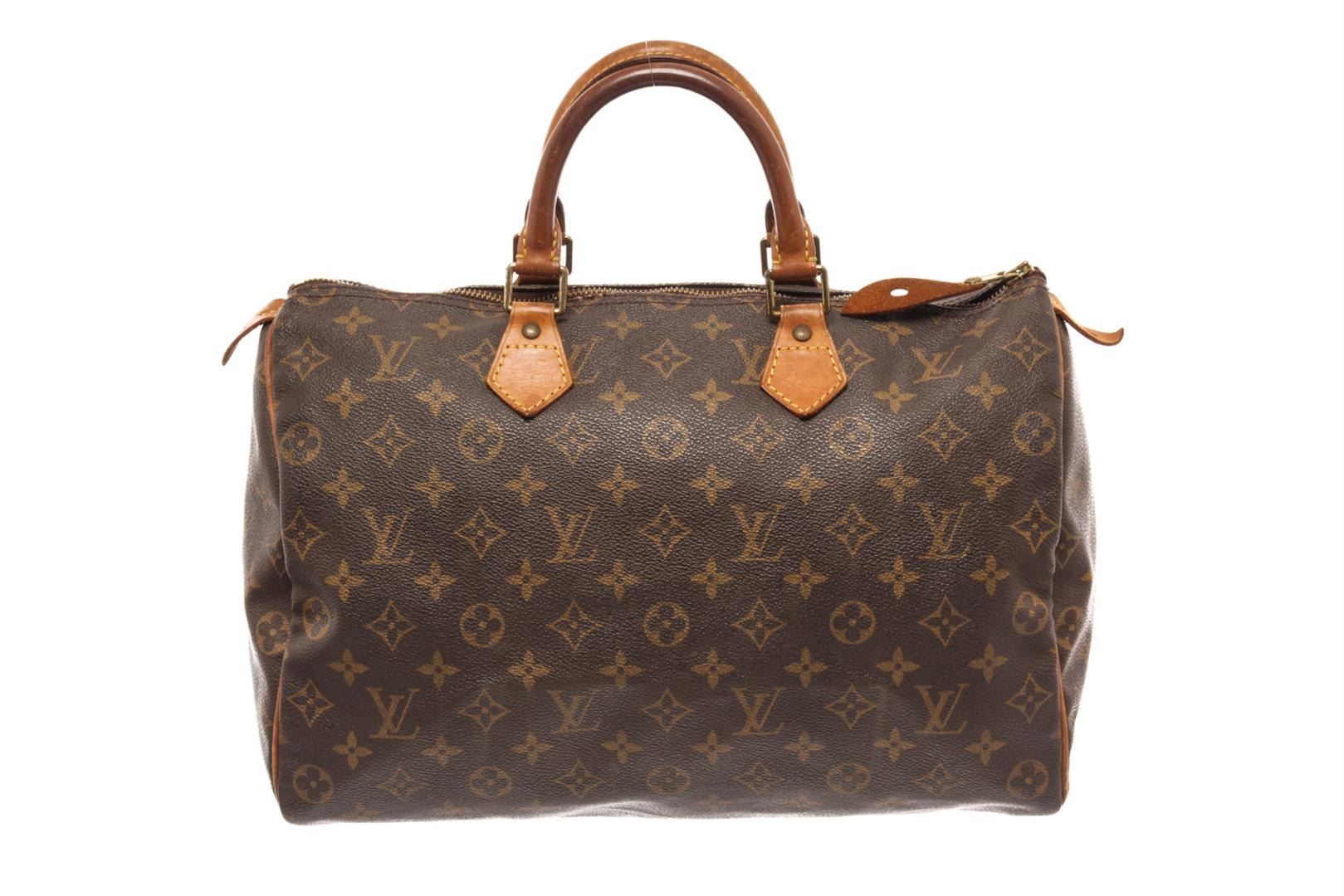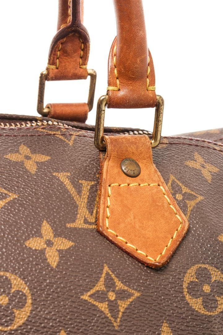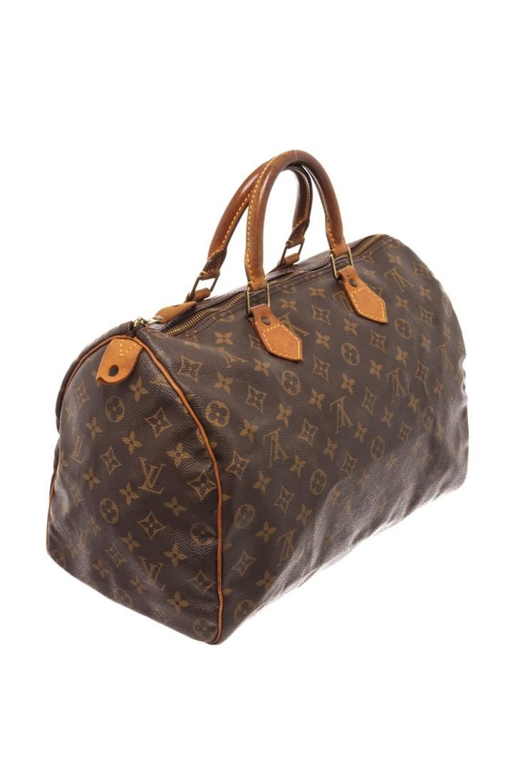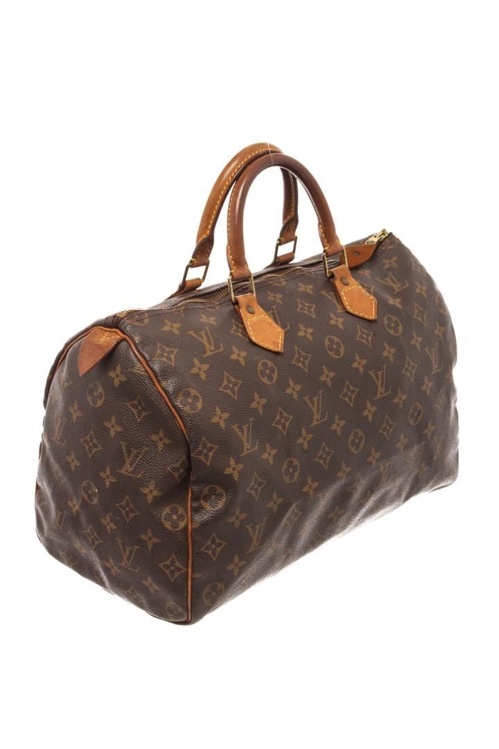 Louis Vuitton Speedy 35 Boston Bag Brown Monogram Coated Canvas. Brand: Louis Vuitton, Style: Speedy 35, Type: Boston Bag, Exterior Color: Brown Monogram, Exterior Material: Coated Canvas, Exterior Pockets: None, Interior Color: Brown, Interior Material: Canvas, Interior Pockets: One Slip, Closure: Zip closure, Handle/Strap Type: Top Handle, Length: 14, Width: 7, Height: 9, Handle Drop: 3. Condition: Vachetta is worn. Item is sold AS-IS and all information pertaining to this lot is available in the photos or this description.