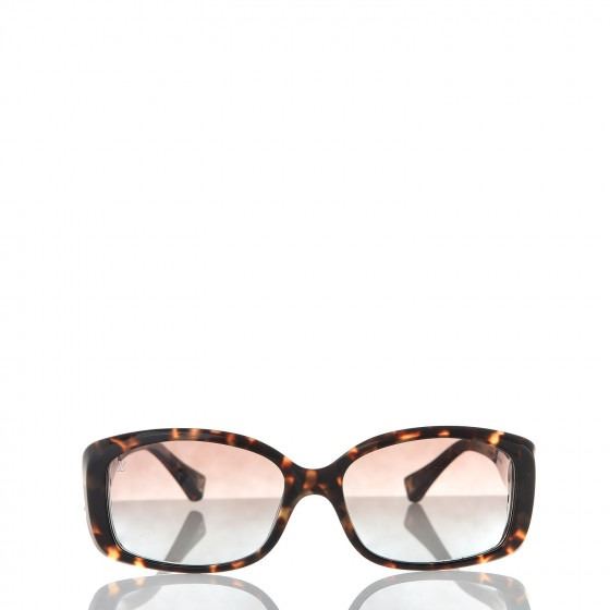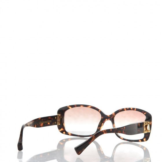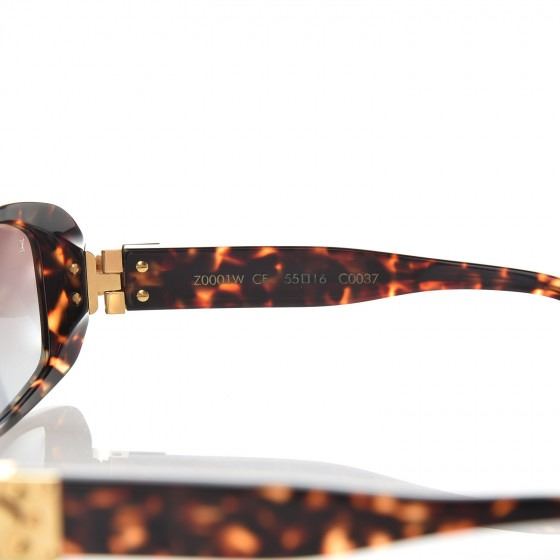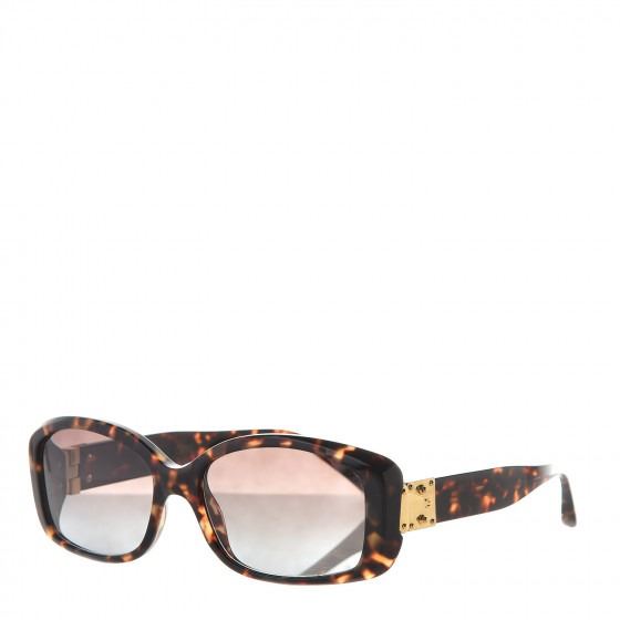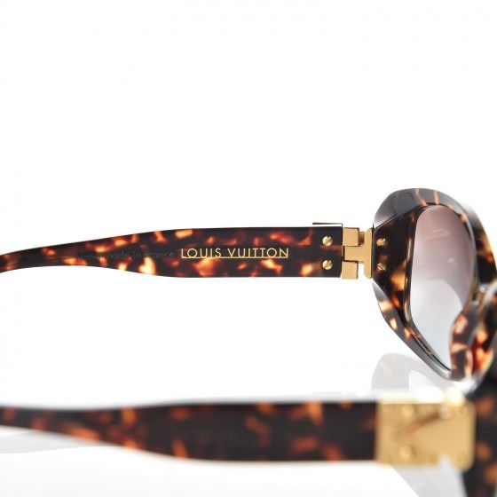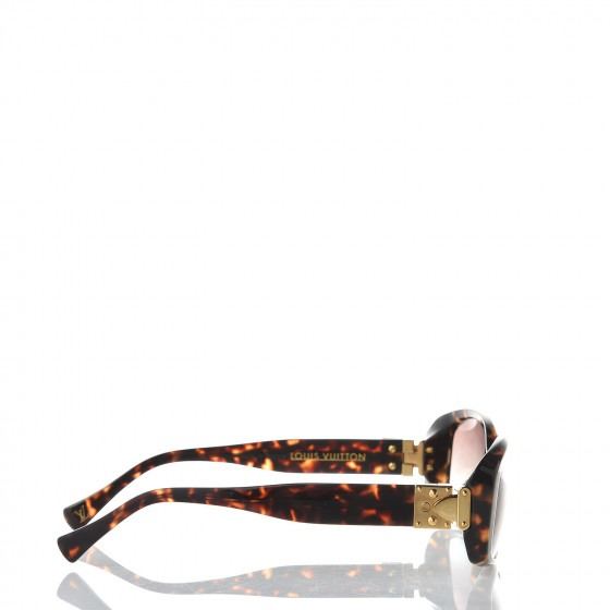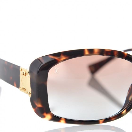 These Sunglasses have frames of brown tortoise with squared rims for a slightly retro look. The lenses are a gradient tint of dark brown. The narrow arms have a Louis Vuitton brass press lock embellishment of the hinge.
