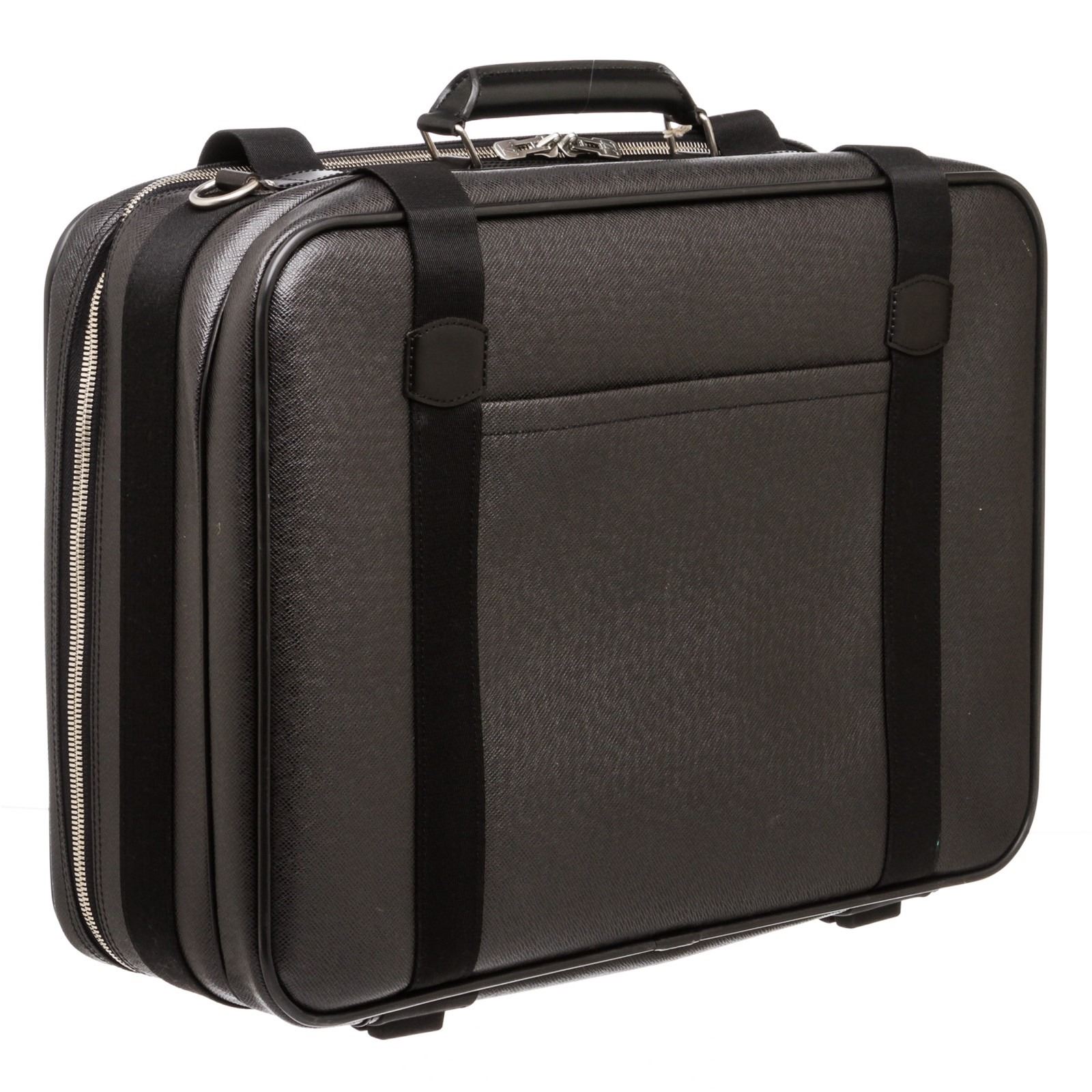 Description: Louis Vuitton Black Taiga Leather Satellite 53 Suitcase. The Satellite 53 features a taiga body, a top leather handle, an exterior slip pocket, a zip around closure, and an interior open pocket.
