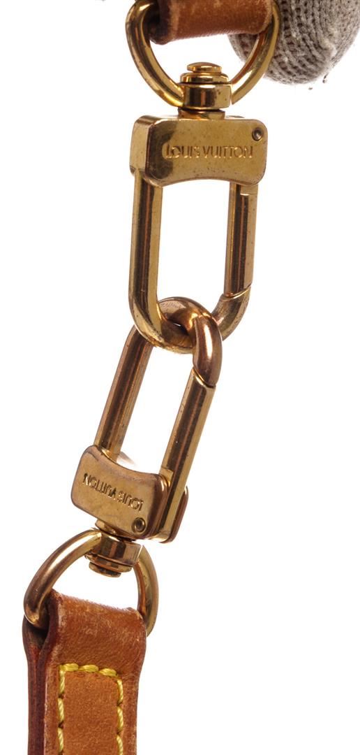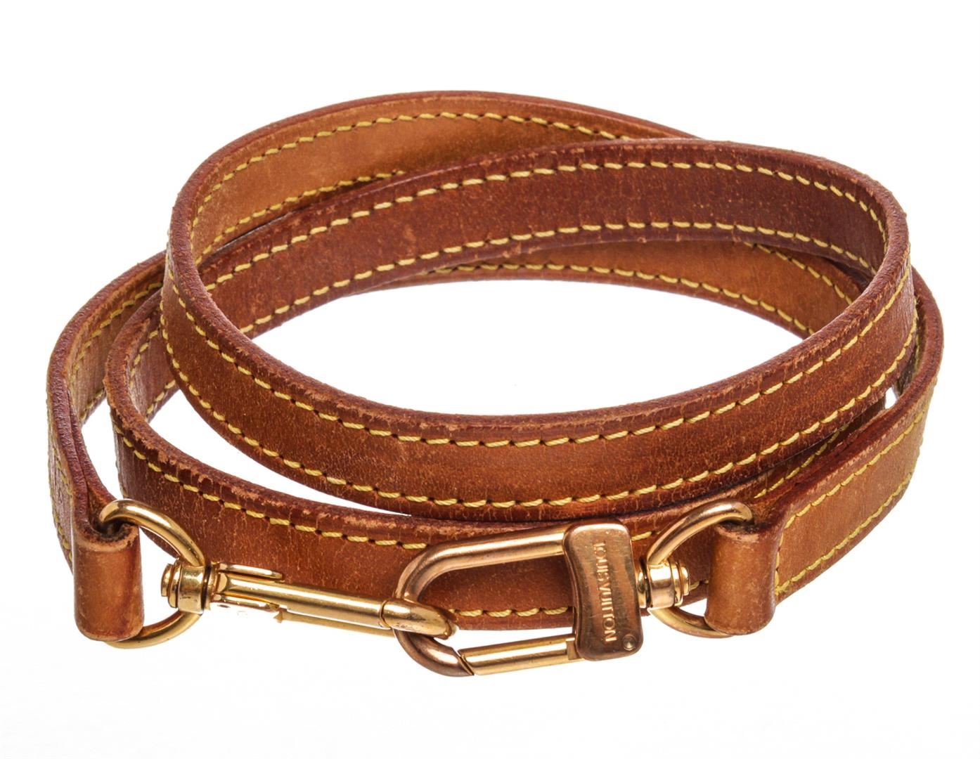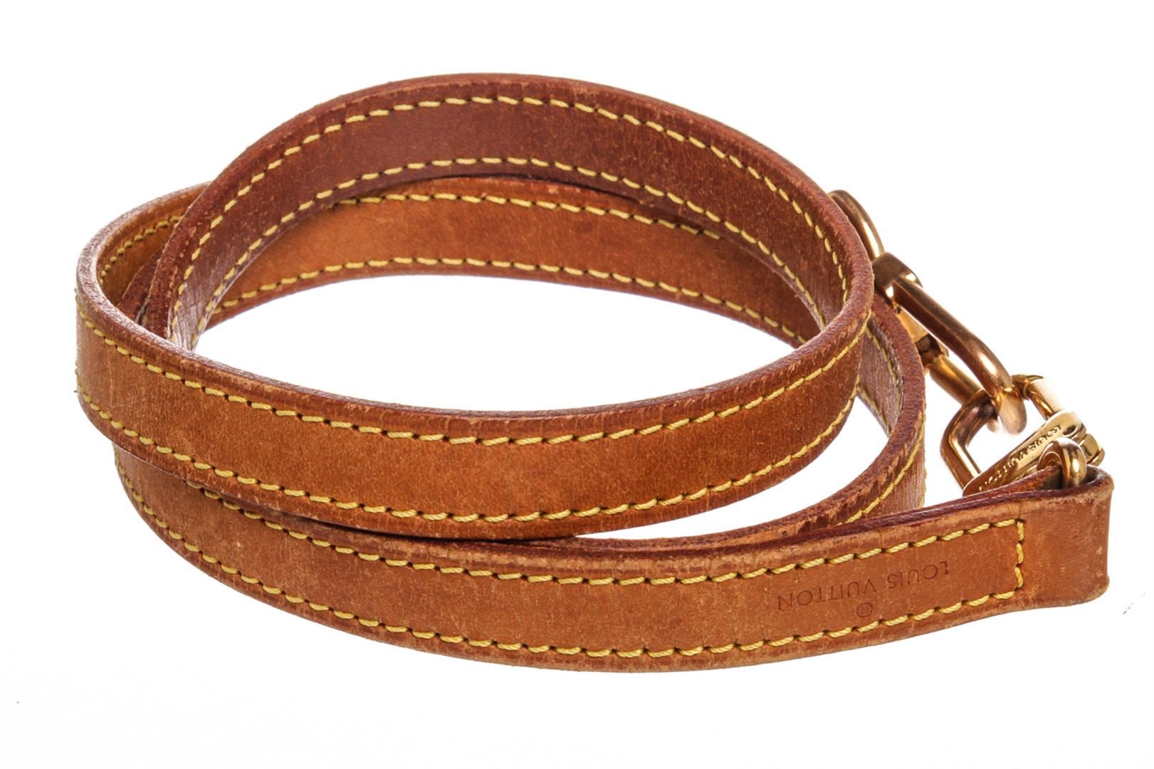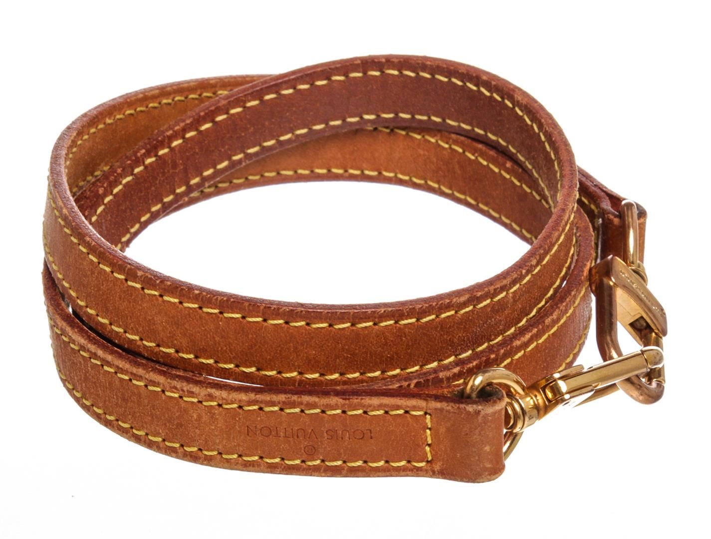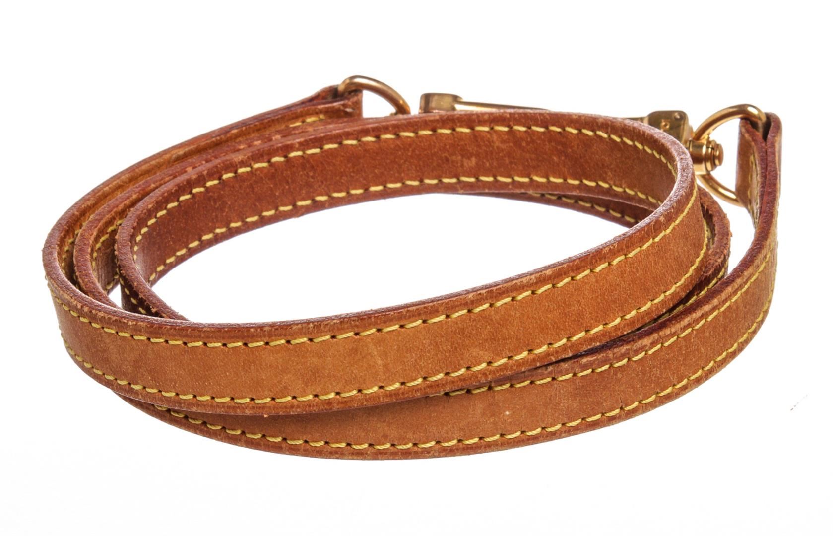 Tan Vachetta Leather Louis Vuitton strap with yellow contrast stitching and gold-tone hardware.