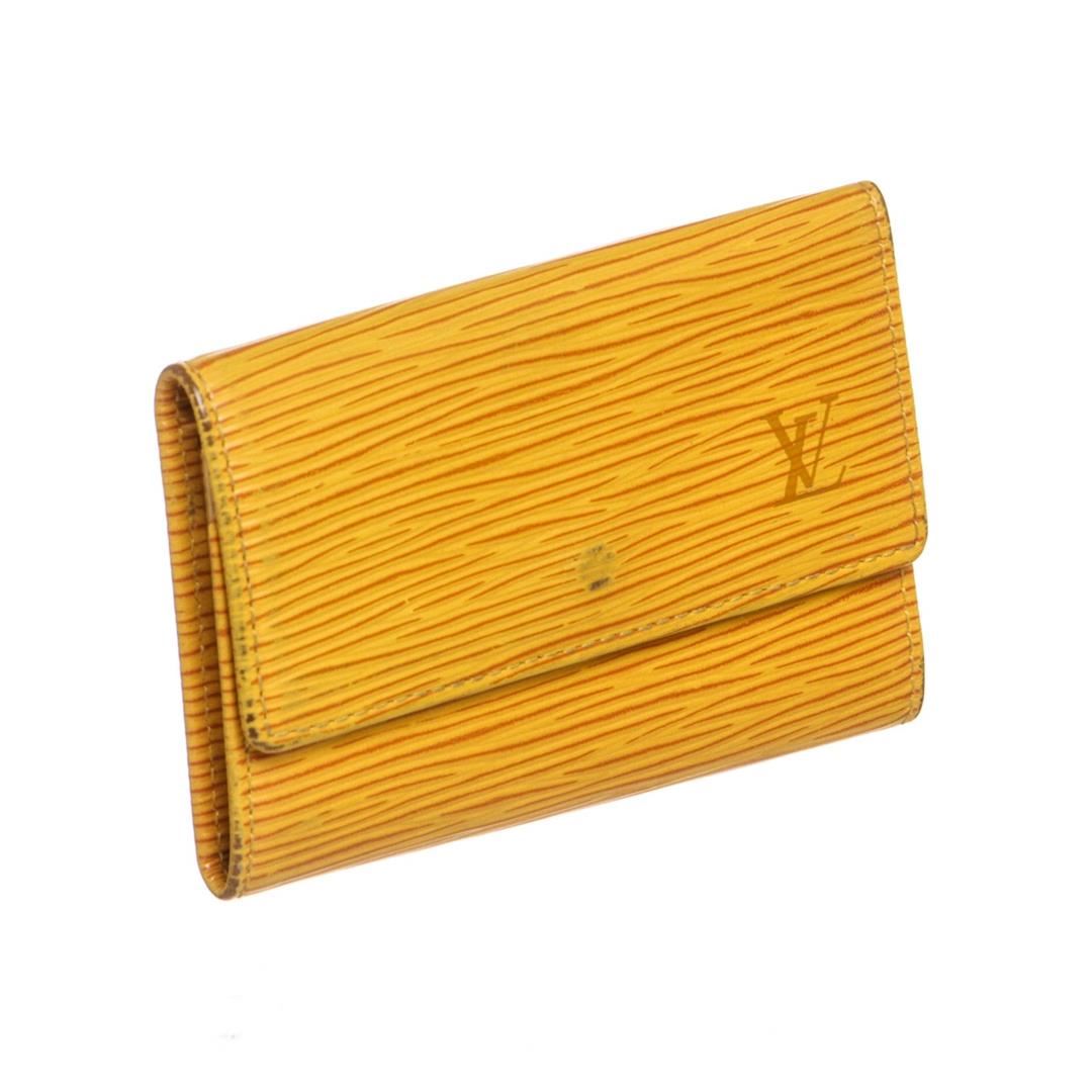 Tassil yellow Epi leather Louis Vuitton key holder with brass hardware, embossed logo at front, purple Taiga leather lining, six key chains and snap closure at front flap. Dimensions = 4.25"x.5"x3"/10.79cmx1.27cmx7.62cm. Item is pre-owned.