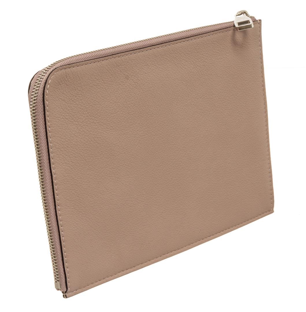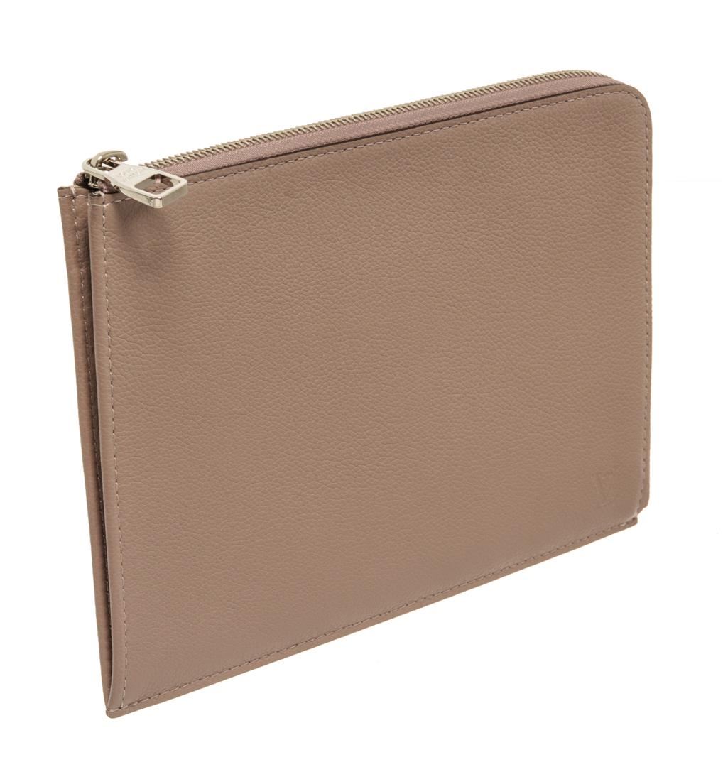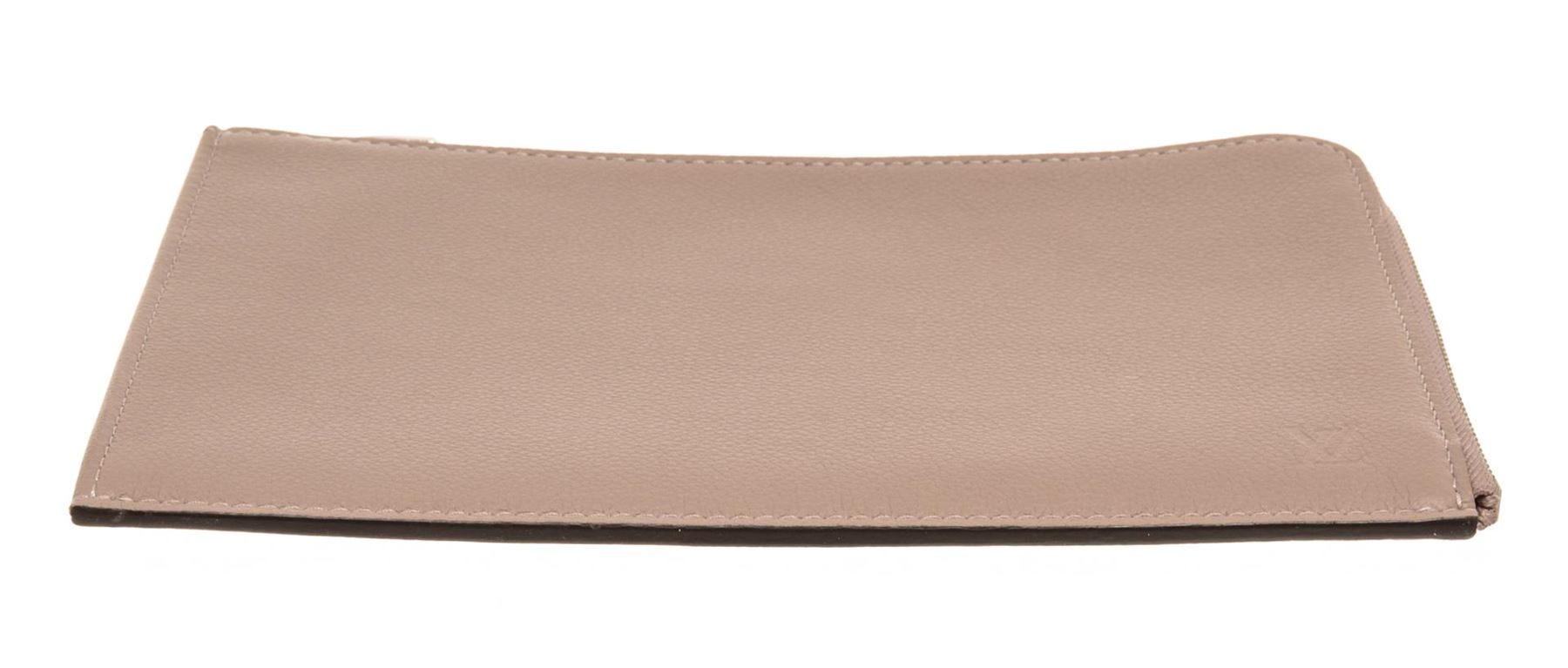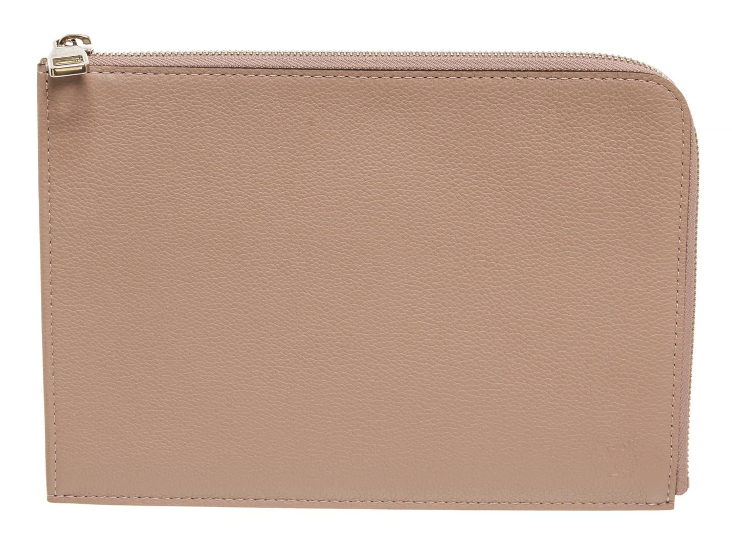 One Louis Vuitton Taupe Leather Pochette Jour Clutch. Item is sold AS-IS. All available information is listed in the description and shown in the photo. Louis Vuitton Taupe Leather Pochette Jour Clutch with exterior color neutral, exterior material leather, interior material microfiber, hardware color silver, 9"W x 6.5"H x 0.5"D / 22.86 x 16.51 x 0.5 Cm