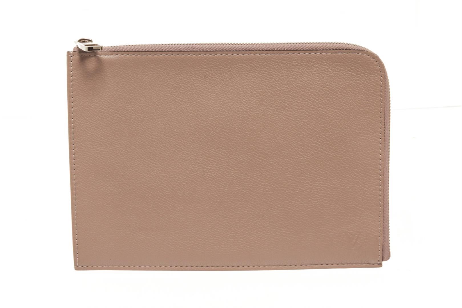 One Louis Vuitton Taupe Leather Pochette Jules PM Cluch. Item is sold AS-IS. All available information is listed in the description and shown in the photo. louis vuitton taupe leather pochette jules pm cluch with exterior color neutral, exterior material leather, interior material microfiber, hardware color silver. Height: 6.5" Width: 9" Depth: 0.5", Handle Drop: / 16.51 x 22.86 x 1.27 Cm