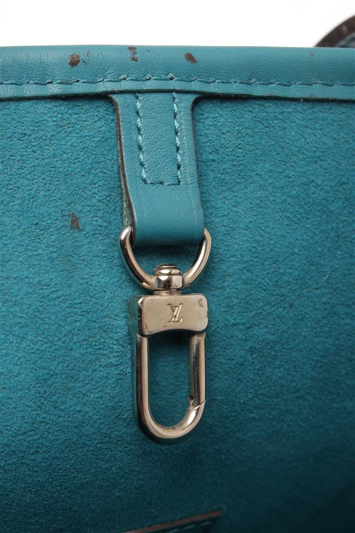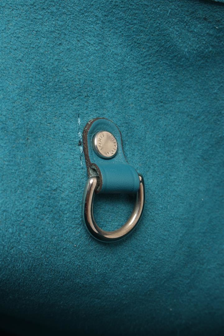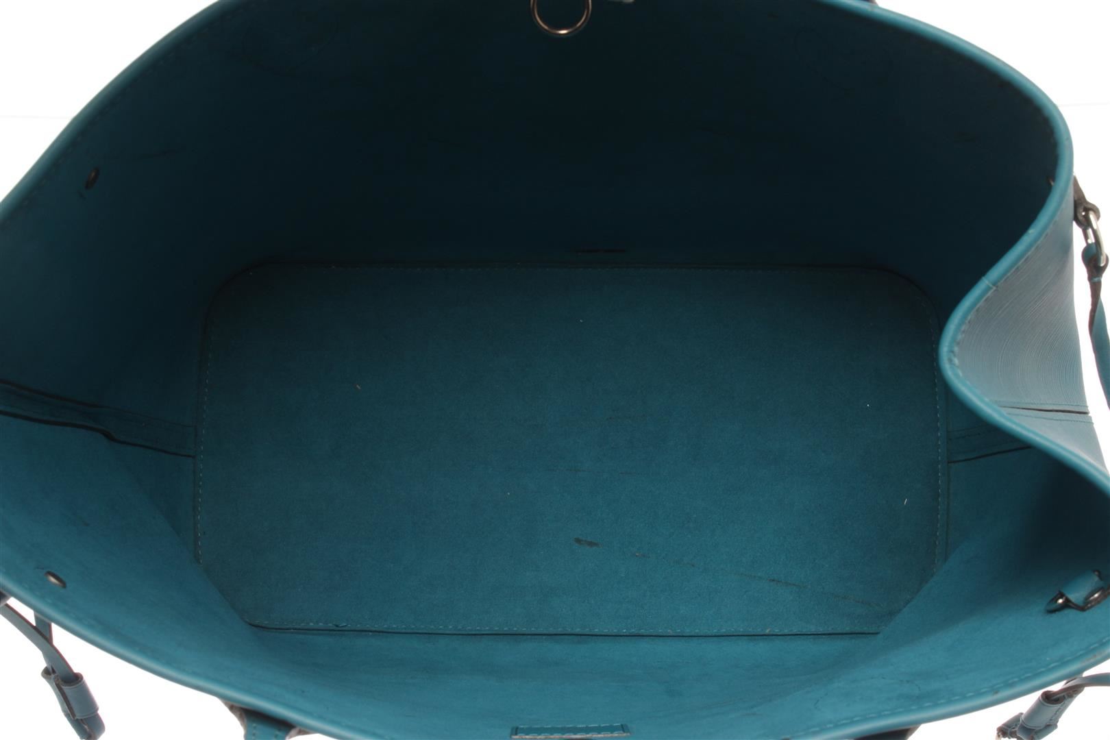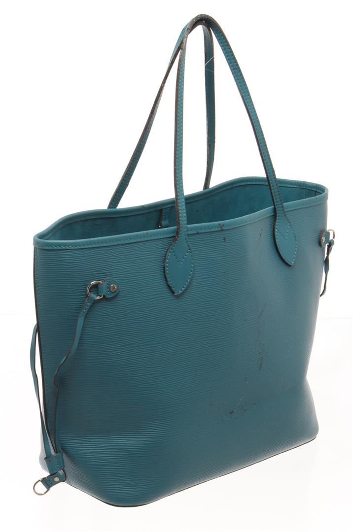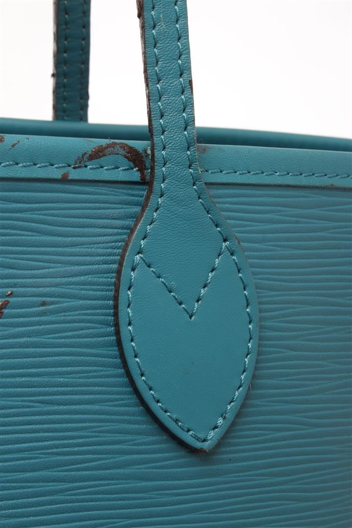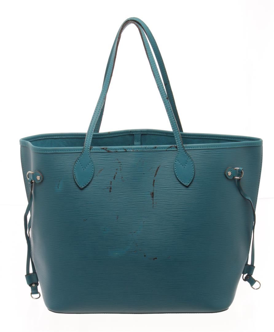 One Louis Vuitton Teal Blue Epi Leather Neverfull MM Tote Bag. Item is sold AS-IS. All available information is listed in the description and shown in the photo. Louis vuitton epi leather Neverfull MM tote bag with silver-tone hardware. PLEASE NOTE: The strap trim has melted and stain the exterior of the bag throughout. Please see photographs. 12.5"(W) x 11.5"(H) x 6.5"(D) / 31.75 x 29.21 x 16.51 CM