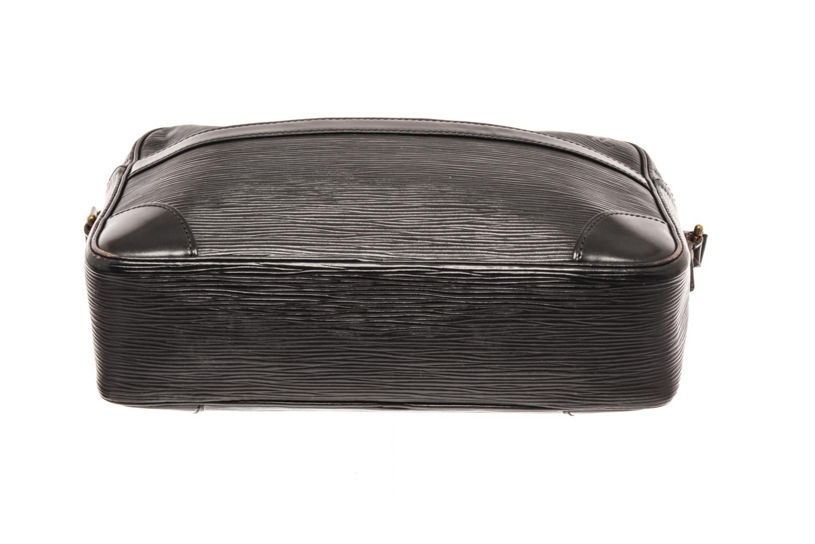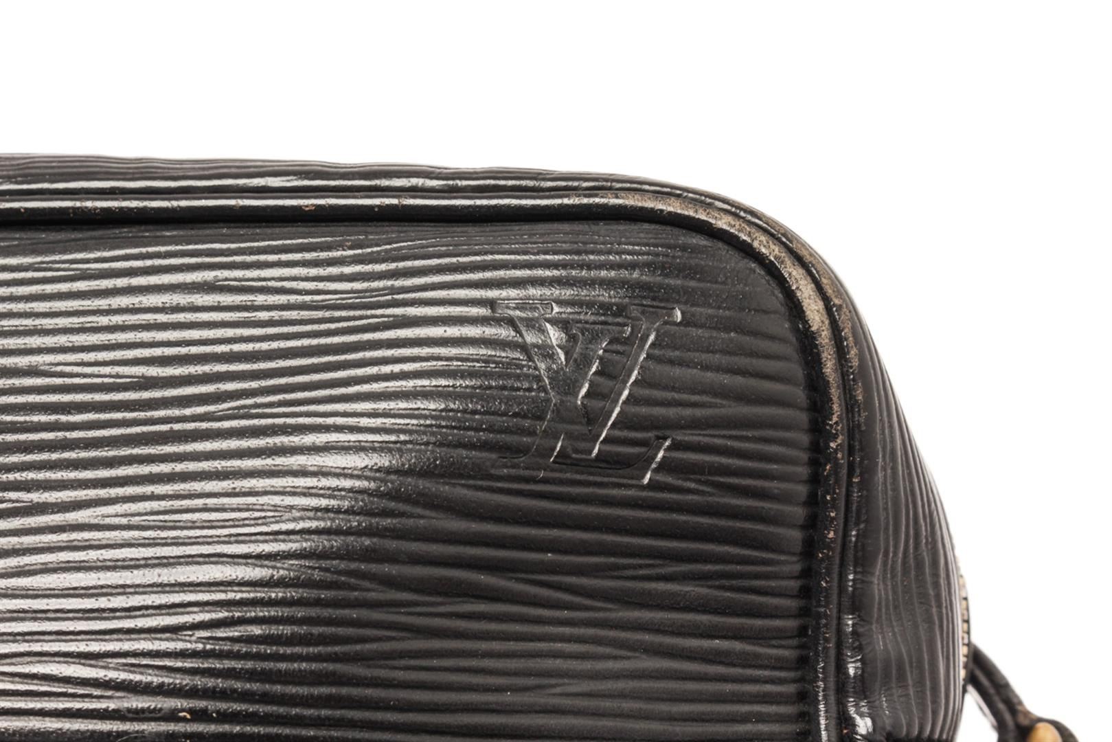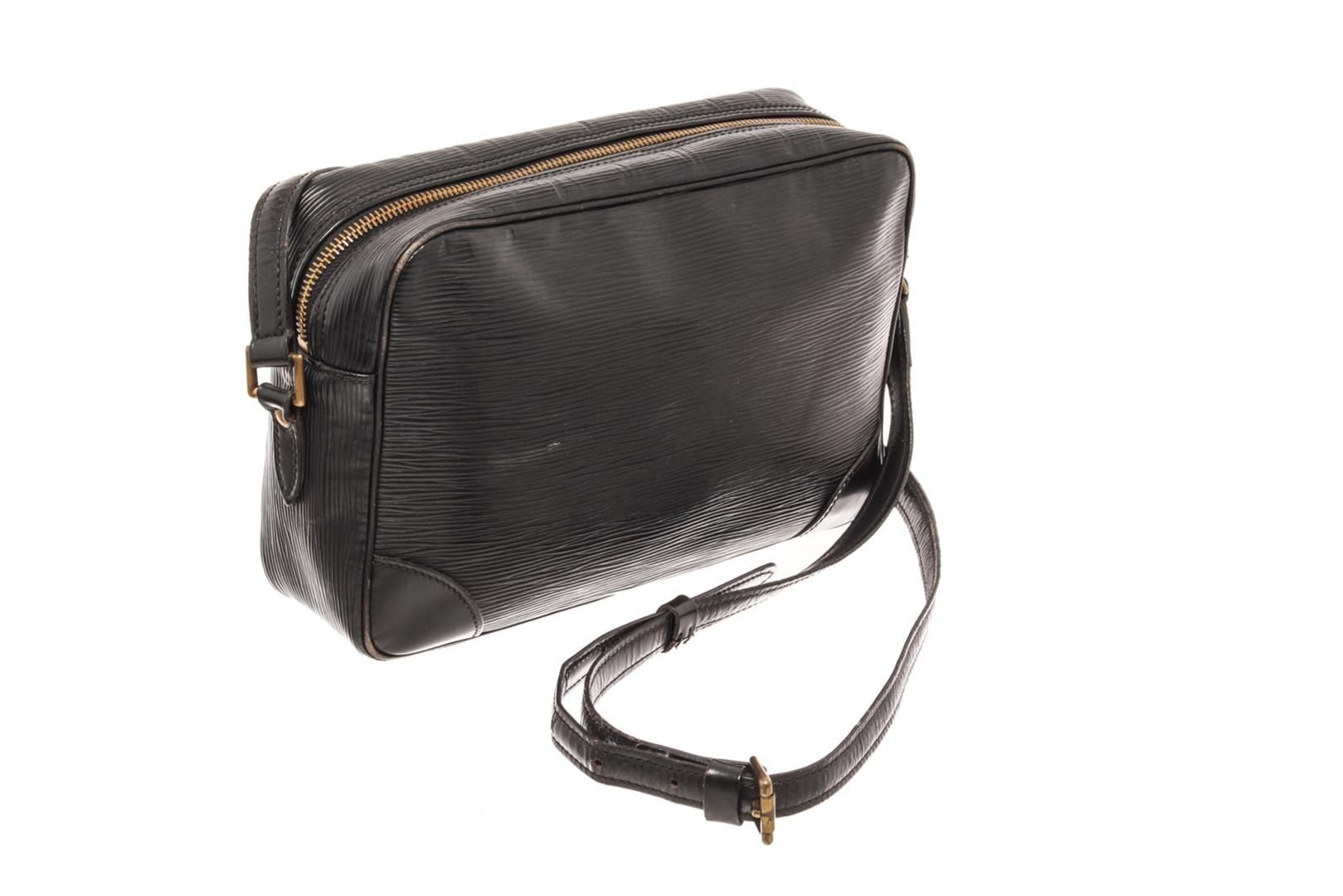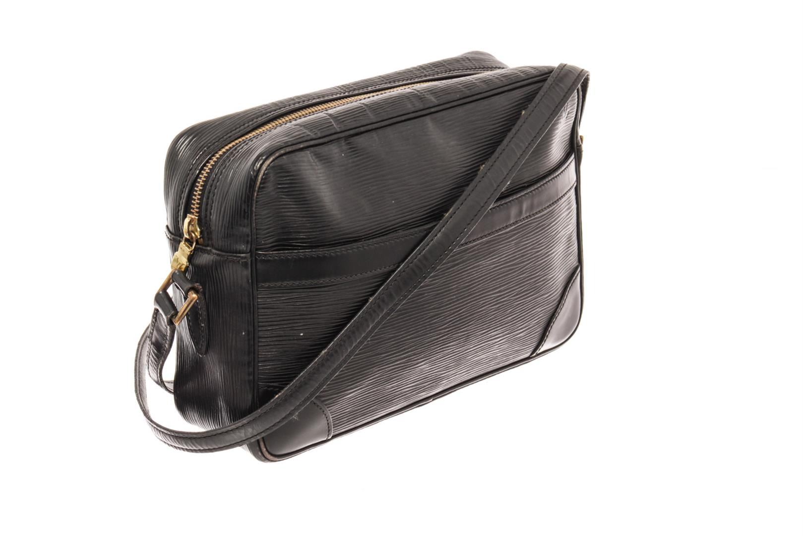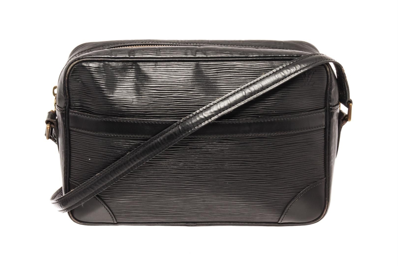 Louis Vuitton Trocadero Crossbody Black Epi. Brand: Louis Vuitton, Style: Trocadero, Type: Crossbody, Exterior Color: Black, Exterior Material: Epi, Exterior Pockets: One Slip Pocket, Interior Color: Black, Interior Material: Leather, Interior Pockets: One Zip, Closure: Zip, Handle/Strap Type: Adjustable Strap, Length: 3, Width: 1N/A.25, Height: 7, Strap Drop: 19.5. Condition: Corner is worn and leather is creased. Item is sold AS-IS and all information pertaining to this lot is available in the photos or this description.