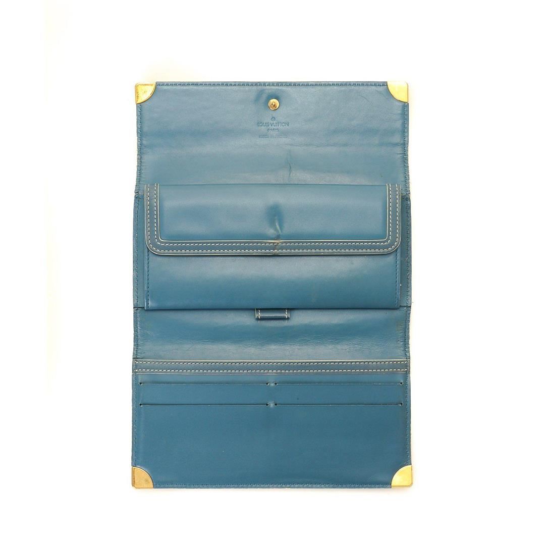Louis Vuitton Turquoise Monogram Porte Tresor International Wallet with gold-tone hardware, monogram material, tan vachetta leather trim, flap closure. Measurements: Length: 17.2 in / 44 cm Width: 5 in / 13 cm 14.1 in / 36 cm Condition: Pre-Owned Good overall, please see photographs for detail.