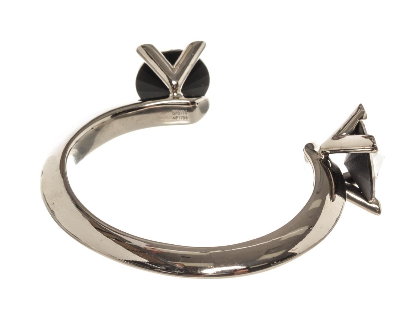 One Louis Vuitton V Cuff Metal with Crystals Silver. Item is sold AS-IS. All available information is listed in the description and shown in the photo. Louis Vuitton V Cuff Metal with Crystals Silver