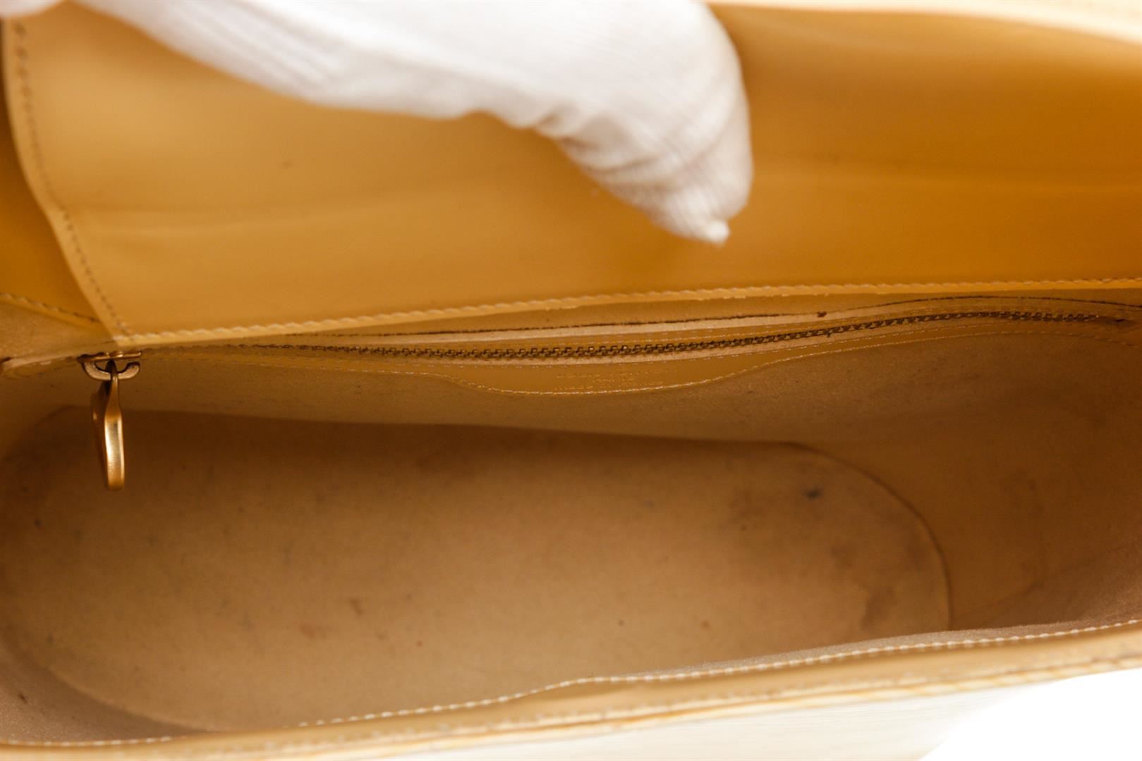 Vanilla light yellow epi leather Louis Vuitton Sac Verseau with gunmetal and hardware, single flat shoulder strap featuring tonal resin accents, embossed logo accent at front corner, grey Alcantara lining, single pocket with zip closure at interior wall and magnetic closure at top. Authentic.