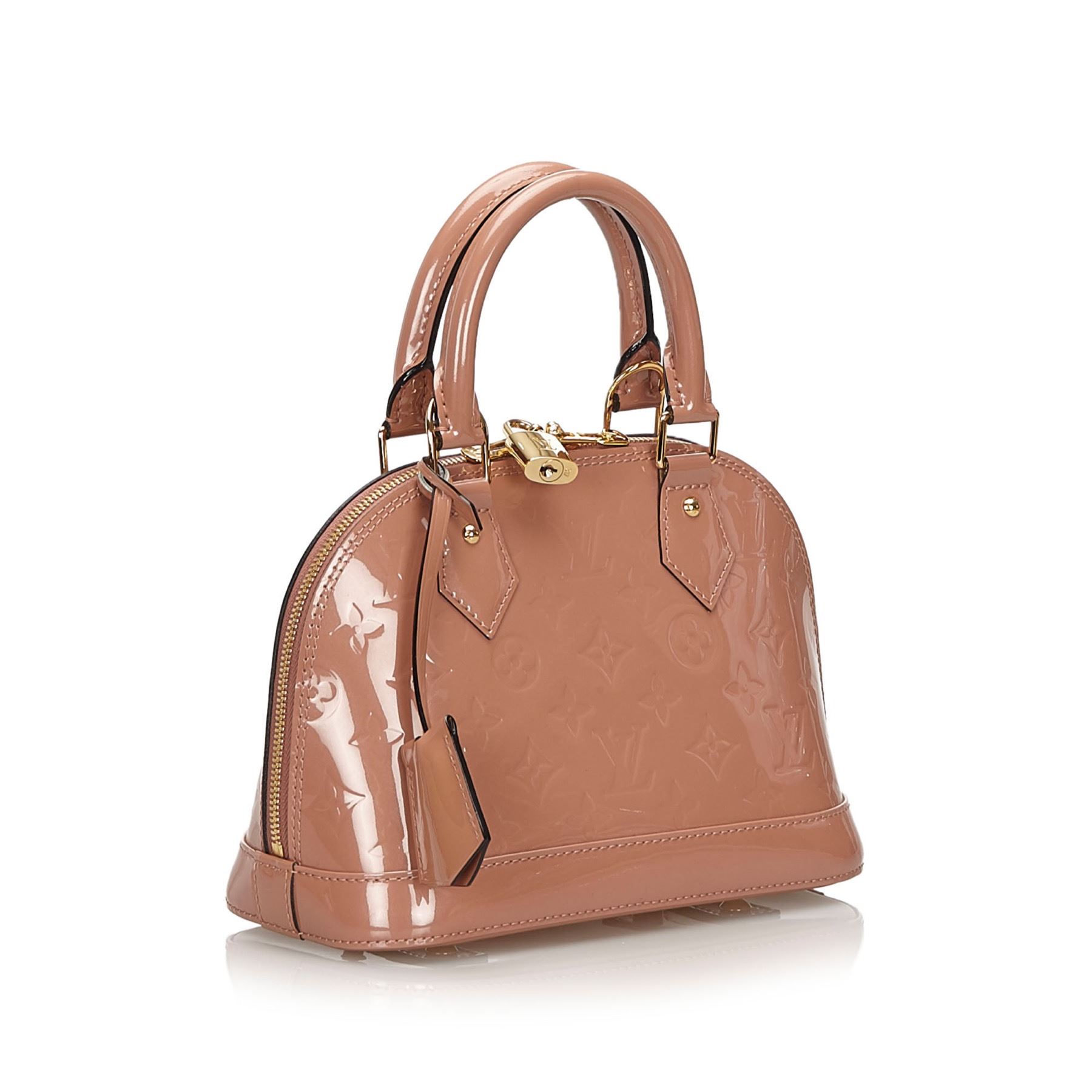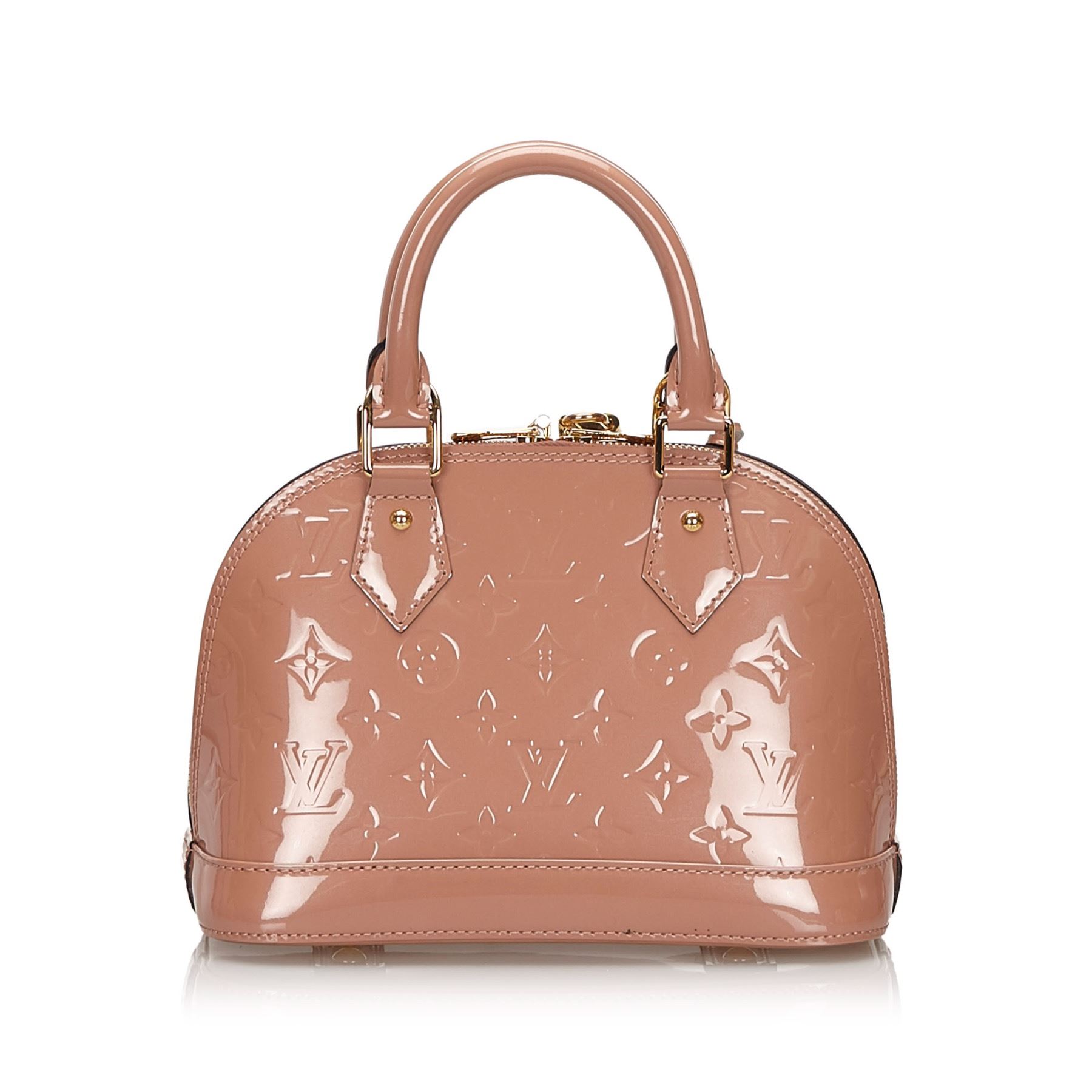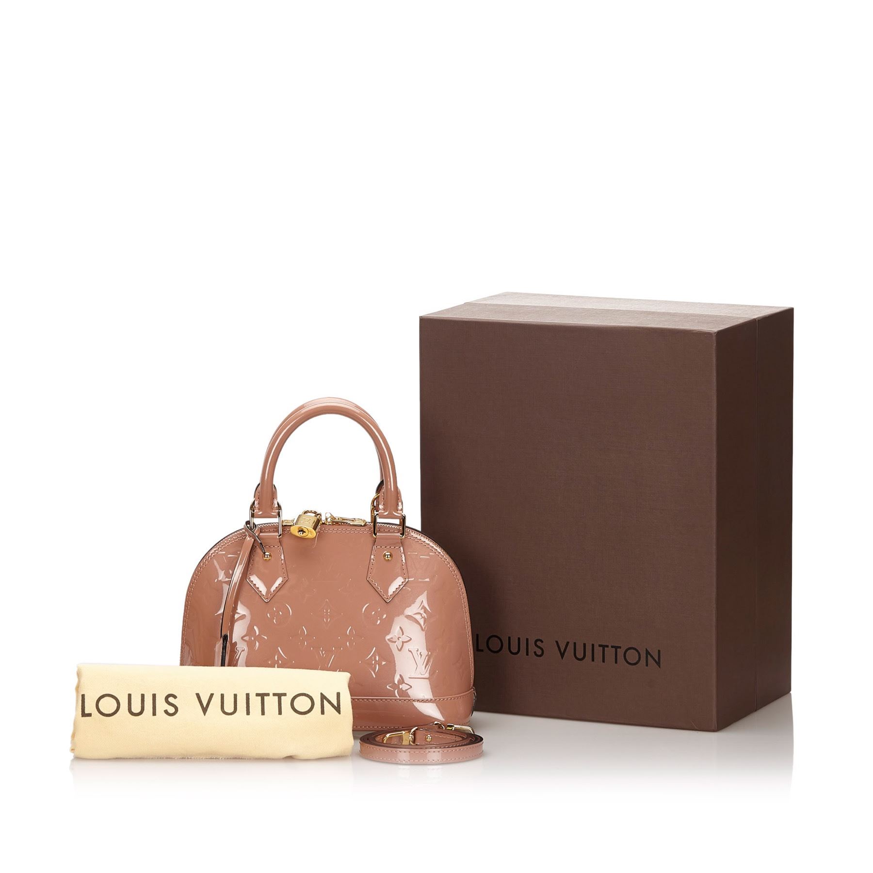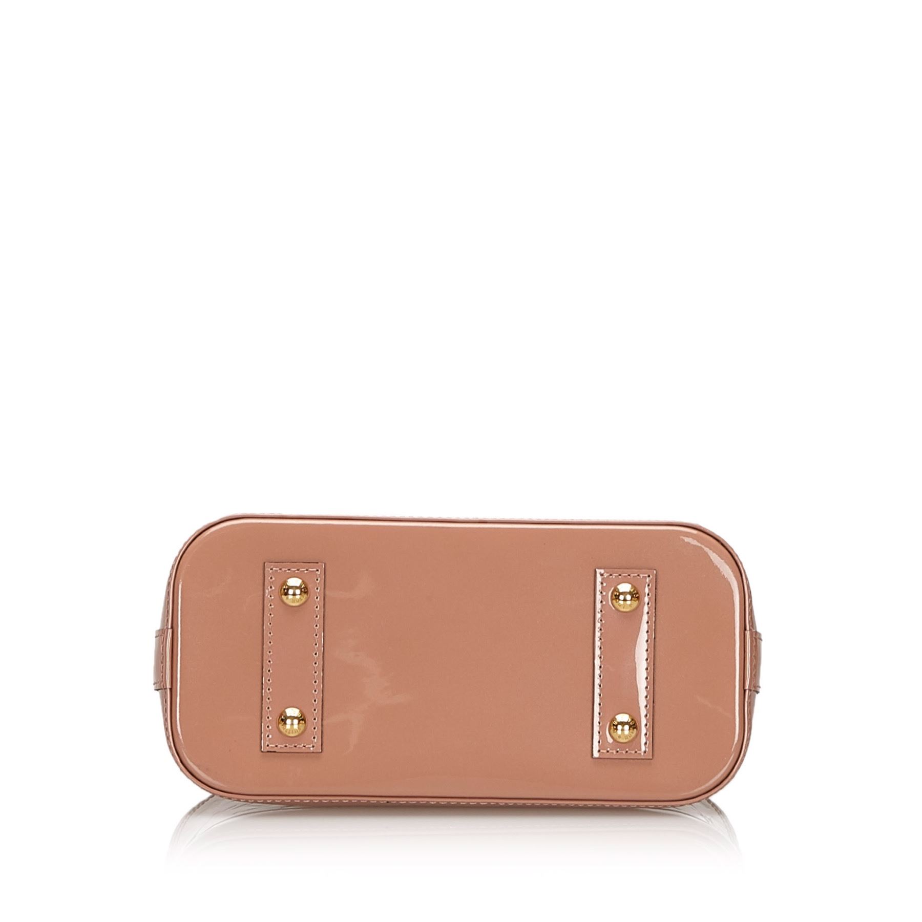 The Alma BB features a vernis leather body, rolled leather handles, a detachable flat leather strap, a top zip around closure, a clochette, and an interior slip pocket. Leather x Vernis Leather Pink Exterior back is stained. Exterior bottom is stained. Interior lining is stained. Studs is scratched. Size: 19 x 25 x 11 Card: NO. Louis Vuitton pieces do not come with an authenticity card—please refer to the production date code within the bag for its age and as an authenticity reference. Made in: France