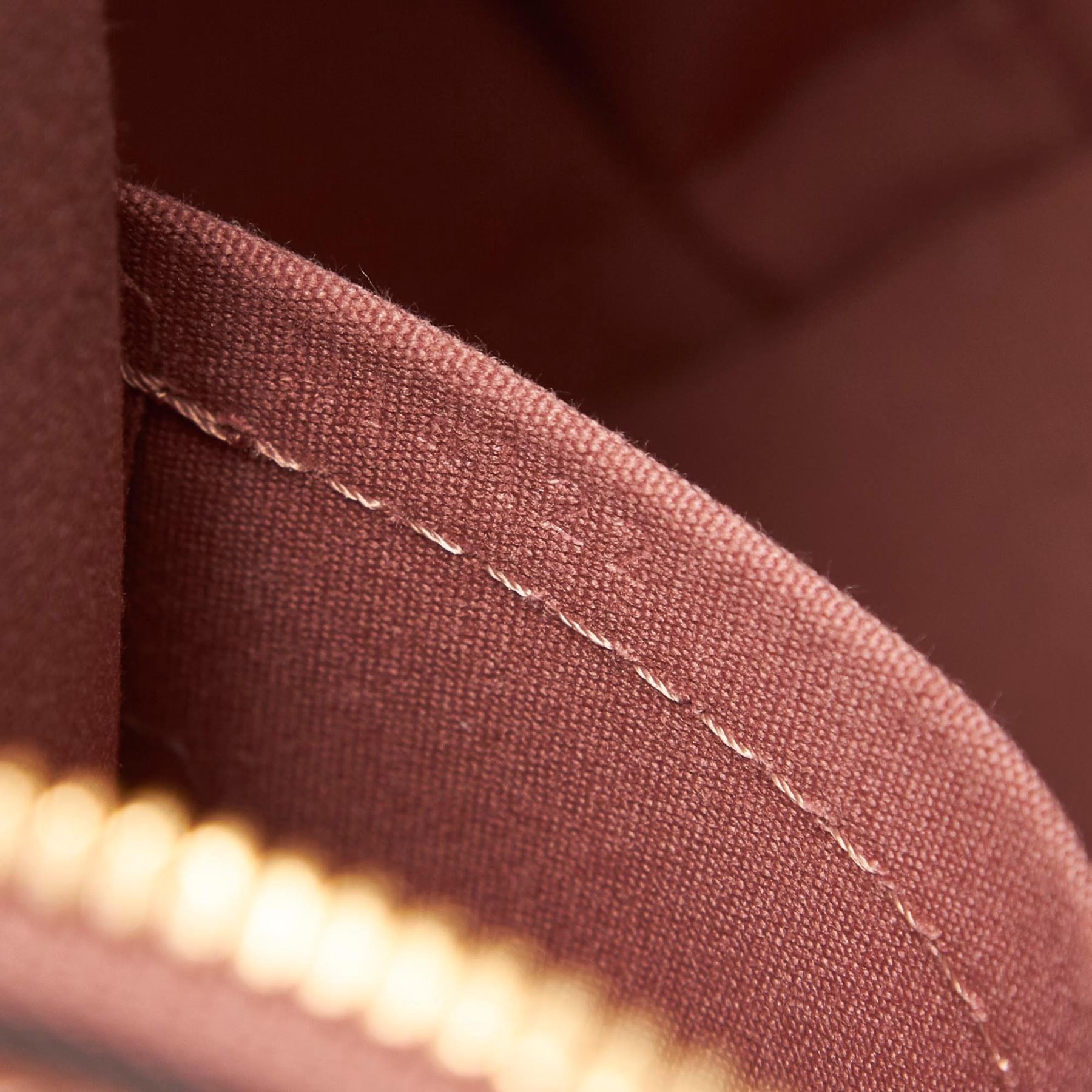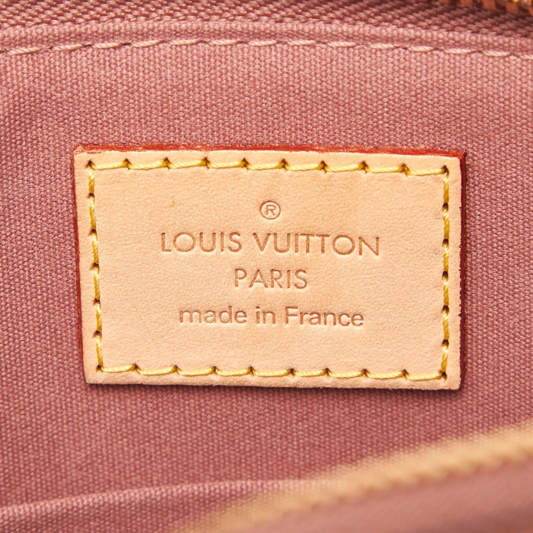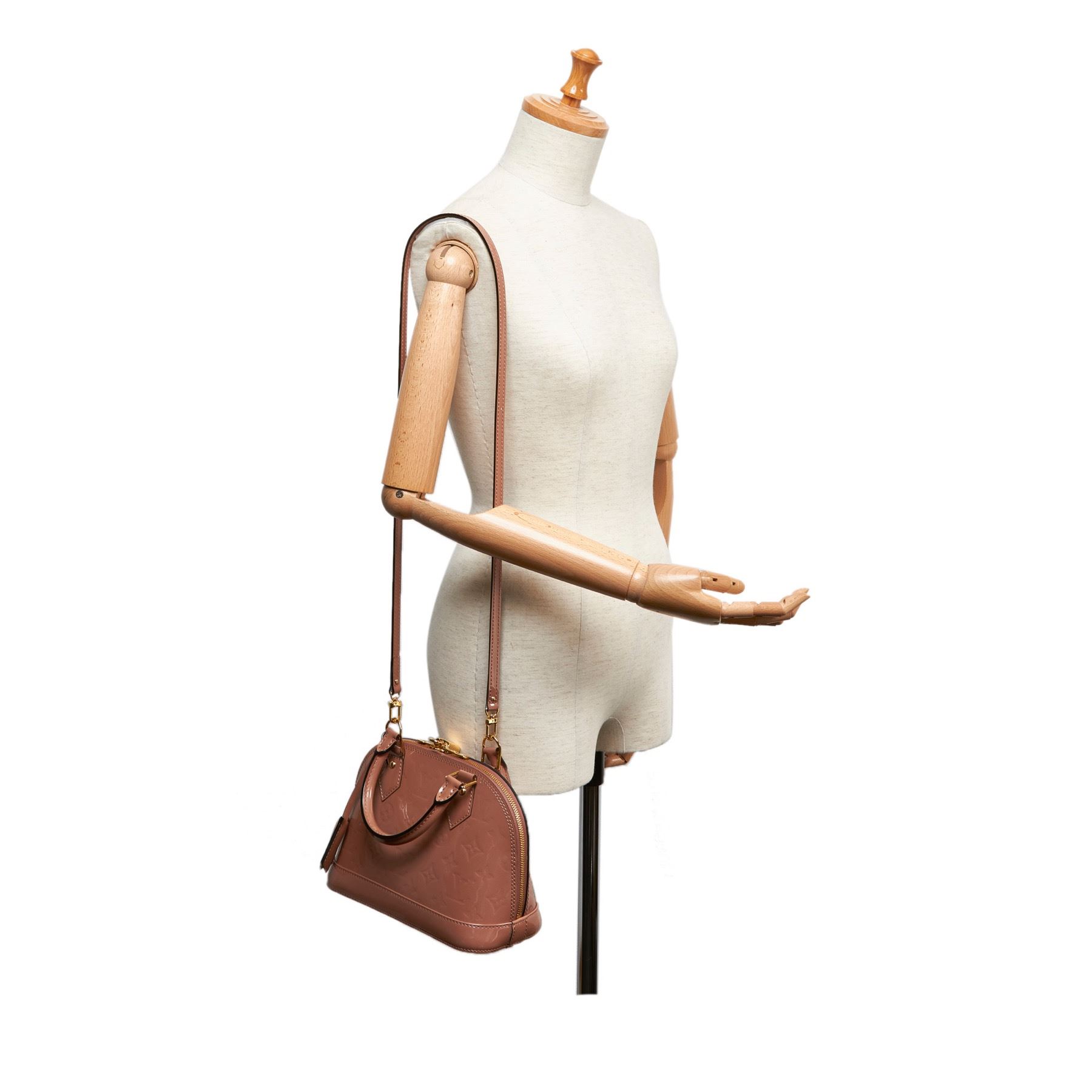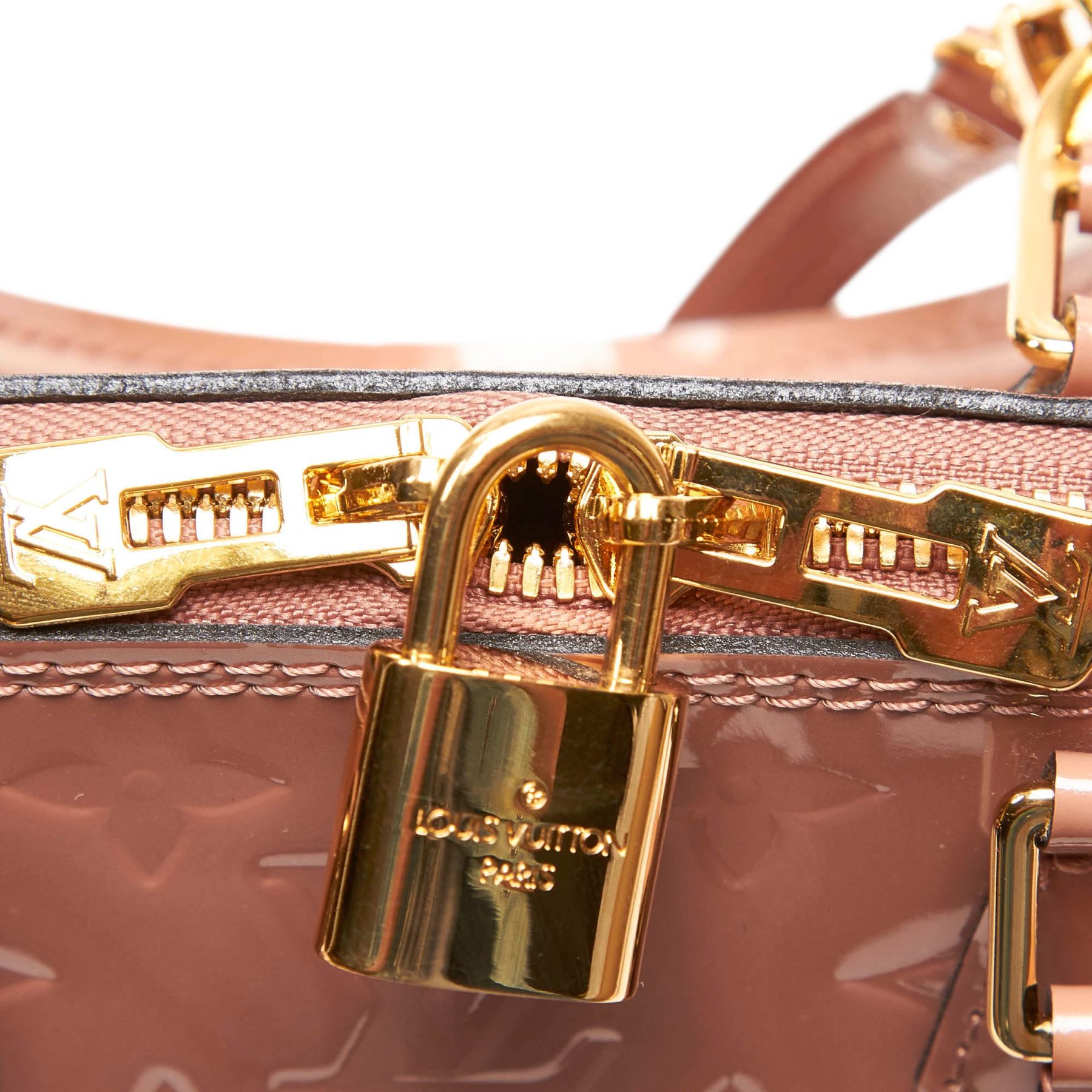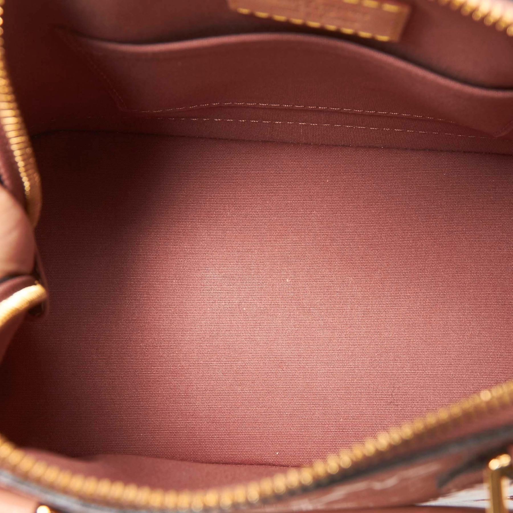The Alma BB features a vernis leather body, rolled leather handles, a detachable flat leather strap, a top zip around closure, a clochette, and an interior slip pocket. Leather x Vernis Leather Pink Exterior back is stained. Exterior bottom is stained. Interior lining is stained. Studs is scratched. Size: 19 x 25 x 11 Card: NO. Louis Vuitton pieces do not come with an authenticity card—please refer to the production date code within the bag for its age and as an authenticity reference. Made in: France
