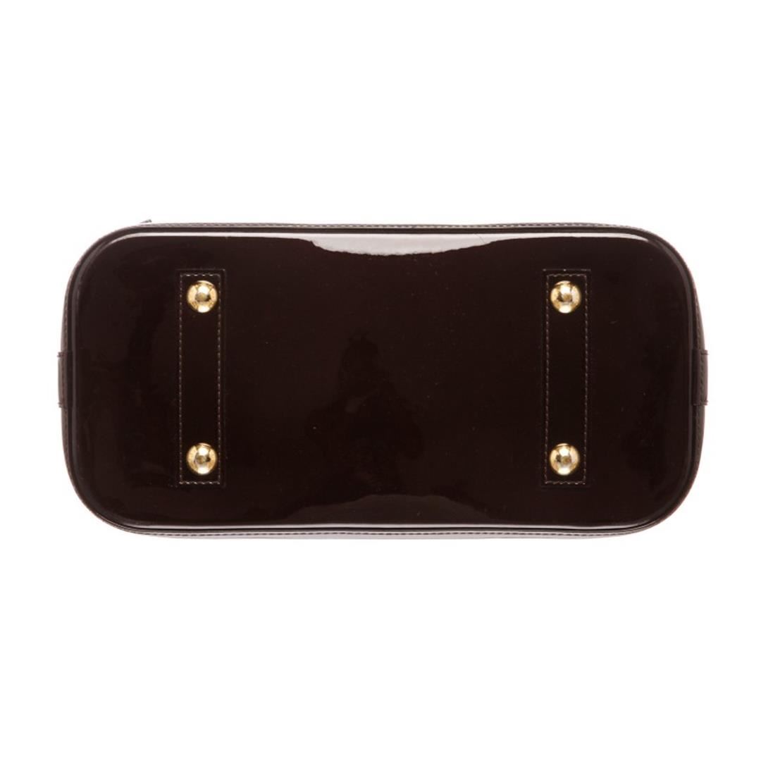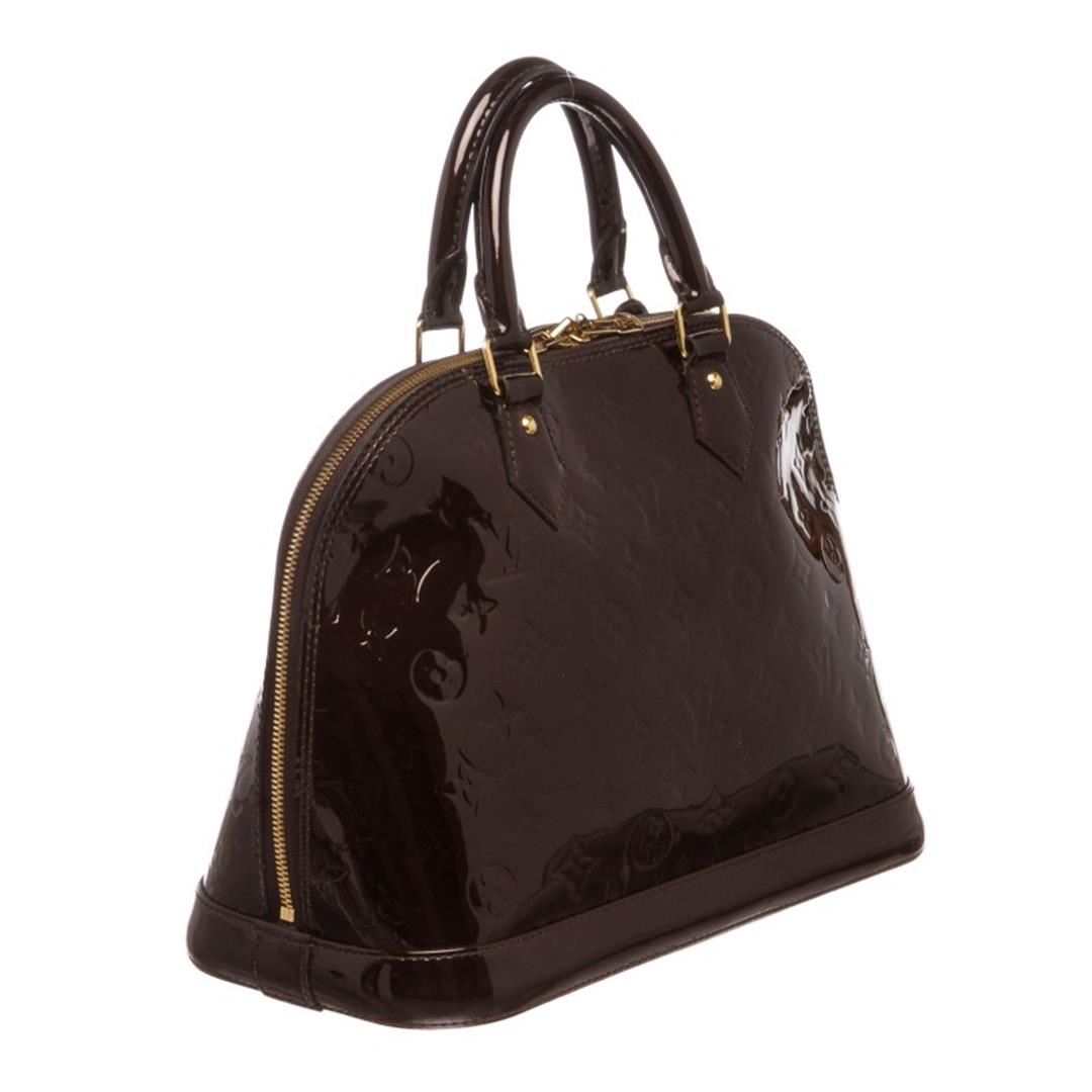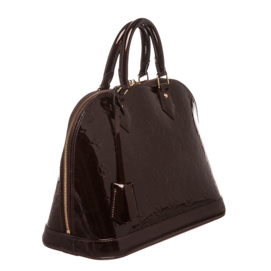 One Louis Vuitton Vernis Amarante Leather Monogram Alma PM Bag. Monogram Vernis leather Louis Vuitton Alma PM with brass hardware, dual rolled top handles, tonal canvas lining, dual interiorit pockets and two-way zip closure at top. Item is pre-owned.