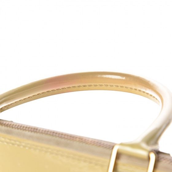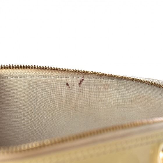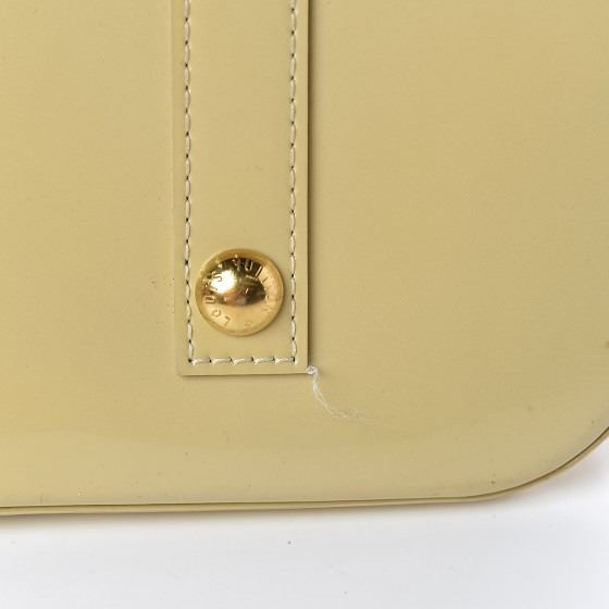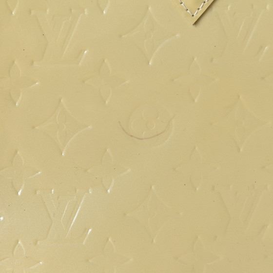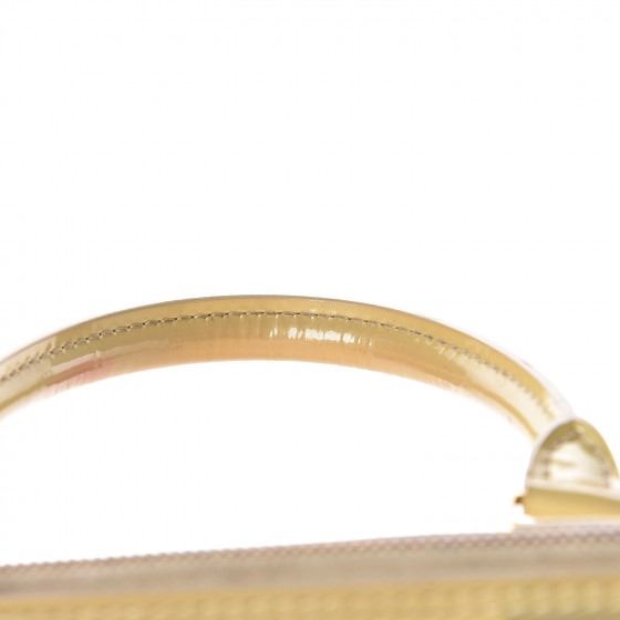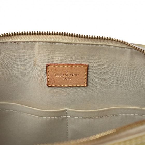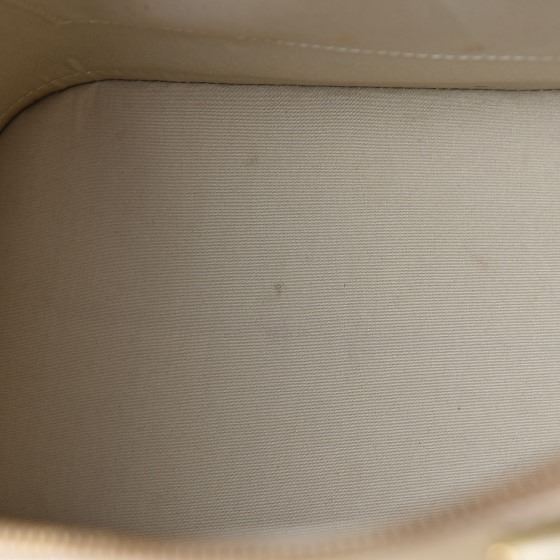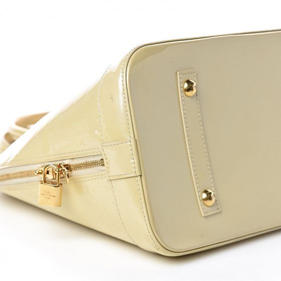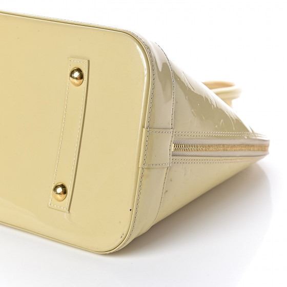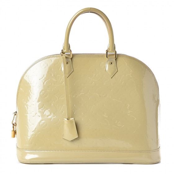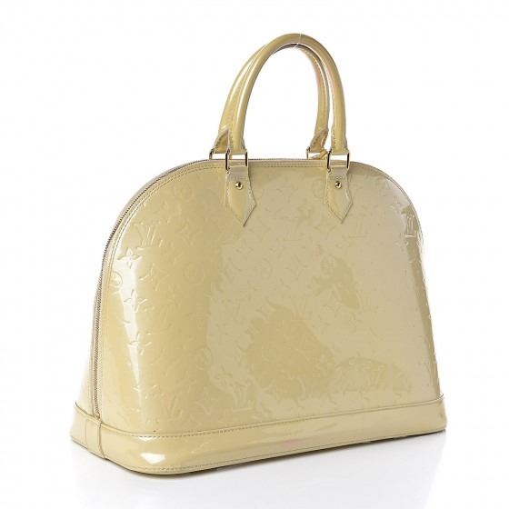 The tote is a medium-sized classic Alma with a new interpretation. The bag features signature Louis Vuitton monogram-embossed patent leather in ivory, rolled leather top handles, and wrap-around polished brass zippers that open the bag to an interior of matching ivory fabric.