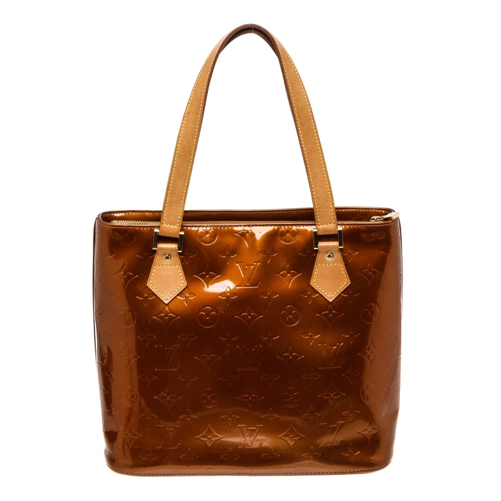 Bronze Vernis leather Louis Vuitton Houston tote with gold-tone hardware, tan Vachetta trim, tonal stitching, dual flat shoulder straps, tonal leather lining, three pockets at interior walls, single zip pocket and zip closure at top.