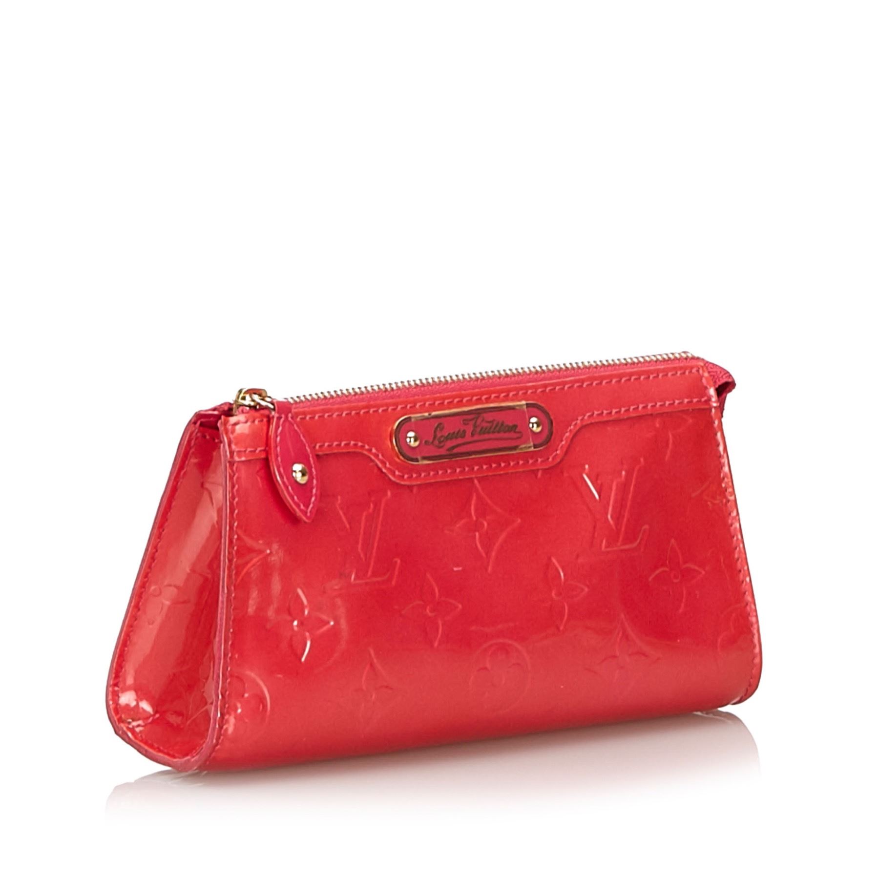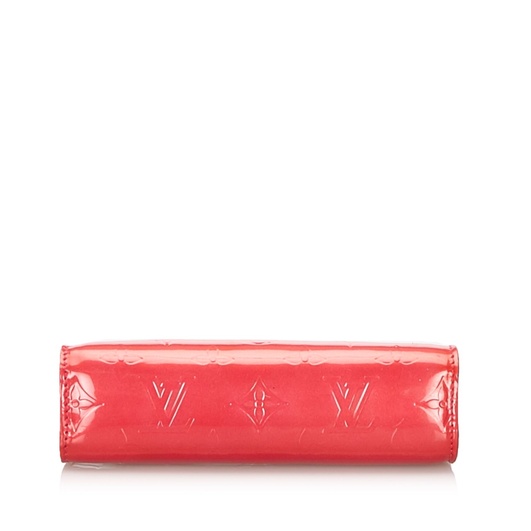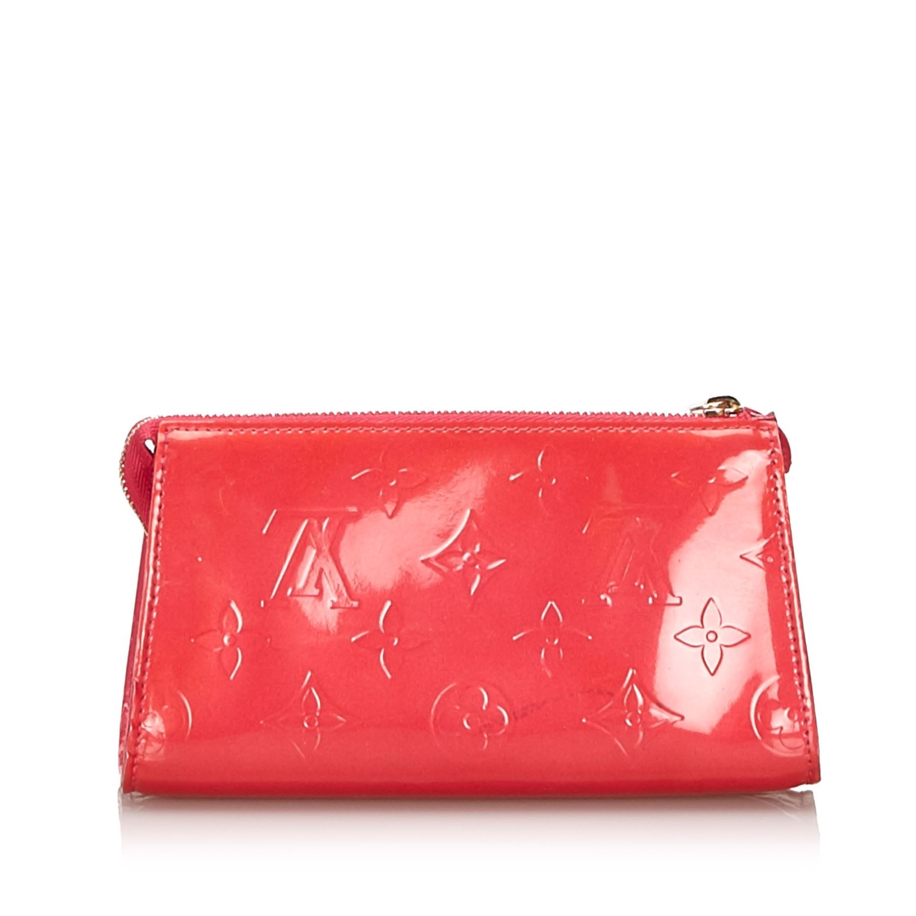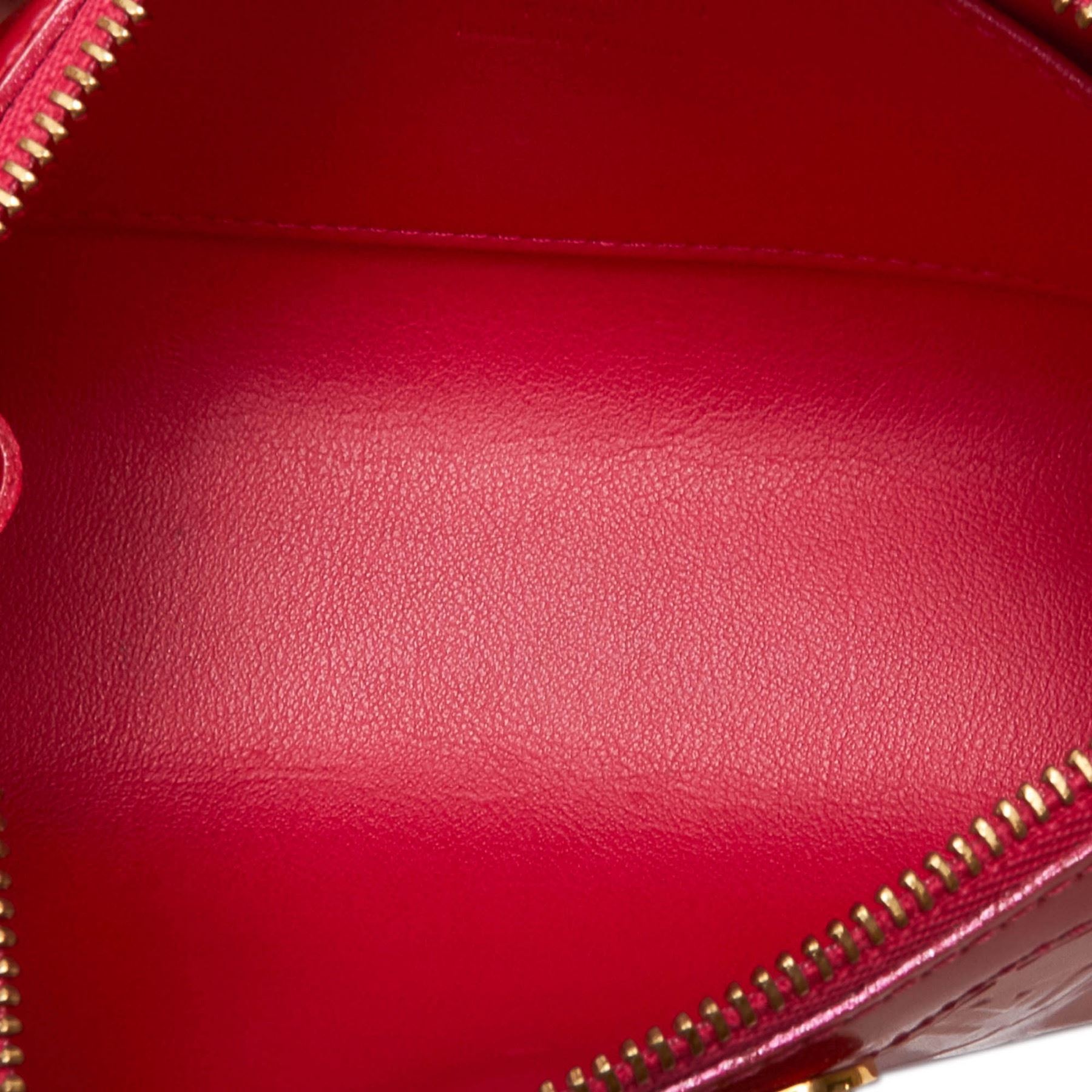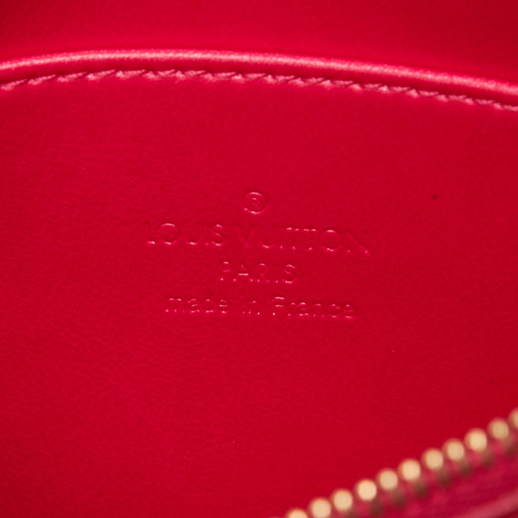 The Trousse Cosmetic Pouch features a vernis leather body and a top zip closure. Leather x Vernis Leather Pink Exterior front is scratched. Exterior back is stained. Exterior bottom is scratched. Exterior corners is scratched. Exterior side is stained. Size: 9.5 x 17 x 6 Card: NO. Louis Vuitton pieces do not come with an authenticity card—please refer to the production date code within the bag for its age and as an authenticity reference. Made in: France