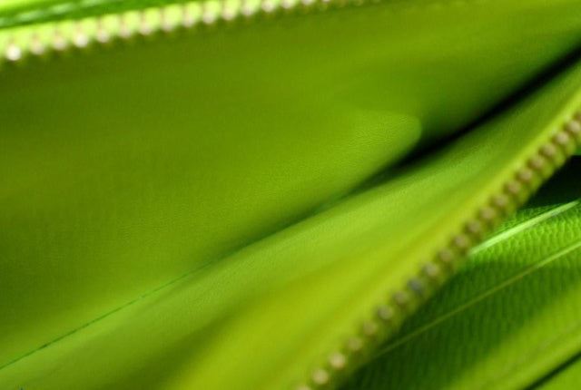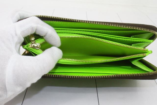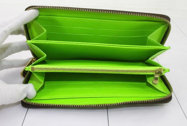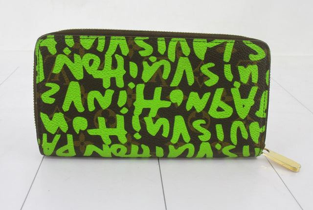 Louis Vuitton Zippy wallet features the brown Monogram coated canvas with the iconic pattern overlaid with fluorescent green graffiti. With eight card slots, one zip coin pocket, three gusseted pockets, three flat pockets, matching green cross-grain linin