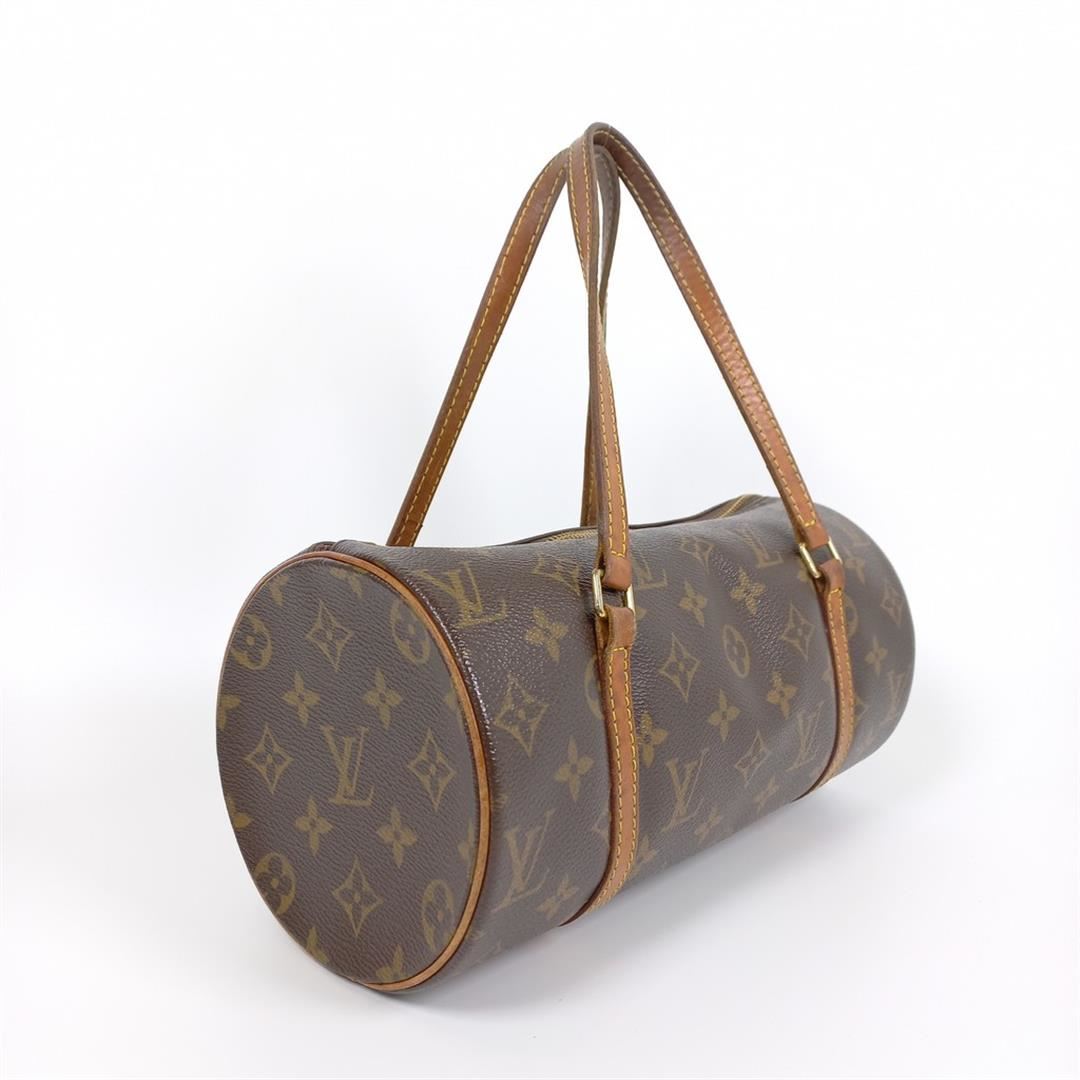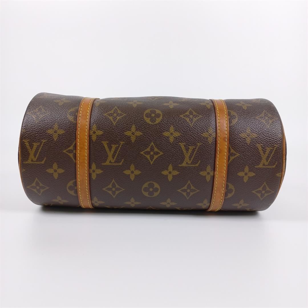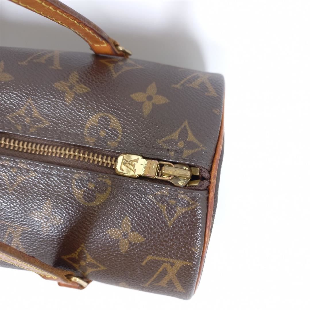 Brown and tan monogram coated canvas Louis Vuitton Vintage Papillon 26 with gold-tone hardware, brown Taiga leather trim, dual flat handles, brown Taiga leather lining and zip closure at top. 10"x5.25"x5.25"xBag Drop:4"/26cmx13.3cmx13.3cmxBag Drop:10.1c