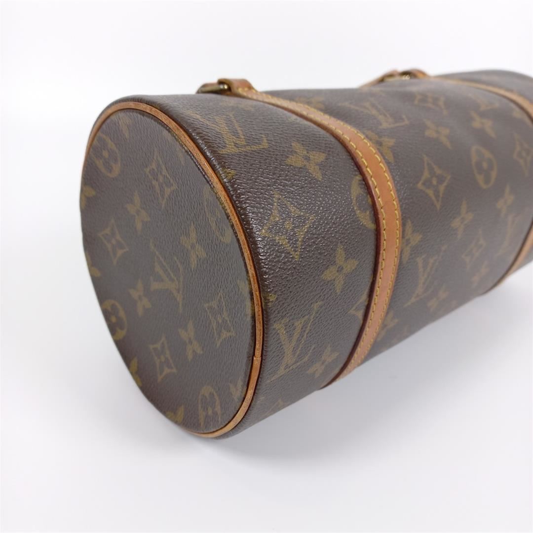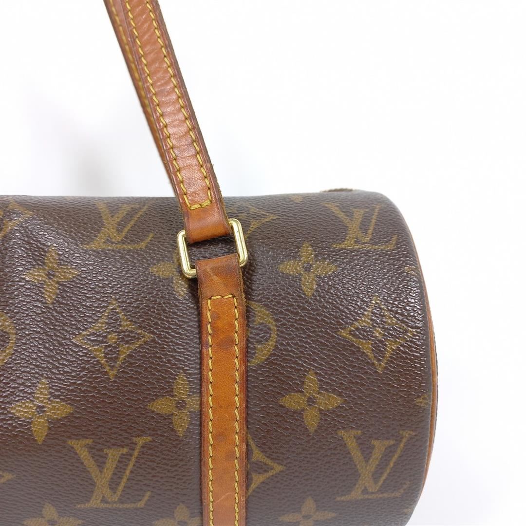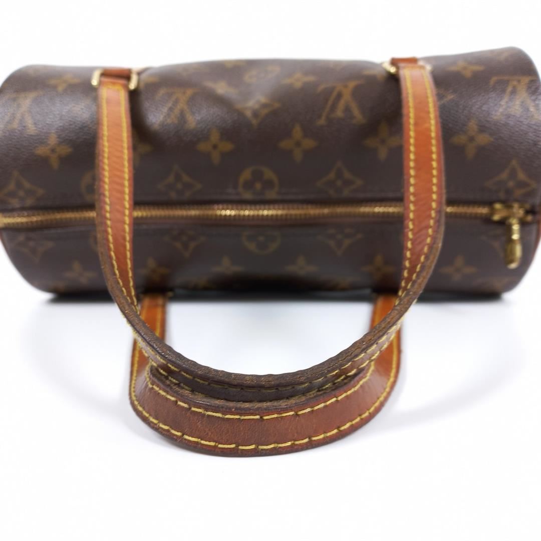 Brown and tan monogram coated canvas Louis Vuitton Vintage Papillon 26 with gold-tone hardware, brown Taiga leather trim, dual flat handles, brown Taiga leather lining and zip closure at top. 10"x5.25"x5.25"xBag Drop:4"/26cmx13.3cmx13.3cmxBag Drop:10.1c