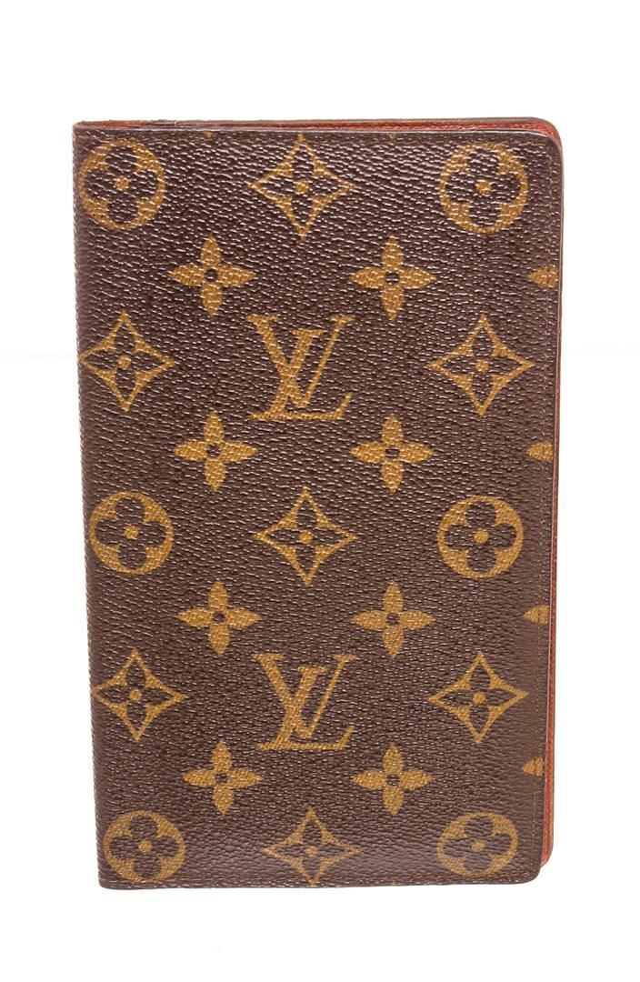 Vintage brown and tan monogram coated canvas Louis Vuitton vintage checkbook holder wallet with brown textured leather lining, three bill compartments and six card slots.