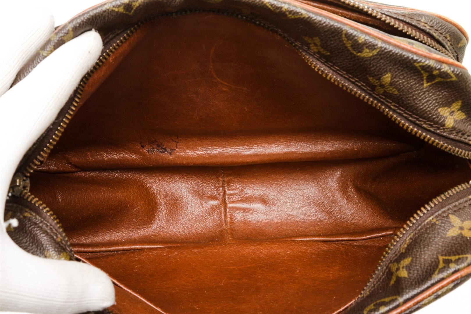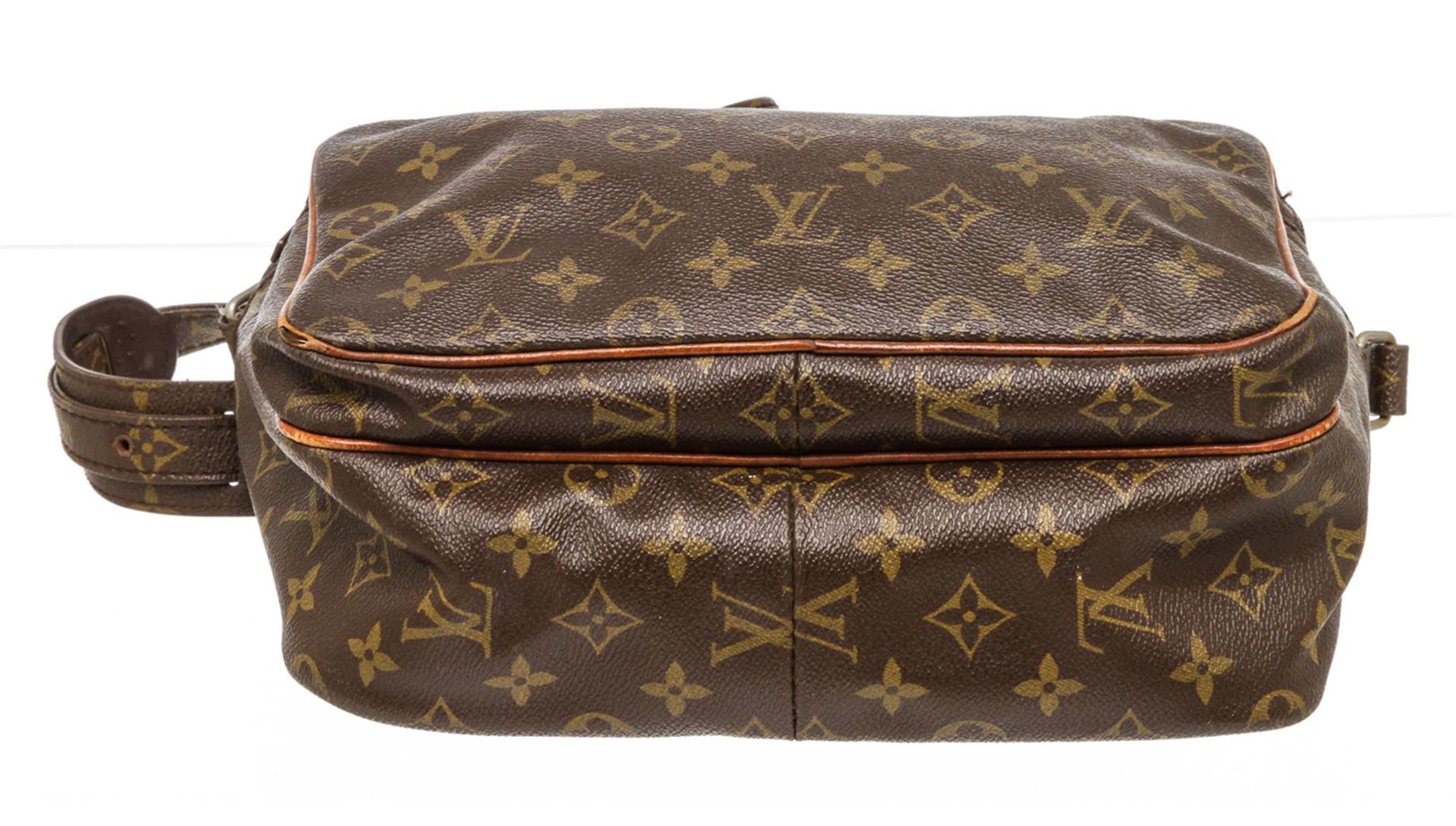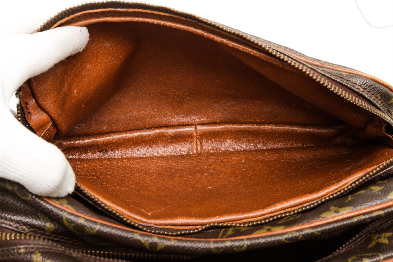 Brown and tan monogram coated canvas Louis Vuitton Vintage Nile bag with brass hardware, tan vachetta leather trim, single flat shoulder strap featuring shoulder pad, exterior zip pocket at front, brown Taiga leather lining, single zip pocket at interior wall and zip closure at top.
