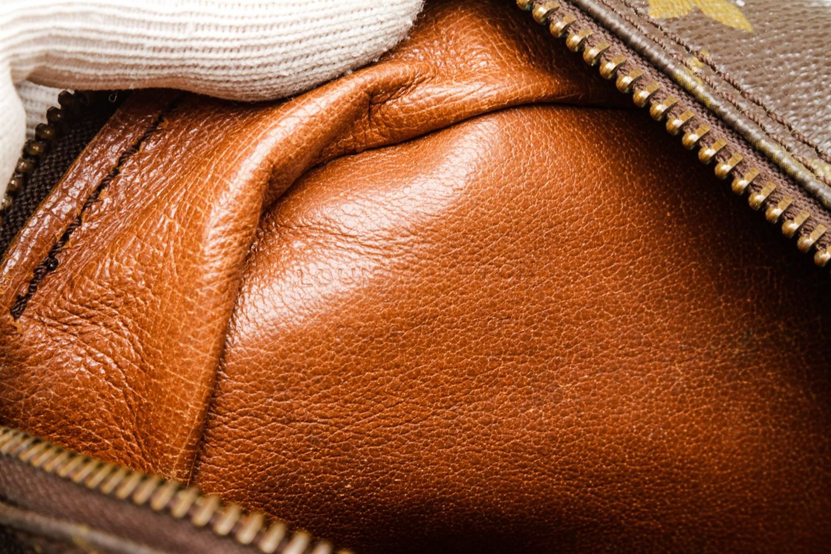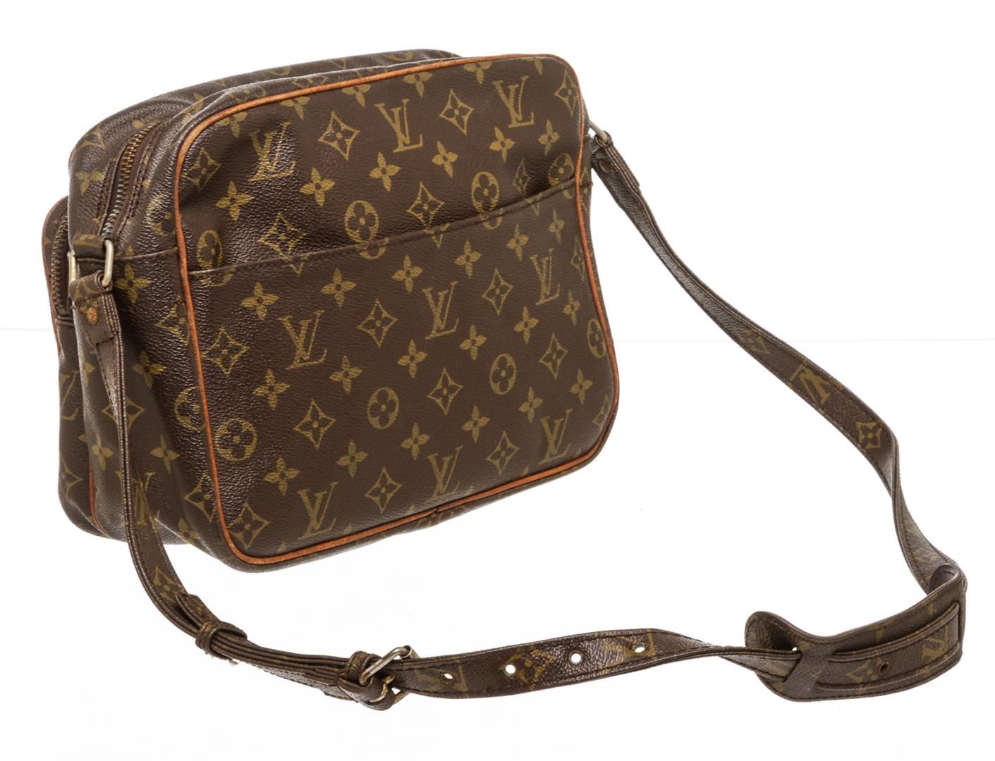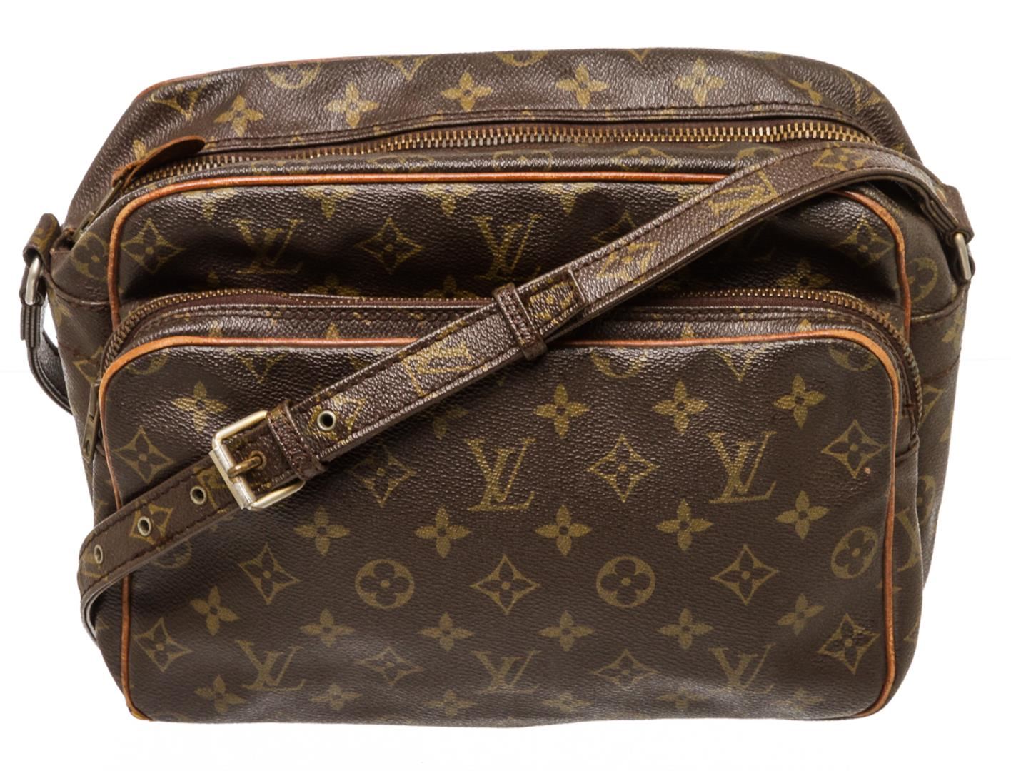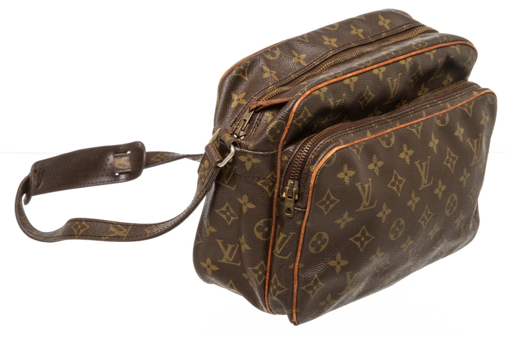 Brown and tan monogram coated canvas Louis Vuitton Vintage Nile bag with brass hardware, tan vachetta leather trim, single flat shoulder strap featuring shoulder pad, exterior zip pocket at front, brown Taiga leather lining, single zip pocket at interior wall and zip closure at top.