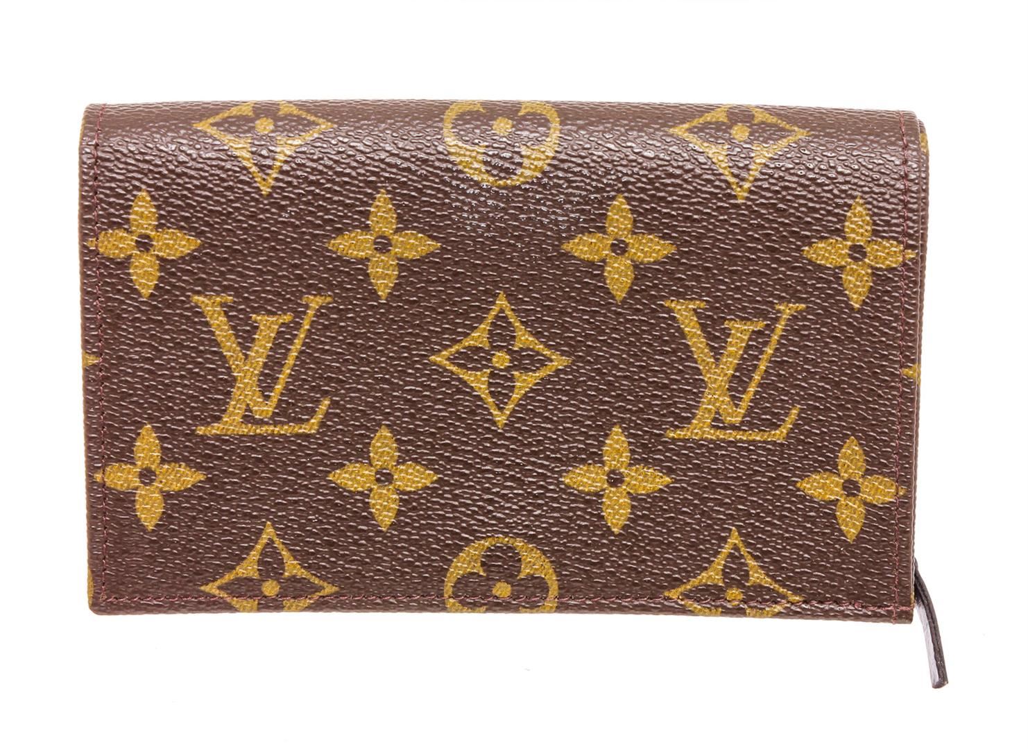 Brown and tan monogram coated canvas Louis Vuitton Vintage Porte-Monnaie Billets Tresor wallet with brass hardware, four interior compartments; two with zip closure, brown leather lining, dual slip pockets at flap underside and snap closure at front flap.