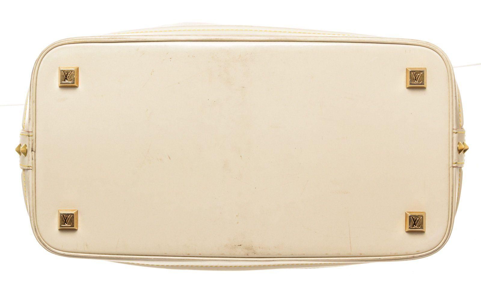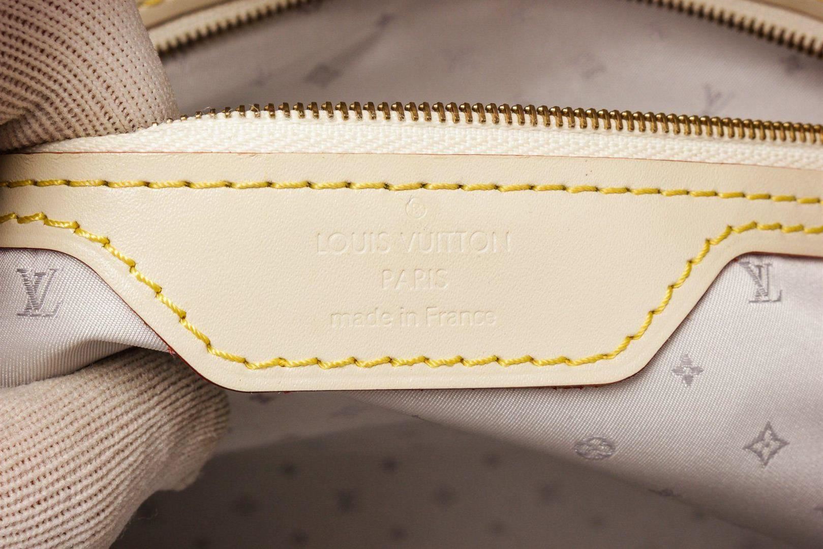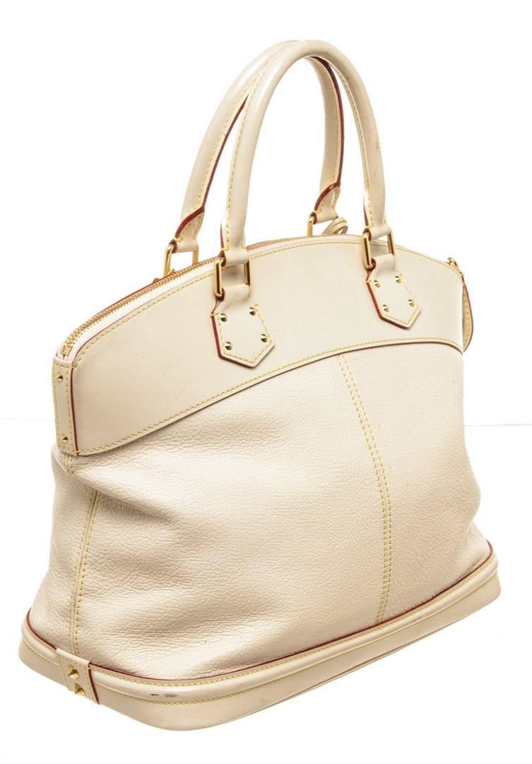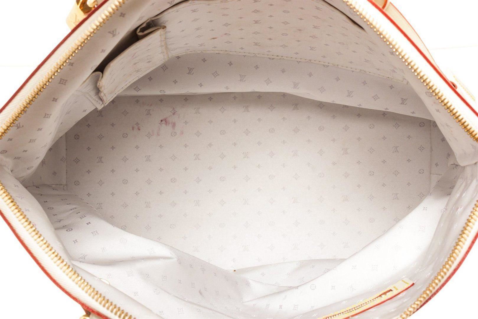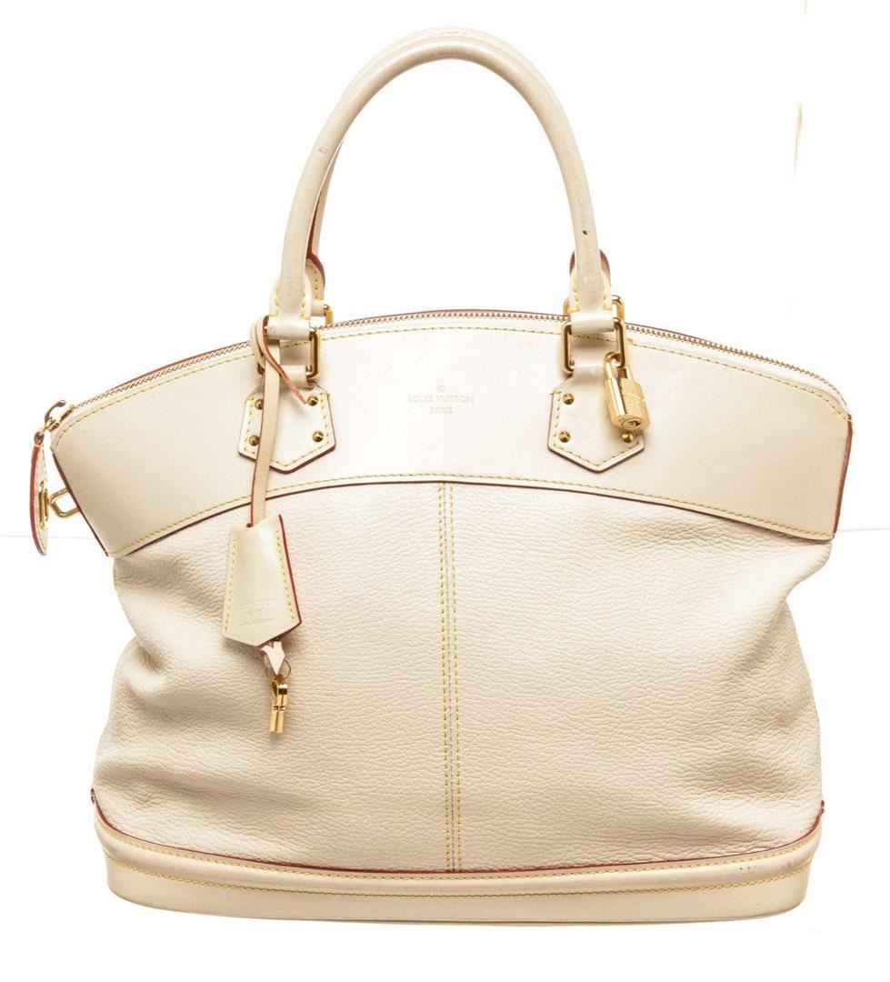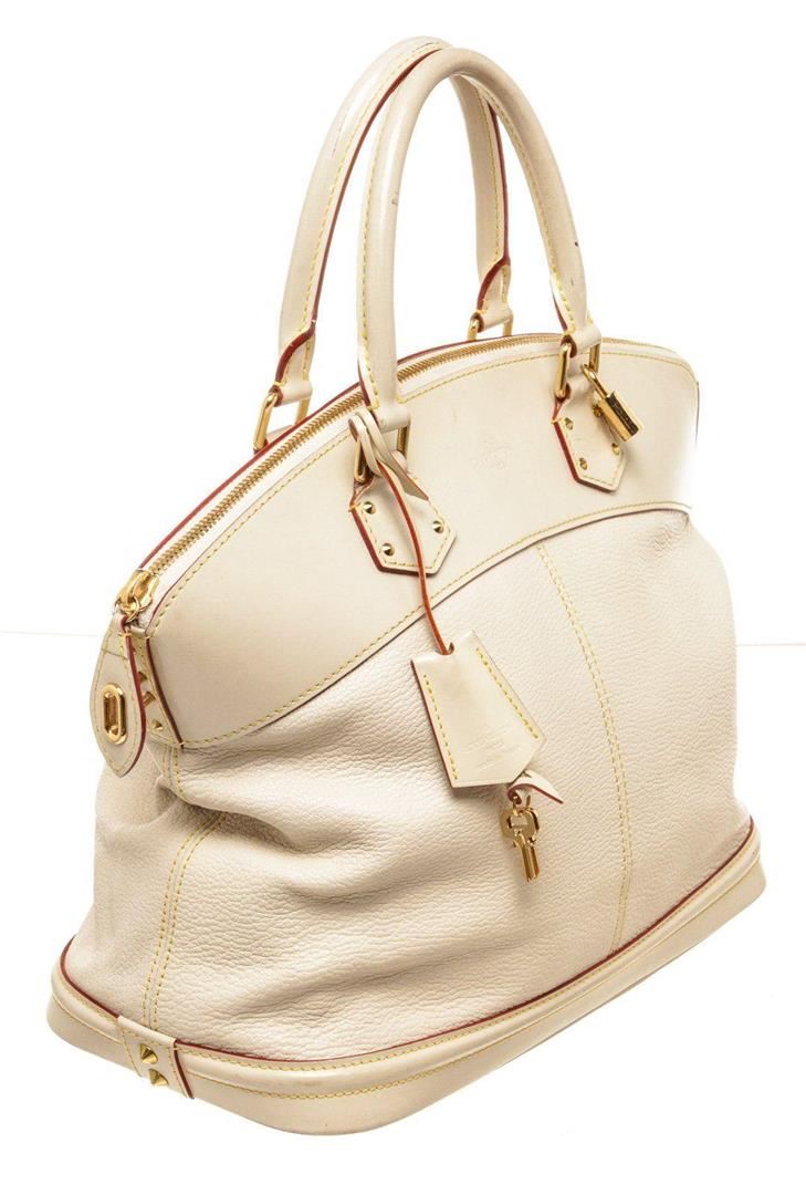Louis Vuitton White Canvas Leather Lockit MM Satchel Bag with material canvas leather, brass hardware, dual rolled top handles, tonal jacquard lining, three pockets at interior; one with zip closure and zip closure at top. Includes dust bag, lock, keys, a