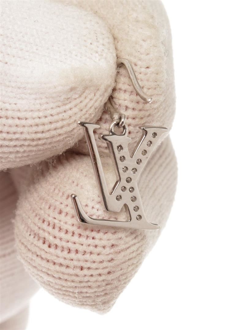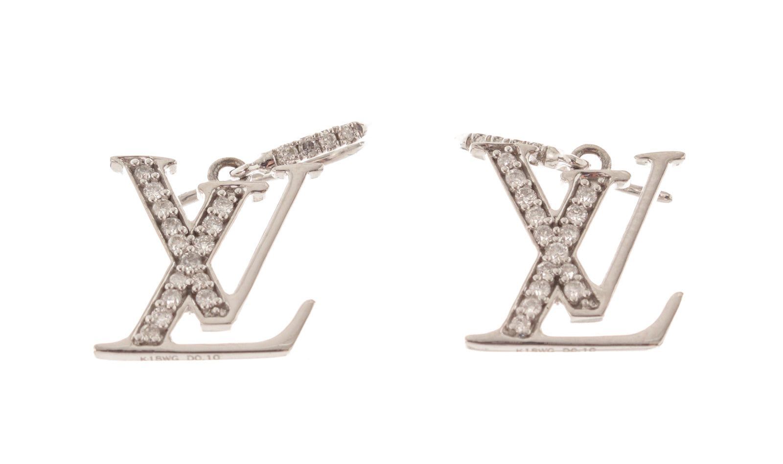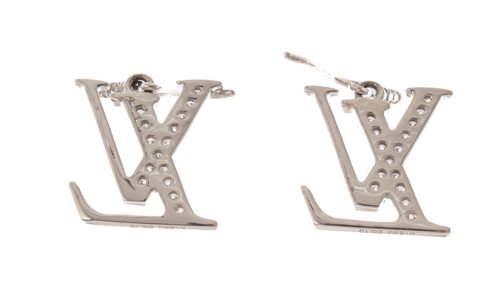 Louis Vuitton White Gold Logo Rhinestone Earrings features white gold hardware, Louis Vuitton logo, and rhinestones.