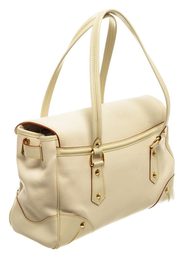 One Louis Vuitton White Leather Le Absolu Handbag. Item is sold AS-IS. All available information is listed in the description and shown in the photo. Louis Vuitton White Leather Le Absolu Handbag with top handle, fabric lining, gold tone hardware, snap closure.