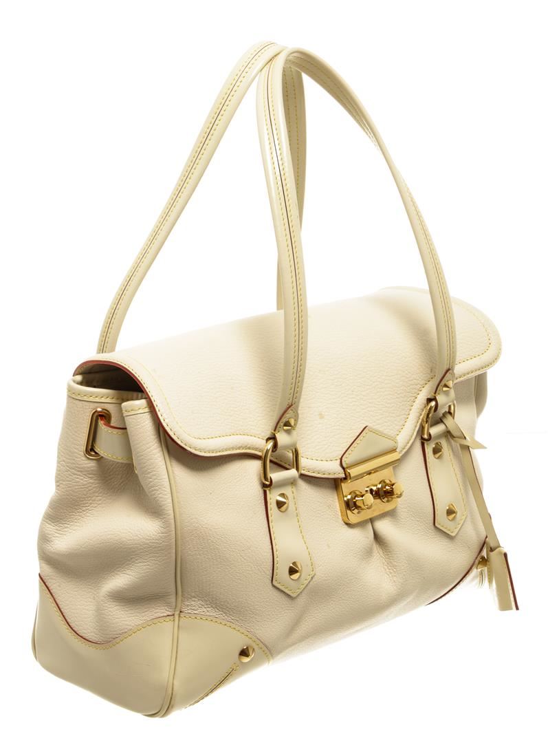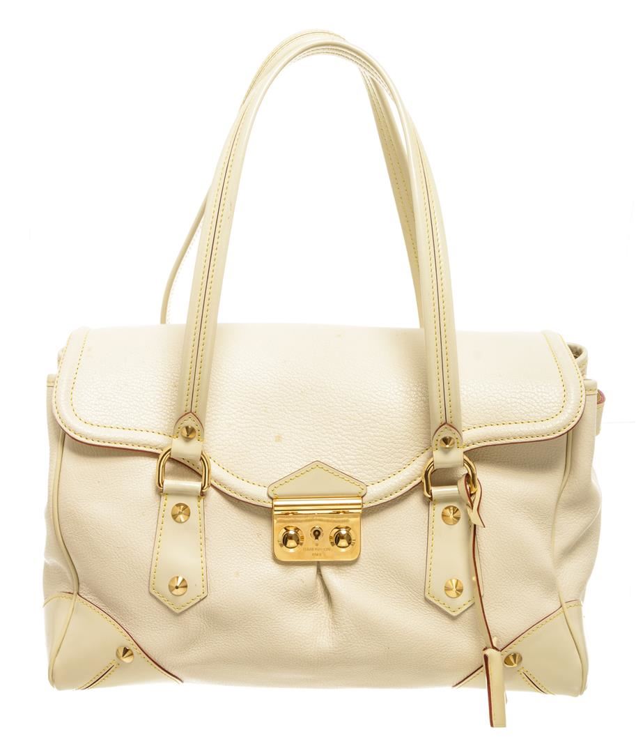 One Louis Vuitton White Leather Le Absolu Handbag. Item is sold AS-IS. All available information is listed in the description and shown in the photo. Louis Vuitton White Leather Le Absolu Handbag with top handle, fabric lining, gold tone hardware, snap closure.