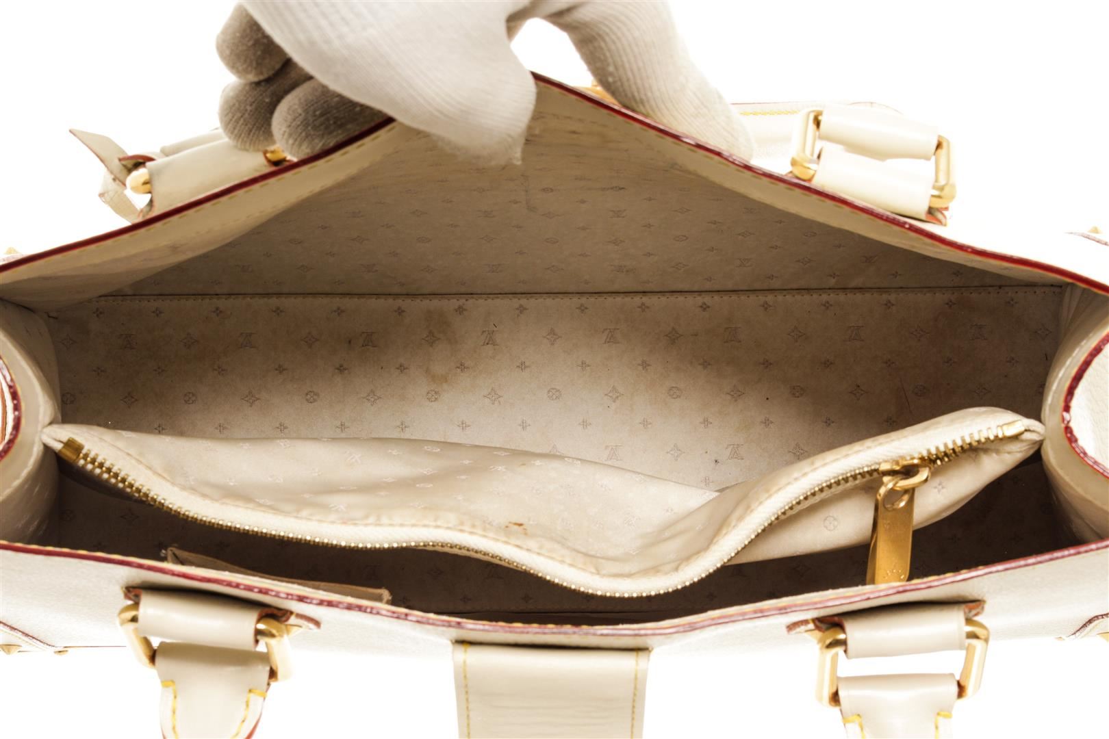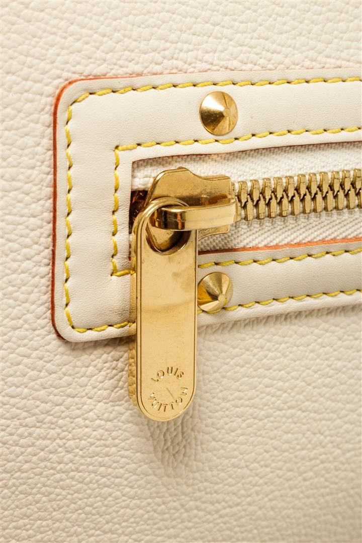 One Louis Vuitton White Leather Le Fabuleux Shoulder Bag. Item is sold AS-IS. All available information is listed in the description and shown in the photo. Louis Vuitton White Leather Le Fabuleux Shoulder Bag with top handle, exterior zipper pocket, fabric lining, zipper interior pocket, snap closure.