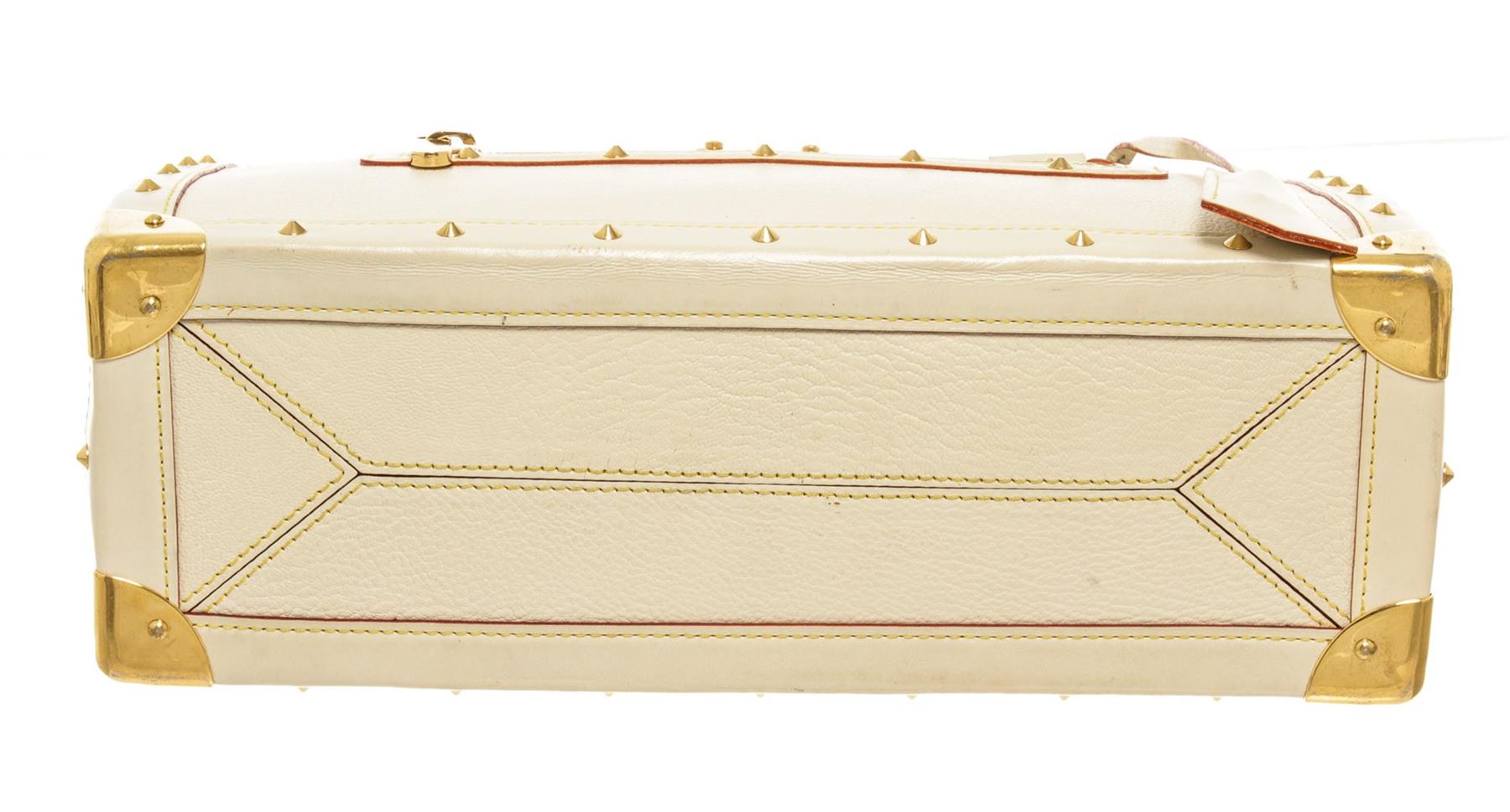 One Louis Vuitton White Leather Le Fabuleux Shoulder Bag. Item is sold AS-IS. All available information is listed in the description and shown in the photo. Louis Vuitton White Leather Le Fabuleux Shoulder Bag with top handle, exterior zipper pocket, fabric lining, zipper interior pocket, snap closure.