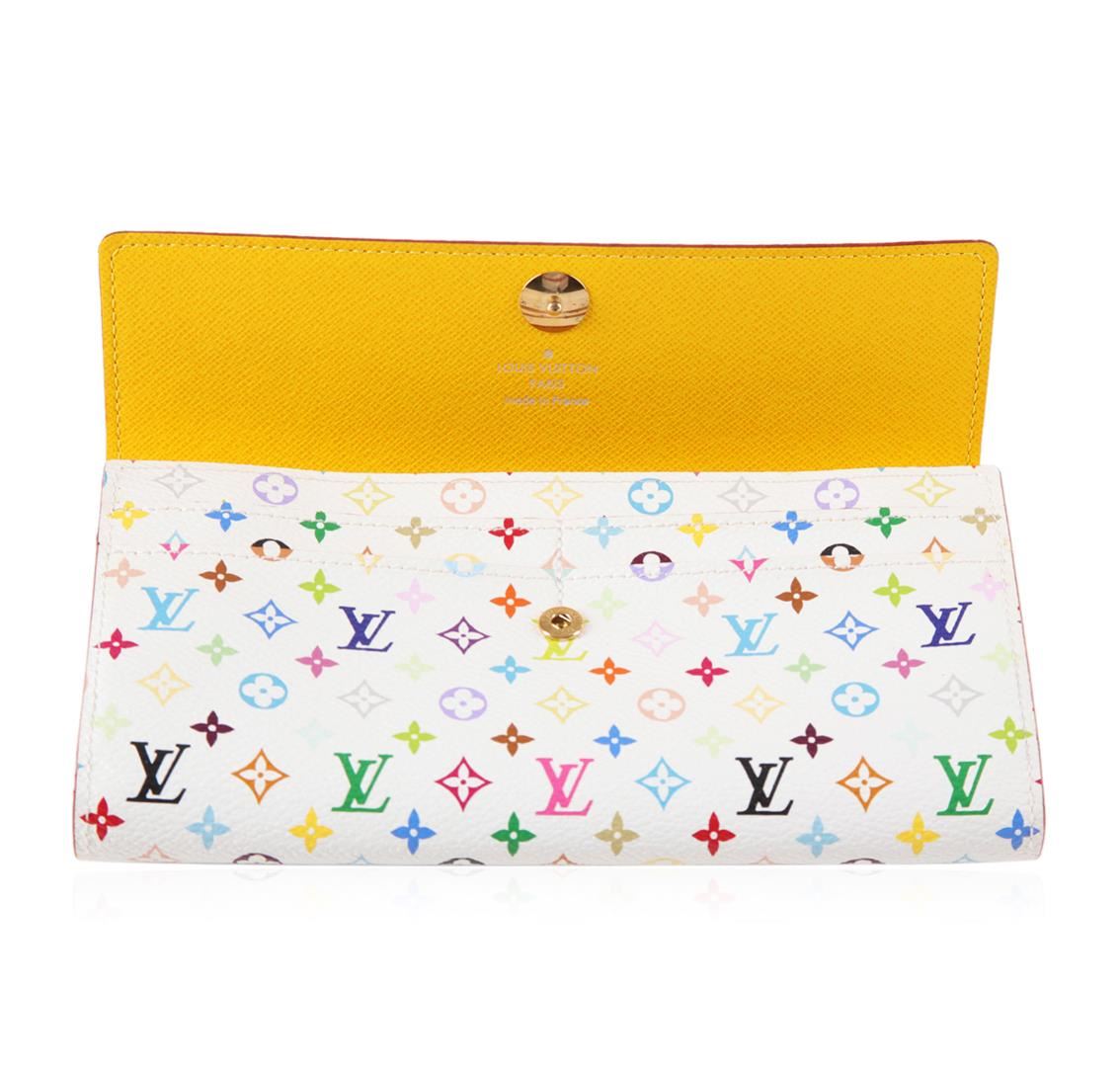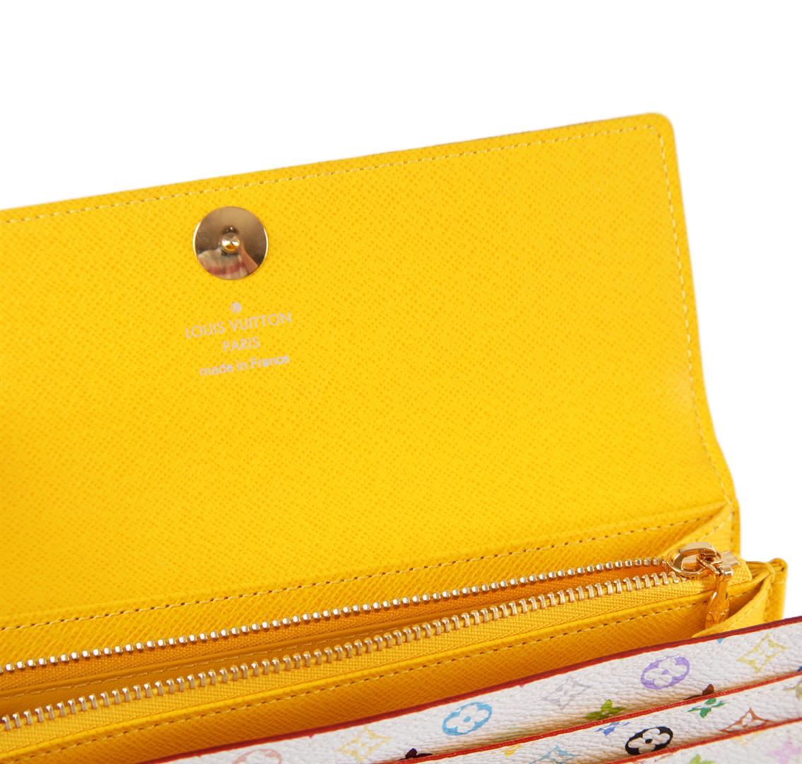 One Louis Vuitton white leather multicolor monogram wallet, measuring 19cm by 10.5cm by 2cm. The wallet is in good condition and features three large slots for bills, a zippered coin purse, four small pockets on the front under the flap and six slots for credit cards. Comes with a Louis Vuitton cover bag and box.