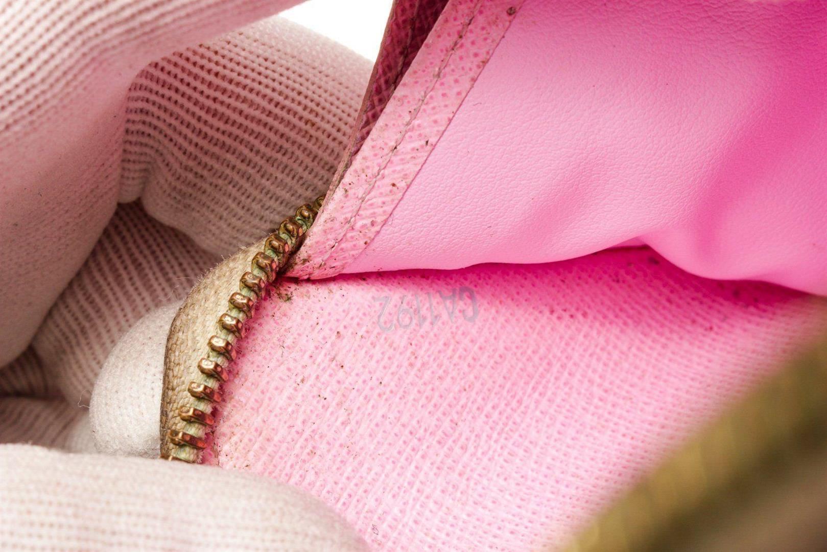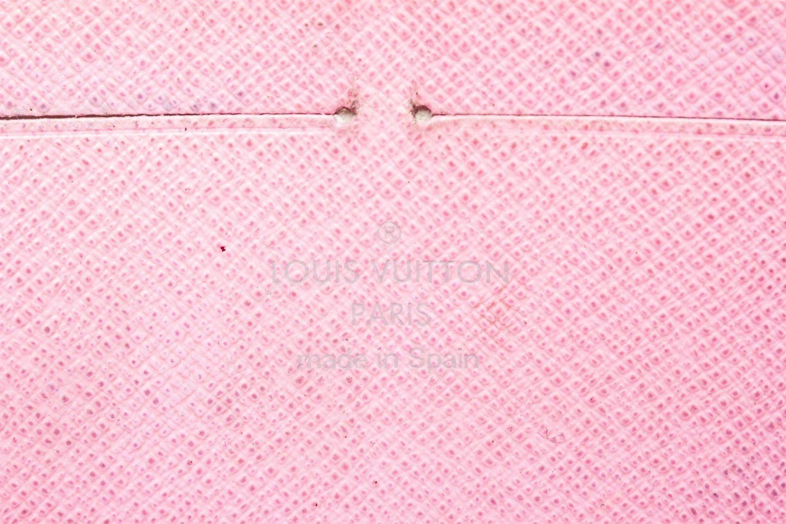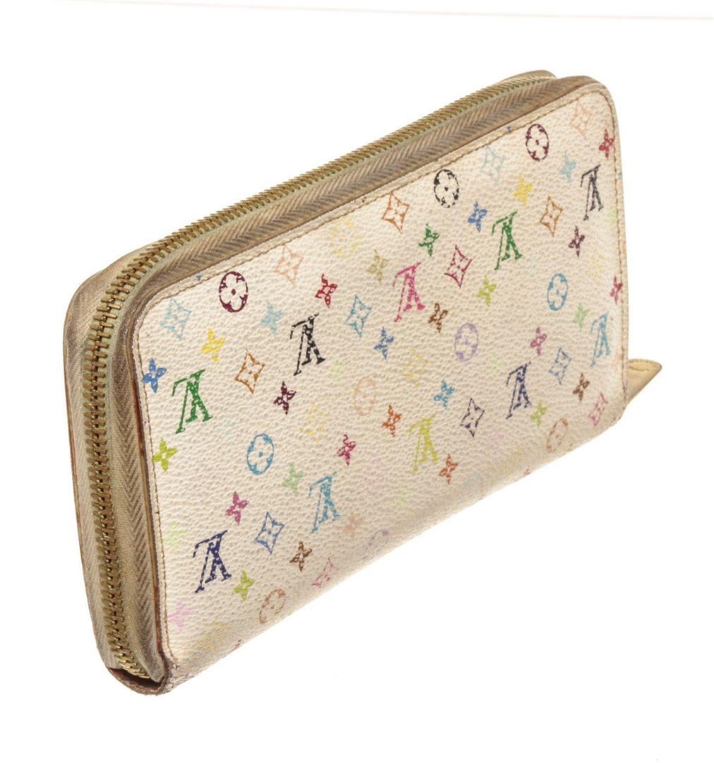 Louis Vuitton White Monogram Canvas Zippy Wallet with monogram canvas, gold-tone hardware, pink leather lining, eight card slots and three bill compartments at interior walls, middle zip coin compartment and zip-around closure.