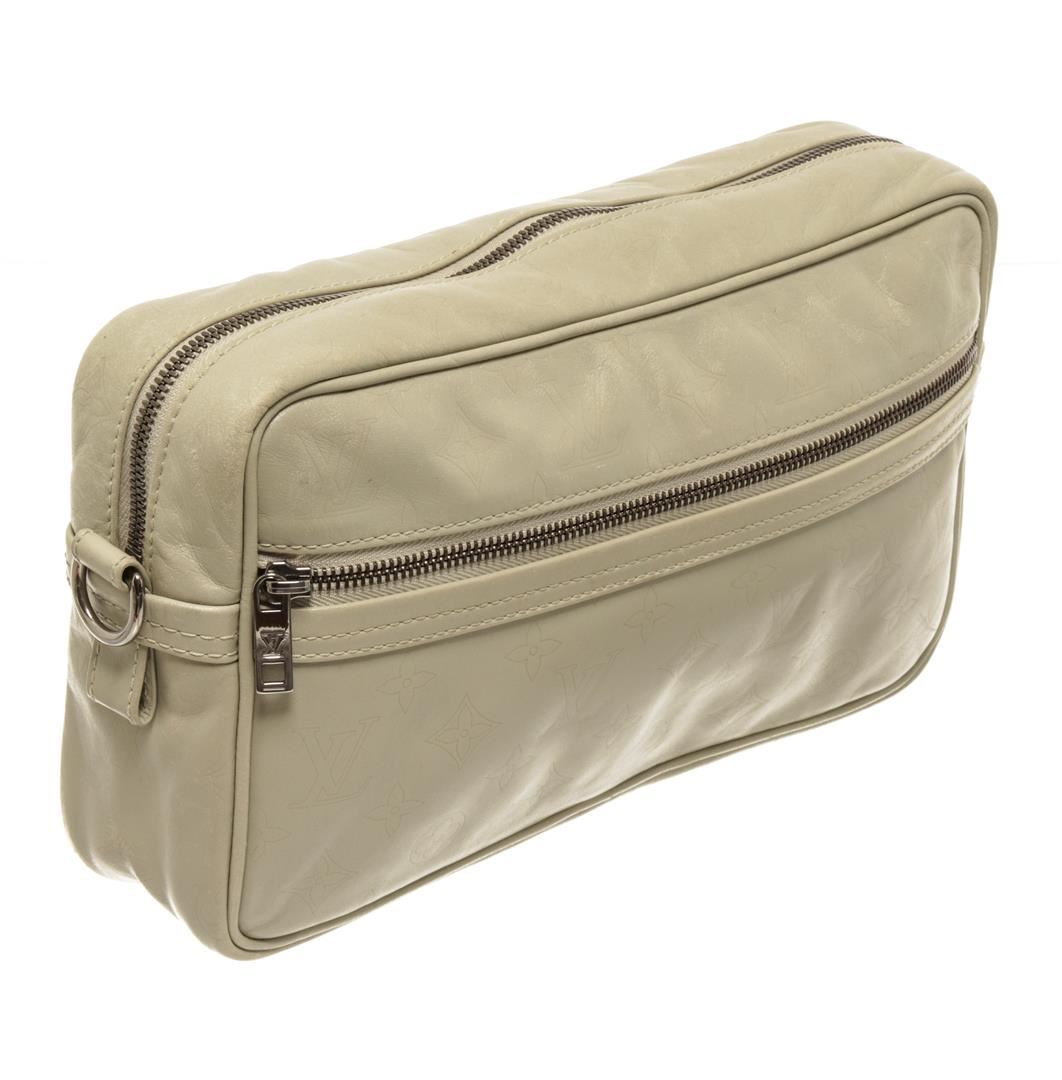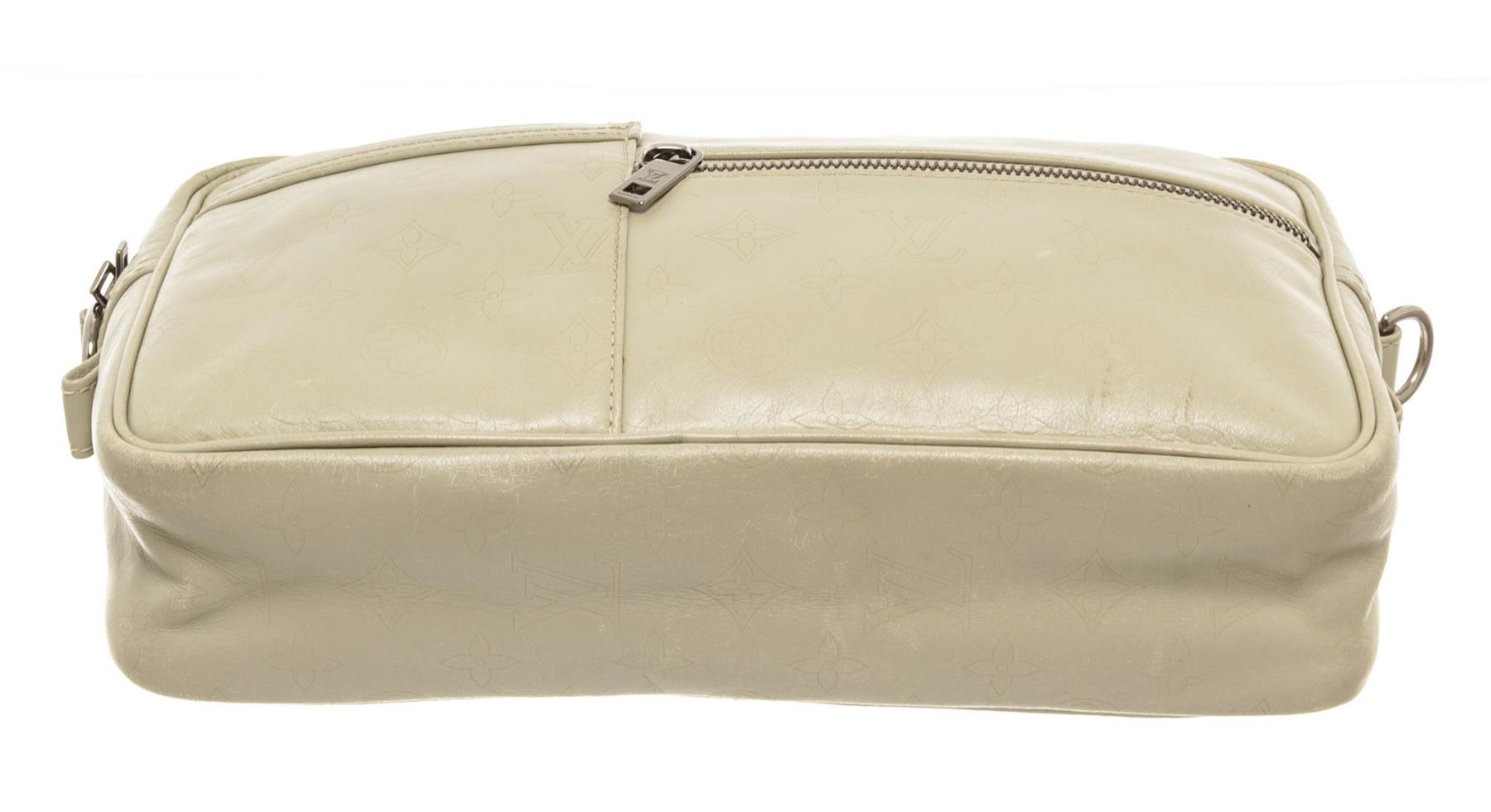One Louis Vuitton White Monogram Defile Leather Irvington Shoulder Bag. Item is sold AS-IS. All available information is listed in the description and shown in the photo. Louis Vuitton White Monogram Defile Leather Irvington Shoulder Bag with silver-tone hardware, two exterior pockets with zip closure and slip pocket, white suede lining, two interior slip pockets, with adjustable white shoulder strap, and zip closure.