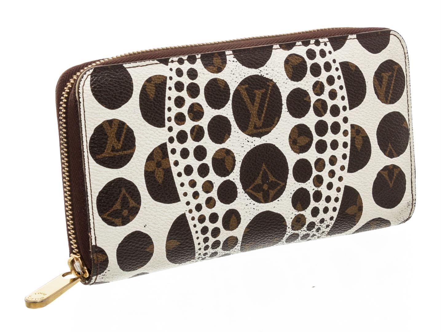 White and multicolor monogram with pumpkin dot print coated canvas Louis Vuitton Pumpkin Dots Zippy wallet with brass hardware, brown textured leather lining, five interior compartments; one with zip closure, dual bill pockets, eight card slots and zip-around closure. Authentic.