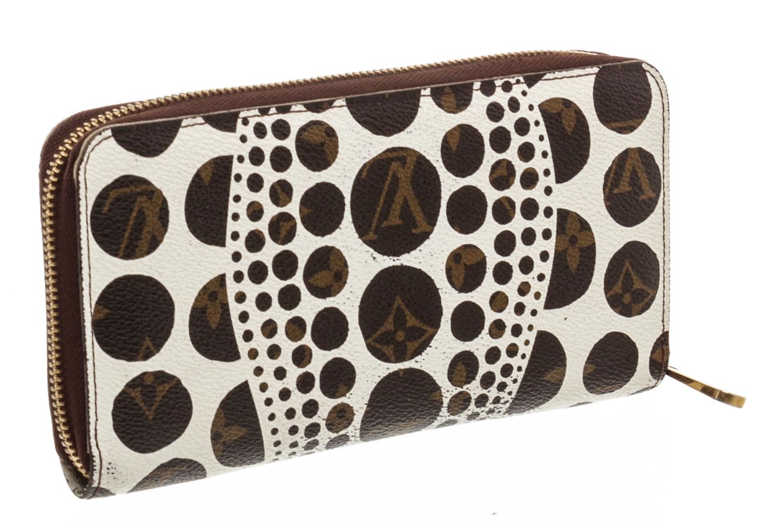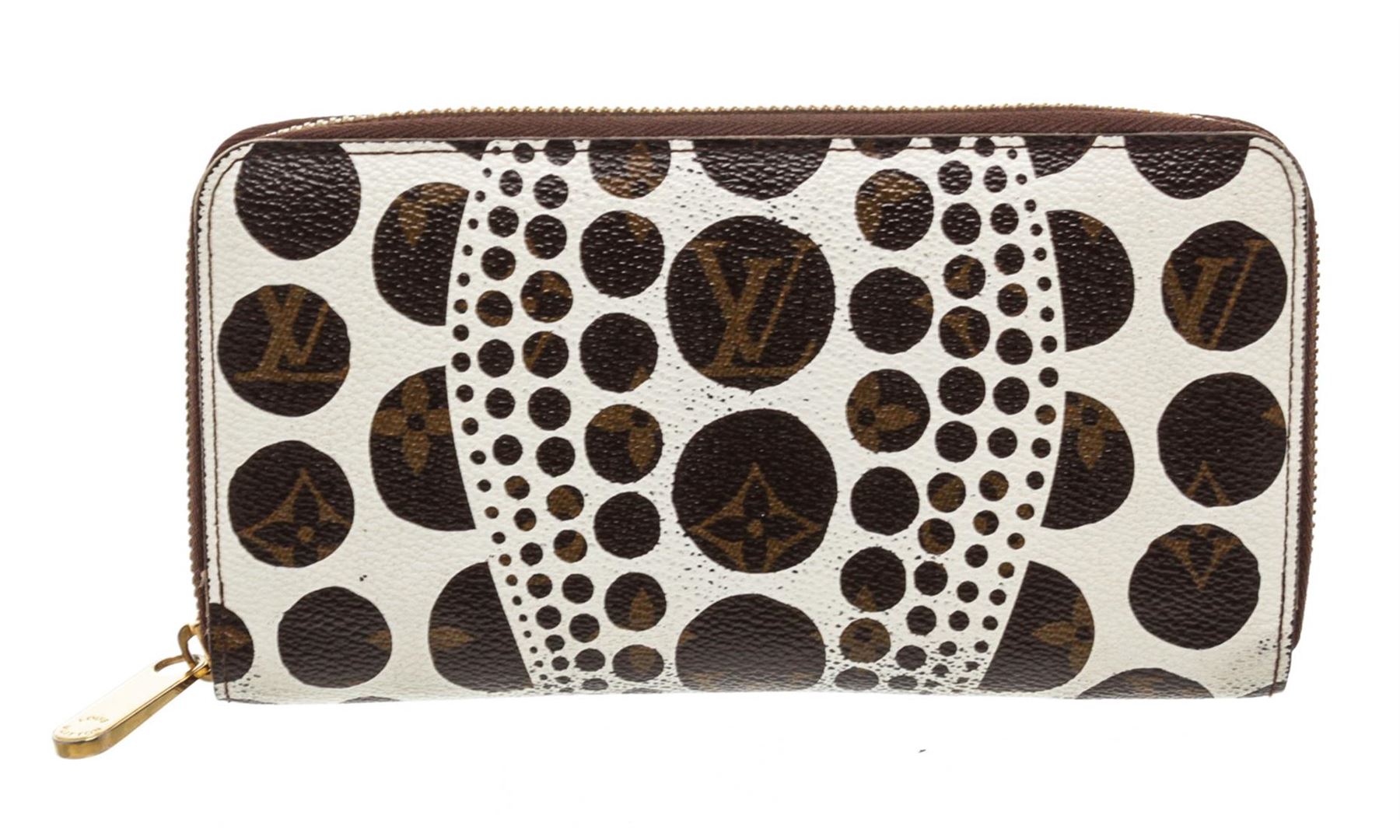 White and multicolor monogram with pumpkin dot print coated canvas Louis Vuitton Pumpkin Dots Zippy wallet with brass hardware, brown textured leather lining, five interior compartments; one with zip closure, dual bill pockets, eight card slots and zip-around closure. Authentic.