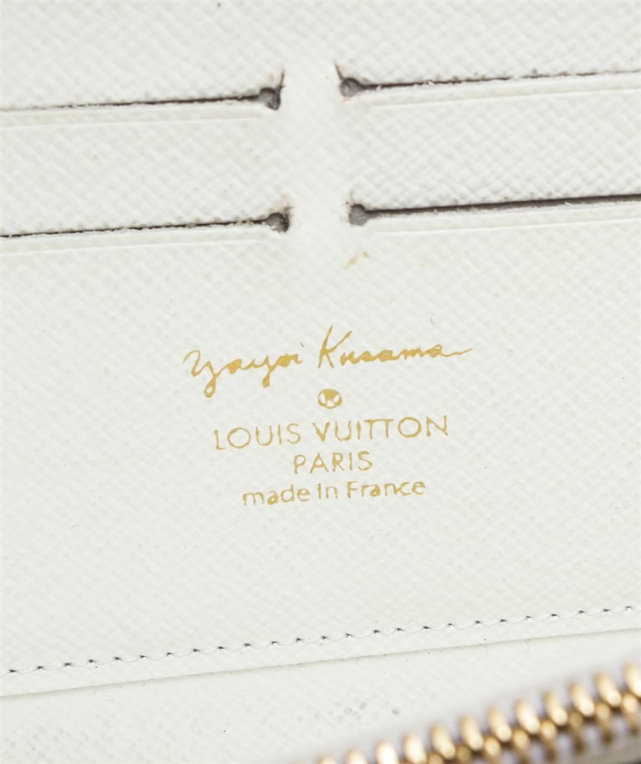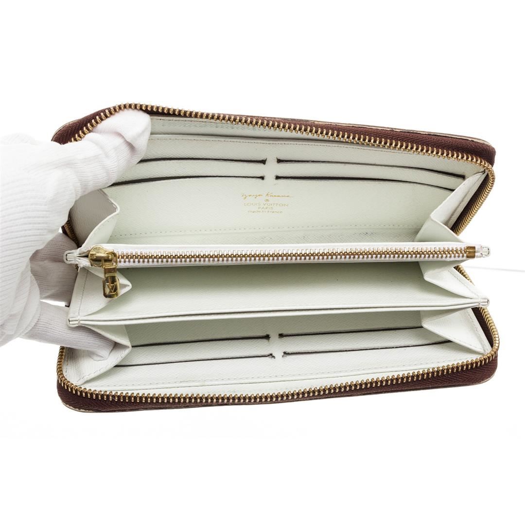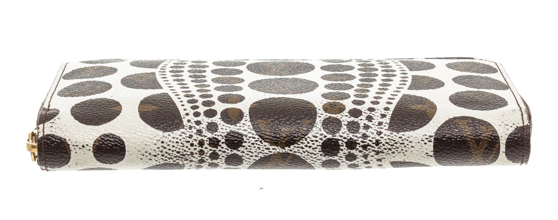 White and multicolor monogram with pumpkin dot print coated canvas Louis Vuitton Pumpkin Dots Zippy wallet with brass hardware, brown textured leather lining, five interior compartments; one with zip closure, dual bill pockets, eight card slots and zip-around closure. Authentic.